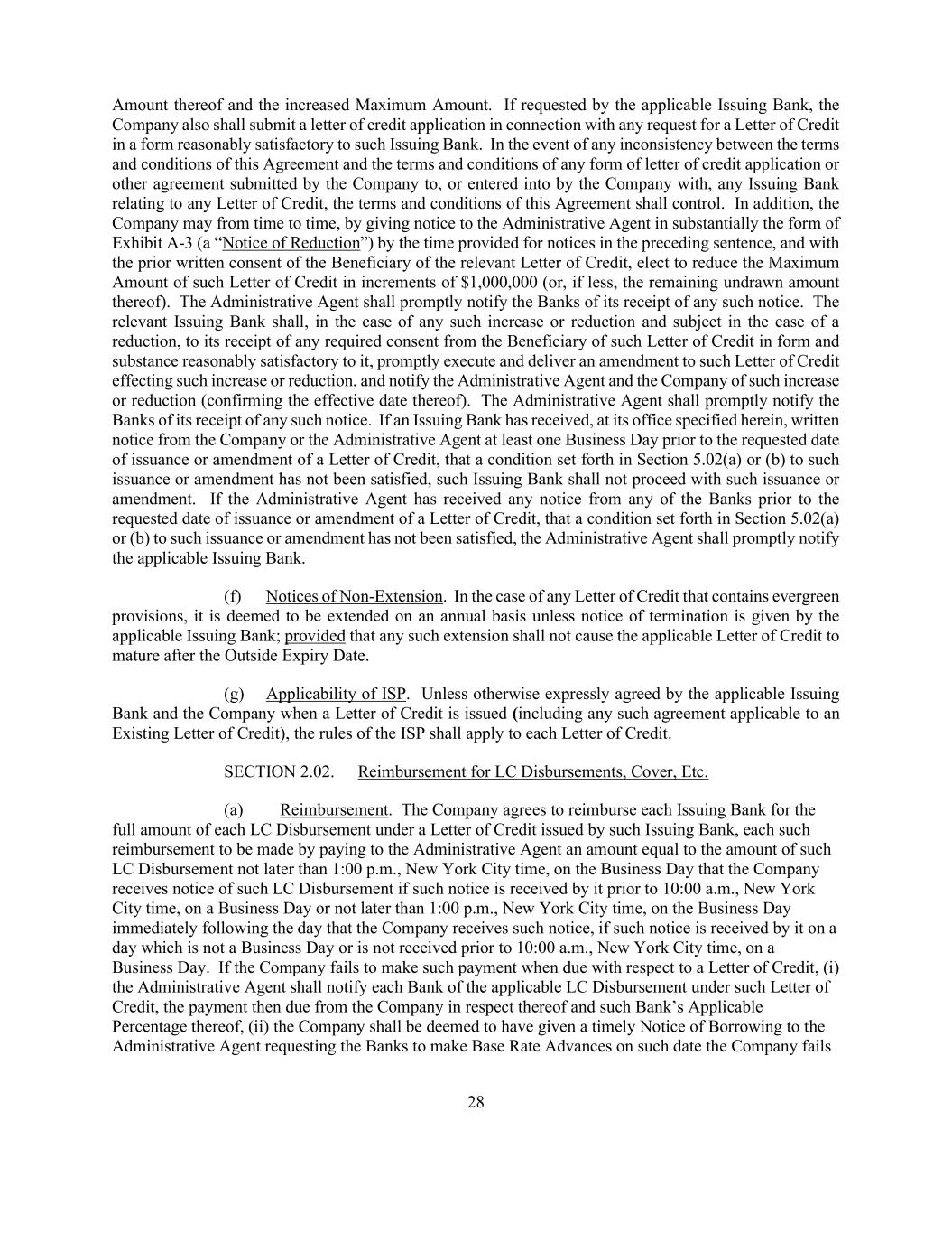 28 Amount thereof and the increased Maximum Amount. If requested by the applicable Issuing Bank, the Company also shall submit a letter of credit application in connection with any request for a Letter of Credit in a form reasonably satisfactory to such Issuing Bank. In the event of any inconsistency between the terms and conditions of this Agreement and the terms and conditions of any form of letter of credit application or other agreement submitted by the Company to, or entered into by the Company with, any Issuing Bank relating to any Letter of Credit, the terms and conditions of this Agreement shall control. In addition, the Company may from time to time, by giving notice to the Administrative Agent in substantially the form of Exhibit A-3 (a “Notice of Reduction”) by the time provided for notices in the preceding sentence, and with the prior written consent of the Beneficiary of the relevant Letter of Credit, elect to reduce the Maximum Amount of such Letter of Credit in increments of $1,000,000 (or, if less, the remaining undrawn amount thereof). The Administrative Agent shall promptly notify the Banks of its receipt of any such notice. The relevant Issuing Bank shall, in the case of any such increase or reduction and subject in the case of a reduction, to its receipt of any required consent from the Beneficiary of such Letter of Credit in form and substance reasonably satisfactory to it, promptly execute and deliver an amendment to such Letter of Credit effecting such increase or reduction, and notify the Administrative Agent and the Company of such increase or reduction (confirming the effective date thereof). The Administrative Agent shall promptly notify the Banks of its receipt of any such notice. If an Issuing Bank has received, at its office specified herein, written notice from the Company or the Administrative Agent at least one Business Day prior to the requested date of issuance or amendment of a Letter of Credit, that a condition set forth in Section 5.02(a) or (b) to such issuance or amendment has not been satisfied, such Issuing Bank shall not proceed with such issuance or amendment. If the Administrative Agent has received any notice from any of the Banks prior to the requested date of issuance or amendment of a Letter of Credit, that a condition set forth in Section 5.02(a) or (b) to such issuance or amendment has not been satisfied, the Administrative Agent shall promptly notify the applicable Issuing Bank. (f) Notices of Non-Extension. In the case of any Letter of Credit that contains evergreen provisions, it is deemed to be extended on an annual basis unless notice of termination is given by the applicable Issuing Bank; provided that any such extension shall not cause the applicable Letter of Credit to mature after the Outside Expiry Date. (g) Applicability of ISP. Unless otherwise expressly agreed by the applicable Issuing Bank and the Company when a Letter of Credit is issued (including any such agreement applicable to an Existing Letter of Credit), the rules of the ISP shall apply to each Letter of Credit. SECTION 2.02. Reimbursement for LC Disbursements, Cover, Etc. (a) Reimbursement. The Company agrees to reimburse each Issuing Bank for the full amount of each LC Disbursement under a Letter of Credit issued by such Issuing Bank, each such reimbursement to be made by paying to the Administrative Agent an amount equal to the amount of such LC Disbursement not later than 1:00 p.m., New York City time, on the Business Day that the Company receives notice of such LC Disbursement if such notice is received by it prior to 10:00 a.m., New York City time, on a Business Day or not later than 1:00 p.m., New York City time, on the Business Day immediately following the day that the Company receives such notice, if such notice is received by it on a day which is not a Business Day or is not received prior to 10:00 a.m., New York City time, on a Business Day. If the Company fails to make such payment when due with respect to a Letter of Credit, (i) the Administrative Agent shall notify each Bank of the applicable LC Disbursement under such Letter of Credit, the payment then due from the Company in respect thereof and such Bank’s Applicable Percentage thereof, (ii) the Company shall be deemed to have given a timely Notice of Borrowing to the Administrative Agent requesting the Banks to make Base Rate Advances on such date the Company fails