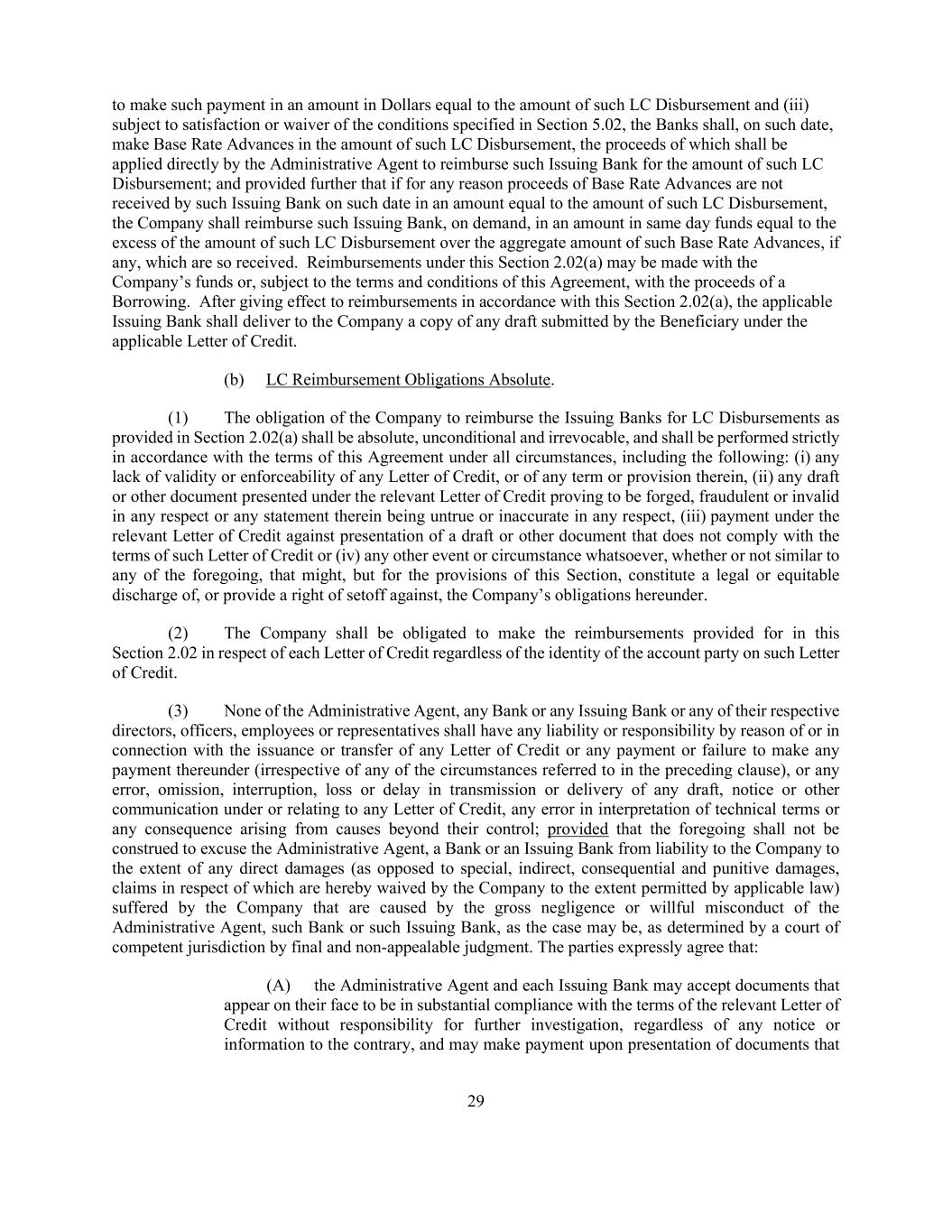 29 to make such payment in an amount in Dollars equal to the amount of such LC Disbursement and (iii) subject to satisfaction or waiver of the conditions specified in Section 5.02, the Banks shall, on such date, make Base Rate Advances in the amount of such LC Disbursement, the proceeds of which shall be applied directly by the Administrative Agent to reimburse such Issuing Bank for the amount of such LC Disbursement; and provided further that if for any reason proceeds of Base Rate Advances are not received by such Issuing Bank on such date in an amount equal to the amount of such LC Disbursement, the Company shall reimburse such Issuing Bank, on demand, in an amount in same day funds equal to the excess of the amount of such LC Disbursement over the aggregate amount of such Base Rate Advances, if any, which are so received. Reimbursements under this Section 2.02(a) may be made with the Company’s funds or, subject to the terms and conditions of this Agreement, with the proceeds of a Borrowing. After giving effect to reimbursements in accordance with this Section 2.02(a), the applicable Issuing Bank shall deliver to the Company a copy of any draft submitted by the Beneficiary under the applicable Letter of Credit. (b) LC Reimbursement Obligations Absolute. (1) The obligation of the Company to reimburse the Issuing Banks for LC Disbursements as provided in Section 2.02(a) shall be absolute, unconditional and irrevocable, and shall be performed strictly in accordance with the terms of this Agreement under all circumstances, including the following: (i) any lack of validity or enforceability of any Letter of Credit, or of any term or provision therein, (ii) any draft or other document presented under the relevant Letter of Credit proving to be forged, fraudulent or invalid in any respect or any statement therein being untrue or inaccurate in any respect, (iii) payment under the relevant Letter of Credit against presentation of a draft or other document that does not comply with the terms of such Letter of Credit or (iv) any other event or circumstance whatsoever, whether or not similar to any of the foregoing, that might, but for the provisions of this Section, constitute a legal or equitable discharge of, or provide a right of setoff against, the Company’s obligations hereunder. (2) The Company shall be obligated to make the reimbursements provided for in this Section 2.02 in respect of each Letter of Credit regardless of the identity of the account party on such Letter of Credit. (3) None of the Administrative Agent, any Bank or any Issuing Bank or any of their respective directors, officers, employees or representatives shall have any liability or responsibility by reason of or in connection with the issuance or transfer of any Letter of Credit or any payment or failure to make any payment thereunder (irrespective of any of the circumstances referred to in the preceding clause), or any error, omission, interruption, loss or delay in transmission or delivery of any draft, notice or other communication under or relating to any Letter of Credit, any error in interpretation of technical terms or any consequence arising from causes beyond their control; provided that the foregoing shall not be construed to excuse the Administrative Agent, a Bank or an Issuing Bank from liability to the Company to the extent of any direct damages (as opposed to special, indirect, consequential and punitive damages, claims in respect of which are hereby waived by the Company to the extent permitted by applicable law) suffered by the Company that are caused by the gross negligence or willful misconduct of the Administrative Agent, such Bank or such Issuing Bank, as the case may be, as determined by a court of competent jurisdiction by final and non-appealable judgment. The parties expressly agree that: (A) the Administrative Agent and each Issuing Bank may accept documents that appear on their face to be in substantial compliance with the terms of the relevant Letter of Credit without responsibility for further investigation, regardless of any notice or information to the contrary, and may make payment upon presentation of documents that