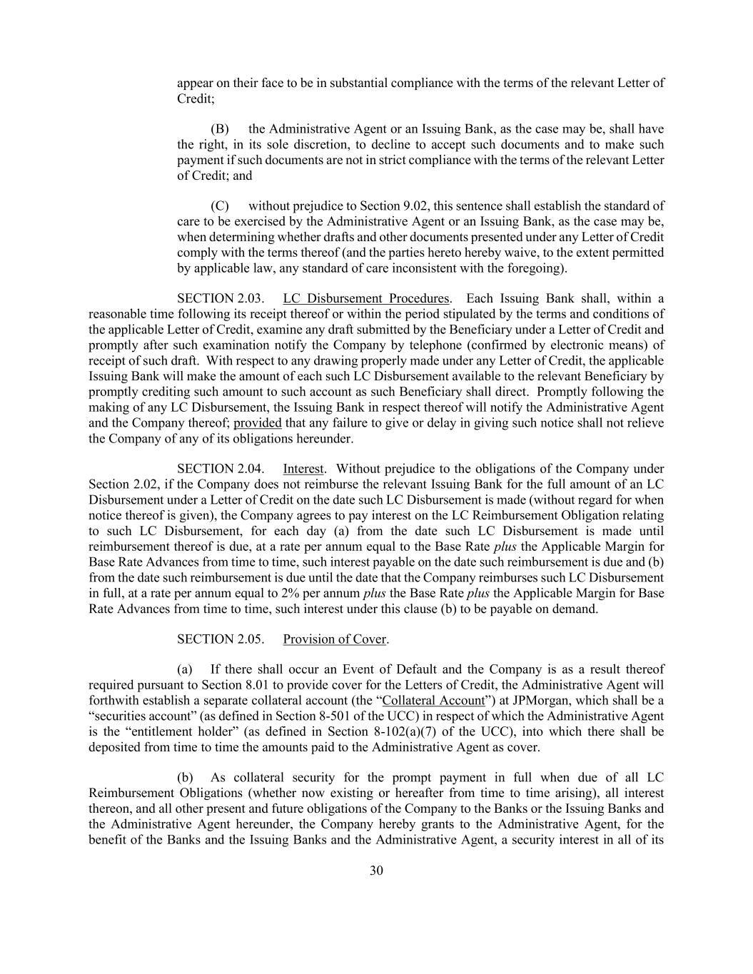30 appear on their face to be in substantial compliance with the terms of the relevant Letter of Credit; (B) the Administrative Agent or an Issuing Bank, as the case may be, shall have the right, in its sole discretion, to decline to accept such documents and to make such payment if such documents are not in strict compliance with the terms of the relevant Letter of Credit; and (C) without prejudice to Section 9.02, this sentence shall establish the standard of care to be exercised by the Administrative Agent or an Issuing Bank, as the case may be, when determining whether drafts and other documents presented under any Letter of Credit comply with the terms thereof (and the parties hereto hereby waive, to the extent permitted by applicable law, any standard of care inconsistent with the foregoing). SECTION 2.03. LC Disbursement Procedures. Each Issuing Bank shall, within a reasonable time following its receipt thereof or within the period stipulated by the terms and conditions of the applicable Letter of Credit, examine any draft submitted by the Beneficiary under a Letter of Credit and promptly after such examination notify the Company by telephone (confirmed by electronic means) of receipt of such draft. With respect to any drawing properly made under any Letter of Credit, the applicable Issuing Bank will make the amount of each such LC Disbursement available to the relevant Beneficiary by promptly crediting such amount to such account as such Beneficiary shall direct. Promptly following the making of any LC Disbursement, the Issuing Bank in respect thereof will notify the Administrative Agent and the Company thereof; provided that any failure to give or delay in giving such notice shall not relieve the Company of any of its obligations hereunder. SECTION 2.04. Interest. Without prejudice to the obligations of the Company under Section 2.02, if the Company does not reimburse the relevant Issuing Bank for the full amount of an LC Disbursement under a Letter of Credit on the date such LC Disbursement is made (without regard for when notice thereof is given), the Company agrees to pay interest on the LC Reimbursement Obligation relating to such LC Disbursement, for each day (a) from the date such LC Disbursement is made until reimbursement thereof is due, at a rate per annum equal to the Base Rate plus the Applicable Margin for Base Rate Advances from time to time, such interest payable on the date such reimbursement is due and (b) from the date such reimbursement is due until the date that the Company reimburses such LC Disbursement in full, at a rate per annum equal to 2% per annum plus the Base Rate plus the Applicable Margin for Base Rate Advances from time to time, such interest under this clause (b) to be payable on demand. SECTION 2.05. Provision of Cover. (a) If there shall occur an Event of Default and the Company is as a result thereof required pursuant to Section 8.01 to provide cover for the Letters of Credit, the Administrative Agent will forthwith establish a separate collateral account (the “Collateral Account”) at JPMorgan, which shall be a “securities account” (as defined in Section 8-501 of the UCC) in respect of which the Administrative Agent is the “entitlement holder” (as defined in Section 8-102(a)(7) of the UCC), into which there shall be deposited from time to time the amounts paid to the Administrative Agent as cover. (b) As collateral security for the prompt payment in full when due of all LC Reimbursement Obligations (whether now existing or hereafter from time to time arising), all interest thereon, and all other present and future obligations of the Company to the Banks or the Issuing Banks and the Administrative Agent hereunder, the Company hereby grants to the Administrative Agent, for the benefit of the Banks and the Issuing Banks and the Administrative Agent, a security interest in all of its