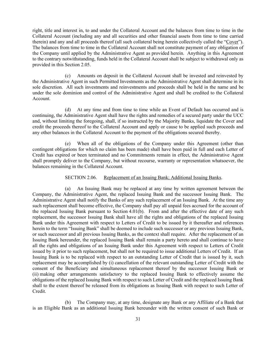 31 right, title and interest in, to and under the Collateral Account and the balances from time to time in the Collateral Account (including any and all securities and other financial assets from time to time carried therein) and any and all proceeds thereof (all such collateral being herein collectively called the “Cover”). The balances from time to time in the Collateral Account shall not constitute payment of any obligation of the Company until applied by the Administrative Agent as provided herein. Anything in this Agreement to the contrary notwithstanding, funds held in the Collateral Account shall be subject to withdrawal only as provided in this Section 2.05. (c) Amounts on deposit in the Collateral Account shall be invested and reinvested by the Administrative Agent in such Permitted Investments as the Administrative Agent shall determine in its sole discretion. All such investments and reinvestments and proceeds shall be held in the name and be under the sole dominion and control of the Administrative Agent and shall be credited to the Collateral Account. (d) At any time and from time to time while an Event of Default has occurred and is continuing, the Administrative Agent shall have the rights and remedies of a secured party under the UCC and, without limiting the foregoing, shall, if so instructed by the Majority Banks, liquidate the Cover and credit the proceeds thereof to the Collateral Account and apply or cause to be applied such proceeds and any other balances in the Collateral Account to the payment of the obligations secured thereby. (e) When all of the obligations of the Company under this Agreement (other than contingent obligations for which no claim has been made) shall have been paid in full and each Letter of Credit has expired or been terminated and no Commitments remain in effect, the Administrative Agent shall promptly deliver to the Company, but without recourse, warranty or representation whatsoever, the balances remaining in the Collateral Account. SECTION 2.06. Replacement of an Issuing Bank; Additional Issuing Banks. (a) An Issuing Bank may be replaced at any time by written agreement between the Company, the Administrative Agent, the replaced Issuing Bank and the successor Issuing Bank. The Administrative Agent shall notify the Banks of any such replacement of an Issuing Bank. At the time any such replacement shall become effective, the Company shall pay all unpaid fees accrued for the account of the replaced Issuing Bank pursuant to Section 4.01(b). From and after the effective date of any such replacement, the successor Issuing Bank shall have all the rights and obligations of the replaced Issuing Bank under this Agreement with respect to Letters of Credit to be issued by it thereafter and references herein to the term “Issuing Bank” shall be deemed to include such successor or any previous Issuing Bank, or such successor and all previous Issuing Banks, as the context shall require. After the replacement of an Issuing Bank hereunder, the replaced Issuing Bank shall remain a party hereto and shall continue to have all the rights and obligations of an Issuing Bank under this Agreement with respect to Letters of Credit issued by it prior to such replacement, but shall not be required to issue additional Letters of Credit. If an Issuing Bank is to be replaced with respect to an outstanding Letter of Credit that is issued by it, such replacement may be accomplished by (i) cancellation of the relevant outstanding Letter of Credit with the consent of the Beneficiary and simultaneous replacement thereof by the successor Issuing Bank or (ii) making other arrangements satisfactory to the replaced Issuing Bank to effectively assume the obligations of the replaced Issuing Bank with respect to such Letter of Credit and the replaced Issuing Bank shall to the extent thereof be released from its obligations as Issuing Bank with respect to such Letter of Credit. (b) The Company may, at any time, designate any Bank or any Affiliate of a Bank that is an Eligible Bank as an additional Issuing Bank hereunder with the written consent of such Bank or