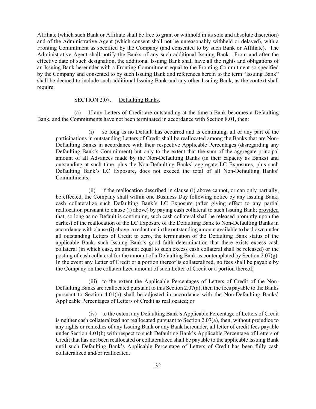 32 Affiliate (which such Bank or Affiliate shall be free to grant or withhold in its sole and absolute discretion) and of the Administrative Agent (which consent shall not be unreasonably withheld or delayed), with a Fronting Commitment as specified by the Company (and consented to by such Bank or Affiliate). The Administrative Agent shall notify the Banks of any such additional Issuing Bank. From and after the effective date of such designation, the additional Issuing Bank shall have all the rights and obligations of an Issuing Bank hereunder with a Fronting Commitment equal to the Fronting Commitment so specified by the Company and consented to by such Issuing Bank and references herein to the term “Issuing Bank” shall be deemed to include such additional Issuing Bank and any other Issuing Bank, as the context shall require. SECTION 2.07. Defaulting Banks. (a) If any Letters of Credit are outstanding at the time a Bank becomes a Defaulting Bank, and the Commitments have not been terminated in accordance with Section 8.01, then: (i) so long as no Default has occurred and is continuing, all or any part of the participations in outstanding Letters of Credit shall be reallocated among the Banks that are Non- Defaulting Banks in accordance with their respective Applicable Percentages (disregarding any Defaulting Bank’s Commitment) but only to the extent that the sum of the aggregate principal amount of all Advances made by the Non-Defaulting Banks (in their capacity as Banks) and outstanding at such time, plus the Non-Defaulting Banks’ aggregate LC Exposures, plus such Defaulting Bank’s LC Exposure, does not exceed the total of all Non-Defaulting Banks’ Commitments; (ii) if the reallocation described in clause (i) above cannot, or can only partially, be effected, the Company shall within one Business Day following notice by any Issuing Bank, cash collateralize such Defaulting Bank’s LC Exposure (after giving effect to any partial reallocation pursuant to clause (i) above) by paying cash collateral to such Issuing Bank; provided that, so long as no Default is continuing, such cash collateral shall be released promptly upon the earliest of the reallocation of the LC Exposure of the Defaulting Bank to Non-Defaulting Banks in accordance with clause (i) above, a reduction in the outstanding amount available to be drawn under all outstanding Letters of Credit to zero, the termination of the Defaulting Bank status of the applicable Bank, such Issuing Bank’s good faith determination that there exists excess cash collateral (in which case, an amount equal to such excess cash collateral shall be released) or the posting of cash collateral for the amount of a Defaulting Bank as contemplated by Section 2.07(g). In the event any Letter of Credit or a portion thereof is collateralized, no fees shall be payable by the Company on the collateralized amount of such Letter of Credit or a portion thereof; (iii) to the extent the Applicable Percentages of Letters of Credit of the Non- Defaulting Banks are reallocated pursuant to this Section 2.07(a), then the fees payable to the Banks pursuant to Section 4.01(b) shall be adjusted in accordance with the Non-Defaulting Banks’ Applicable Percentages of Letters of Credit as reallocated; or (iv) to the extent any Defaulting Bank’s Applicable Percentage of Letters of Credit is neither cash collateralized nor reallocated pursuant to Section 2.07(a), then, without prejudice to any rights or remedies of any Issuing Bank or any Bank hereunder, all letter of credit fees payable under Section 4.01(b) with respect to such Defaulting Bank’s Applicable Percentage of Letters of Credit that has not been reallocated or collateralized shall be payable to the applicable Issuing Bank until such Defaulting Bank’s Applicable Percentage of Letters of Credit has been fully cash collateralized and/or reallocated.