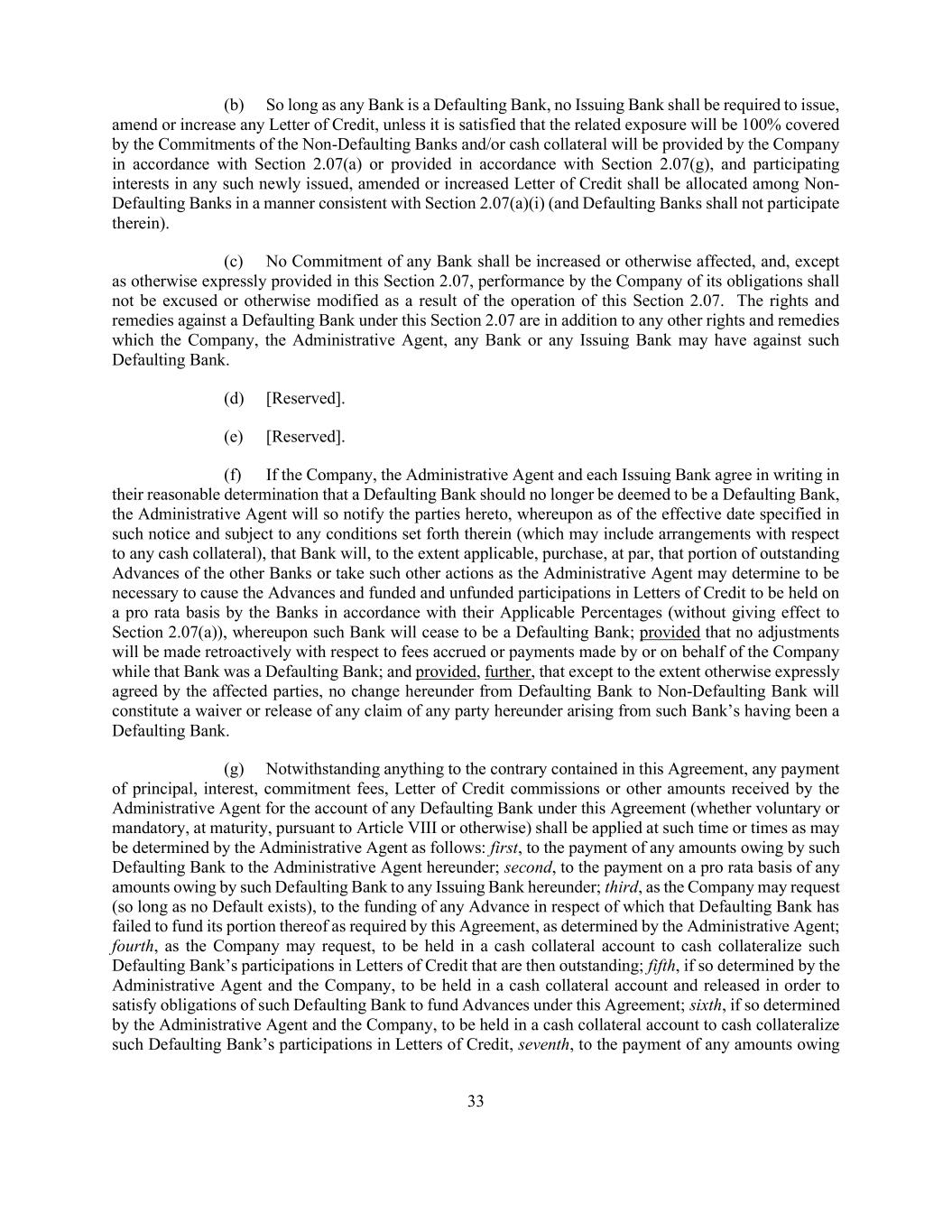 33 (b) So long as any Bank is a Defaulting Bank, no Issuing Bank shall be required to issue, amend or increase any Letter of Credit, unless it is satisfied that the related exposure will be 100% covered by the Commitments of the Non-Defaulting Banks and/or cash collateral will be provided by the Company in accordance with Section 2.07(a) or provided in accordance with Section 2.07(g), and participating interests in any such newly issued, amended or increased Letter of Credit shall be allocated among Non- Defaulting Banks in a manner consistent with Section 2.07(a)(i) (and Defaulting Banks shall not participate therein). (c) No Commitment of any Bank shall be increased or otherwise affected, and, except as otherwise expressly provided in this Section 2.07, performance by the Company of its obligations shall not be excused or otherwise modified as a result of the operation of this Section 2.07. The rights and remedies against a Defaulting Bank under this Section 2.07 are in addition to any other rights and remedies which the Company, the Administrative Agent, any Bank or any Issuing Bank may have against such Defaulting Bank. (d) [Reserved]. (e) [Reserved]. (f) If the Company, the Administrative Agent and each Issuing Bank agree in writing in their reasonable determination that a Defaulting Bank should no longer be deemed to be a Defaulting Bank, the Administrative Agent will so notify the parties hereto, whereupon as of the effective date specified in such notice and subject to any conditions set forth therein (which may include arrangements with respect to any cash collateral), that Bank will, to the extent applicable, purchase, at par, that portion of outstanding Advances of the other Banks or take such other actions as the Administrative Agent may determine to be necessary to cause the Advances and funded and unfunded participations in Letters of Credit to be held on a pro rata basis by the Banks in accordance with their Applicable Percentages (without giving effect to Section 2.07(a)), whereupon such Bank will cease to be a Defaulting Bank; provided that no adjustments will be made retroactively with respect to fees accrued or payments made by or on behalf of the Company while that Bank was a Defaulting Bank; and provided, further, that except to the extent otherwise expressly agreed by the affected parties, no change hereunder from Defaulting Bank to Non-Defaulting Bank will constitute a waiver or release of any claim of any party hereunder arising from such Bank’s having been a Defaulting Bank. (g) Notwithstanding anything to the contrary contained in this Agreement, any payment of principal, interest, commitment fees, Letter of Credit commissions or other amounts received by the Administrative Agent for the account of any Defaulting Bank under this Agreement (whether voluntary or mandatory, at maturity, pursuant to Article VIII or otherwise) shall be applied at such time or times as may be determined by the Administrative Agent as follows: first, to the payment of any amounts owing by such Defaulting Bank to the Administrative Agent hereunder; second, to the payment on a pro rata basis of any amounts owing by such Defaulting Bank to any Issuing Bank hereunder; third, as the Company may request (so long as no Default exists), to the funding of any Advance in respect of which that Defaulting Bank has failed to fund its portion thereof as required by this Agreement, as determined by the Administrative Agent; fourth, as the Company may request, to be held in a cash collateral account to cash collateralize such Defaulting Bank’s participations in Letters of Credit that are then outstanding; fifth, if so determined by the Administrative Agent and the Company, to be held in a cash collateral account and released in order to satisfy obligations of such Defaulting Bank to fund Advances under this Agreement; sixth, if so determined by the Administrative Agent and the Company, to be held in a cash collateral account to cash collateralize such Defaulting Bank’s participations in Letters of Credit, seventh, to the payment of any amounts owing