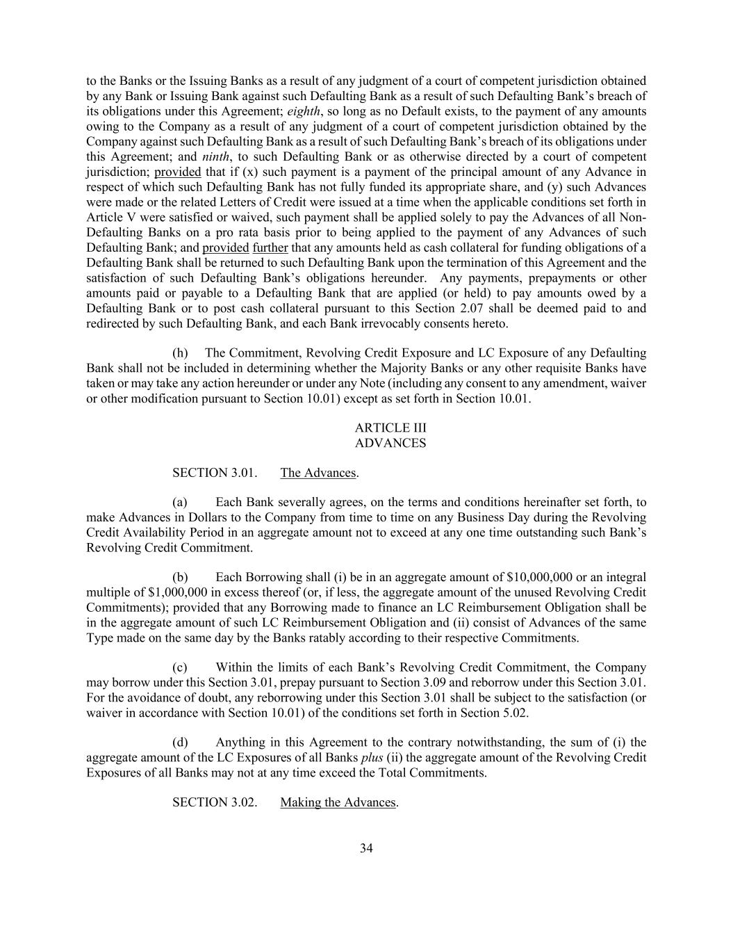 34 to the Banks or the Issuing Banks as a result of any judgment of a court of competent jurisdiction obtained by any Bank or Issuing Bank against such Defaulting Bank as a result of such Defaulting Bank’s breach of its obligations under this Agreement; eighth, so long as no Default exists, to the payment of any amounts owing to the Company as a result of any judgment of a court of competent jurisdiction obtained by the Company against such Defaulting Bank as a result of such Defaulting Bank’s breach of its obligations under this Agreement; and ninth, to such Defaulting Bank or as otherwise directed by a court of competent jurisdiction; provided that if (x) such payment is a payment of the principal amount of any Advance in respect of which such Defaulting Bank has not fully funded its appropriate share, and (y) such Advances were made or the related Letters of Credit were issued at a time when the applicable conditions set forth in Article V were satisfied or waived, such payment shall be applied solely to pay the Advances of all Non- Defaulting Banks on a pro rata basis prior to being applied to the payment of any Advances of such Defaulting Bank; and provided further that any amounts held as cash collateral for funding obligations of a Defaulting Bank shall be returned to such Defaulting Bank upon the termination of this Agreement and the satisfaction of such Defaulting Bank’s obligations hereunder. Any payments, prepayments or other amounts paid or payable to a Defaulting Bank that are applied (or held) to pay amounts owed by a Defaulting Bank or to post cash collateral pursuant to this Section 2.07 shall be deemed paid to and redirected by such Defaulting Bank, and each Bank irrevocably consents hereto. (h) The Commitment, Revolving Credit Exposure and LC Exposure of any Defaulting Bank shall not be included in determining whether the Majority Banks or any other requisite Banks have taken or may take any action hereunder or under any Note (including any consent to any amendment, waiver or other modification pursuant to Section 10.01) except as set forth in Section 10.01. ARTICLE III ADVANCES SECTION 3.01. The Advances. (a) Each Bank severally agrees, on the terms and conditions hereinafter set forth, to make Advances in Dollars to the Company from time to time on any Business Day during the Revolving Credit Availability Period in an aggregate amount not to exceed at any one time outstanding such Bank’s Revolving Credit Commitment. (b) Each Borrowing shall (i) be in an aggregate amount of $10,000,000 or an integral multiple of $1,000,000 in excess thereof (or, if less, the aggregate amount of the unused Revolving Credit Commitments); provided that any Borrowing made to finance an LC Reimbursement Obligation shall be in the aggregate amount of such LC Reimbursement Obligation and (ii) consist of Advances of the same Type made on the same day by the Banks ratably according to their respective Commitments. (c) Within the limits of each Bank’s Revolving Credit Commitment, the Company may borrow under this Section 3.01, prepay pursuant to Section 3.09 and reborrow under this Section 3.01. For the avoidance of doubt, any reborrowing under this Section 3.01 shall be subject to the satisfaction (or waiver in accordance with Section 10.01) of the conditions set forth in Section 5.02. (d) Anything in this Agreement to the contrary notwithstanding, the sum of (i) the aggregate amount of the LC Exposures of all Banks plus (ii) the aggregate amount of the Revolving Credit Exposures of all Banks may not at any time exceed the Total Commitments. SECTION 3.02. Making the Advances.