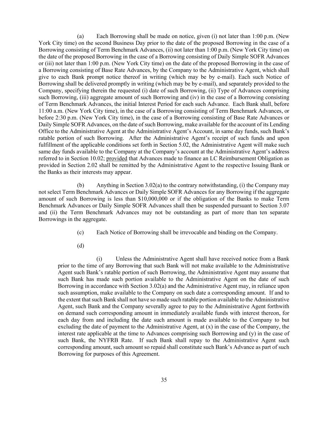 35 (a) Each Borrowing shall be made on notice, given (i) not later than 1:00 p.m. (New York City time) on the second Business Day prior to the date of the proposed Borrowing in the case of a Borrowing consisting of Term Benchmark Advances, (ii) not later than 1:00 p.m. (New York City time) on the date of the proposed Borrowing in the case of a Borrowing consisting of Daily Simple SOFR Advances or (iii) not later than 1:00 p.m. (New York City time) on the date of the proposed Borrowing in the case of a Borrowing consisting of Base Rate Advances, by the Company to the Administrative Agent, which shall give to each Bank prompt notice thereof in writing (which may be by e-mail). Each such Notice of Borrowing shall be delivered promptly in writing (which may be by e-mail), and separately provided to the Company, specifying therein the requested (i) date of such Borrowing, (ii) Type of Advances comprising such Borrowing, (iii) aggregate amount of such Borrowing and (iv) in the case of a Borrowing consisting of Term Benchmark Advances, the initial Interest Period for each such Advance. Each Bank shall, before 11:00 a.m. (New York City time), in the case of a Borrowing consisting of Term Benchmark Advances, or before 2:30 p.m. (New York City time), in the case of a Borrowing consisting of Base Rate Advances or Daily Simple SOFR Advances, on the date of such Borrowing, make available for the account of its Lending Office to the Administrative Agent at the Administrative Agent’s Account, in same day funds, such Bank’s ratable portion of such Borrowing. After the Administrative Agent’s receipt of such funds and upon fulfillment of the applicable conditions set forth in Section 5.02, the Administrative Agent will make such same day funds available to the Company at the Company’s account at the Administrative Agent’s address referred to in Section 10.02; provided that Advances made to finance an LC Reimbursement Obligation as provided in Section 2.02 shall be remitted by the Administrative Agent to the respective Issuing Bank or the Banks as their interests may appear. (b) Anything in Section 3.02(a) to the contrary notwithstanding, (i) the Company may not select Term Benchmark Advances or Daily Simple SOFR Advances for any Borrowing if the aggregate amount of such Borrowing is less than $10,000,000 or if the obligation of the Banks to make Term Benchmark Advances or Daily Simple SOFR Advances shall then be suspended pursuant to Section 3.07 and (ii) the Term Benchmark Advances may not be outstanding as part of more than ten separate Borrowings in the aggregate. (c) Each Notice of Borrowing shall be irrevocable and binding on the Company. (d) (i) Unless the Administrative Agent shall have received notice from a Bank prior to the time of any Borrowing that such Bank will not make available to the Administrative Agent such Bank’s ratable portion of such Borrowing, the Administrative Agent may assume that such Bank has made such portion available to the Administrative Agent on the date of such Borrowing in accordance with Section 3.02(a) and the Administrative Agent may, in reliance upon such assumption, make available to the Company on such date a corresponding amount. If and to the extent that such Bank shall not have so made such ratable portion available to the Administrative Agent, such Bank and the Company severally agree to pay to the Administrative Agent forthwith on demand such corresponding amount in immediately available funds with interest thereon, for each day from and including the date such amount is made available to the Company to but excluding the date of payment to the Administrative Agent, at (x) in the case of the Company, the interest rate applicable at the time to Advances comprising such Borrowing and (y) in the case of such Bank, the NYFRB Rate. If such Bank shall repay to the Administrative Agent such corresponding amount, such amount so repaid shall constitute such Bank’s Advance as part of such Borrowing for purposes of this Agreement.