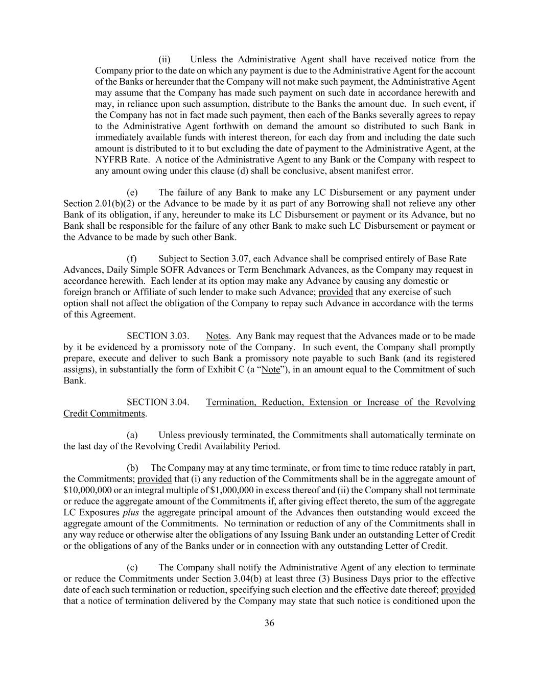 36 (ii) Unless the Administrative Agent shall have received notice from the Company prior to the date on which any payment is due to the Administrative Agent for the account of the Banks or hereunder that the Company will not make such payment, the Administrative Agent may assume that the Company has made such payment on such date in accordance herewith and may, in reliance upon such assumption, distribute to the Banks the amount due. In such event, if the Company has not in fact made such payment, then each of the Banks severally agrees to repay to the Administrative Agent forthwith on demand the amount so distributed to such Bank in immediately available funds with interest thereon, for each day from and including the date such amount is distributed to it to but excluding the date of payment to the Administrative Agent, at the NYFRB Rate. A notice of the Administrative Agent to any Bank or the Company with respect to any amount owing under this clause (d) shall be conclusive, absent manifest error. (e) The failure of any Bank to make any LC Disbursement or any payment under Section 2.01(b)(2) or the Advance to be made by it as part of any Borrowing shall not relieve any other Bank of its obligation, if any, hereunder to make its LC Disbursement or payment or its Advance, but no Bank shall be responsible for the failure of any other Bank to make such LC Disbursement or payment or the Advance to be made by such other Bank. (f) Subject to Section 3.07, each Advance shall be comprised entirely of Base Rate Advances, Daily Simple SOFR Advances or Term Benchmark Advances, as the Company may request in accordance herewith. Each lender at its option may make any Advance by causing any domestic or foreign branch or Affiliate of such lender to make such Advance; provided that any exercise of such option shall not affect the obligation of the Company to repay such Advance in accordance with the terms of this Agreement. SECTION 3.03. Notes. Any Bank may request that the Advances made or to be made by it be evidenced by a promissory note of the Company. In such event, the Company shall promptly prepare, execute and deliver to such Bank a promissory note payable to such Bank (and its registered assigns), in substantially the form of Exhibit C (a “Note”), in an amount equal to the Commitment of such Bank. SECTION 3.04. Termination, Reduction, Extension or Increase of the Revolving Credit Commitments. (a) Unless previously terminated, the Commitments shall automatically terminate on the last day of the Revolving Credit Availability Period. (b) The Company may at any time terminate, or from time to time reduce ratably in part, the Commitments; provided that (i) any reduction of the Commitments shall be in the aggregate amount of $10,000,000 or an integral multiple of $1,000,000 in excess thereof and (ii) the Company shall not terminate or reduce the aggregate amount of the Commitments if, after giving effect thereto, the sum of the aggregate LC Exposures plus the aggregate principal amount of the Advances then outstanding would exceed the aggregate amount of the Commitments. No termination or reduction of any of the Commitments shall in any way reduce or otherwise alter the obligations of any Issuing Bank under an outstanding Letter of Credit or the obligations of any of the Banks under or in connection with any outstanding Letter of Credit. (c) The Company shall notify the Administrative Agent of any election to terminate or reduce the Commitments under Section 3.04(b) at least three (3) Business Days prior to the effective date of each such termination or reduction, specifying such election and the effective date thereof; provided that a notice of termination delivered by the Company may state that such notice is conditioned upon the