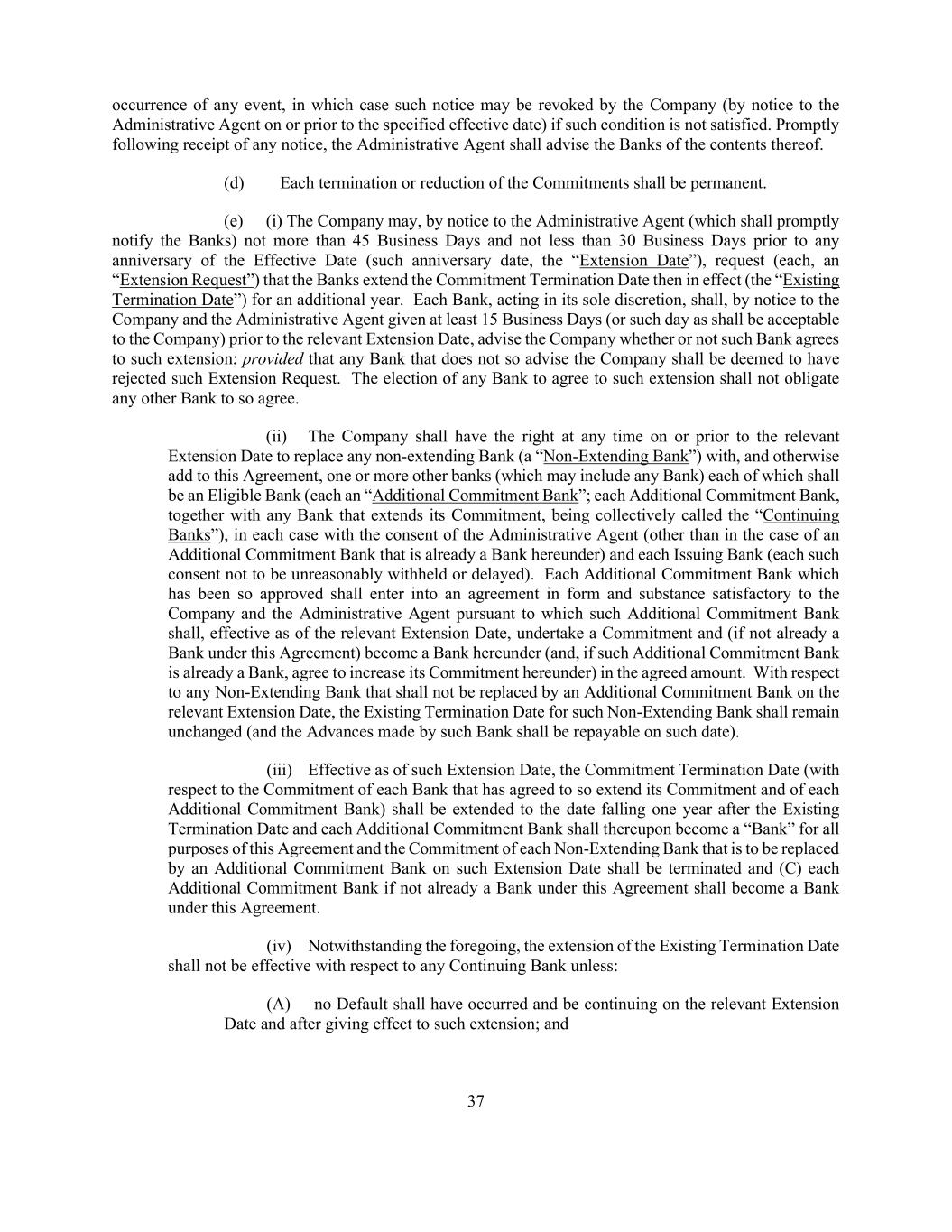 37 occurrence of any event, in which case such notice may be revoked by the Company (by notice to the Administrative Agent on or prior to the specified effective date) if such condition is not satisfied. Promptly following receipt of any notice, the Administrative Agent shall advise the Banks of the contents thereof. (d) Each termination or reduction of the Commitments shall be permanent. (e) (i) The Company may, by notice to the Administrative Agent (which shall promptly notify the Banks) not more than 45 Business Days and not less than 30 Business Days prior to any anniversary of the Effective Date (such anniversary date, the “Extension Date”), request (each, an “Extension Request”) that the Banks extend the Commitment Termination Date then in effect (the “Existing Termination Date”) for an additional year. Each Bank, acting in its sole discretion, shall, by notice to the Company and the Administrative Agent given at least 15 Business Days (or such day as shall be acceptable to the Company) prior to the relevant Extension Date, advise the Company whether or not such Bank agrees to such extension; provided that any Bank that does not so advise the Company shall be deemed to have rejected such Extension Request. The election of any Bank to agree to such extension shall not obligate any other Bank to so agree. (ii) The Company shall have the right at any time on or prior to the relevant Extension Date to replace any non-extending Bank (a “Non-Extending Bank”) with, and otherwise add to this Agreement, one or more other banks (which may include any Bank) each of which shall be an Eligible Bank (each an “Additional Commitment Bank”; each Additional Commitment Bank, together with any Bank that extends its Commitment, being collectively called the “Continuing Banks”), in each case with the consent of the Administrative Agent (other than in the case of an Additional Commitment Bank that is already a Bank hereunder) and each Issuing Bank (each such consent not to be unreasonably withheld or delayed). Each Additional Commitment Bank which has been so approved shall enter into an agreement in form and substance satisfactory to the Company and the Administrative Agent pursuant to which such Additional Commitment Bank shall, effective as of the relevant Extension Date, undertake a Commitment and (if not already a Bank under this Agreement) become a Bank hereunder (and, if such Additional Commitment Bank is already a Bank, agree to increase its Commitment hereunder) in the agreed amount. With respect to any Non-Extending Bank that shall not be replaced by an Additional Commitment Bank on the relevant Extension Date, the Existing Termination Date for such Non-Extending Bank shall remain unchanged (and the Advances made by such Bank shall be repayable on such date). (iii) Effective as of such Extension Date, the Commitment Termination Date (with respect to the Commitment of each Bank that has agreed to so extend its Commitment and of each Additional Commitment Bank) shall be extended to the date falling one year after the Existing Termination Date and each Additional Commitment Bank shall thereupon become a “Bank” for all purposes of this Agreement and the Commitment of each Non-Extending Bank that is to be replaced by an Additional Commitment Bank on such Extension Date shall be terminated and (C) each Additional Commitment Bank if not already a Bank under this Agreement shall become a Bank under this Agreement. (iv) Notwithstanding the foregoing, the extension of the Existing Termination Date shall not be effective with respect to any Continuing Bank unless: (A) no Default shall have occurred and be continuing on the relevant Extension Date and after giving effect to such extension; and