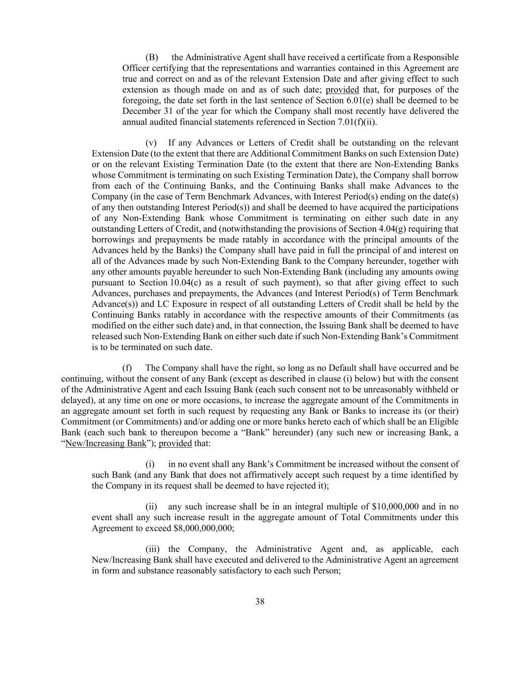 38 (B) the Administrative Agent shall have received a certificate from a Responsible Officer certifying that the representations and warranties contained in this Agreement are true and correct on and as of the relevant Extension Date and after giving effect to such extension as though made on and as of such date; provided that, for purposes of the foregoing, the date set forth in the last sentence of Section 6.01(e) shall be deemed to be December 31 of the year for which the Company shall most recently have delivered the annual audited financial statements referenced in Section 7.01(f)(ii). (v) If any Advances or Letters of Credit shall be outstanding on the relevant Extension Date (to the extent that there are Additional Commitment Banks on such Extension Date) or on the relevant Existing Termination Date (to the extent that there are Non-Extending Banks whose Commitment is terminating on such Existing Termination Date), the Company shall borrow from each of the Continuing Banks, and the Continuing Banks shall make Advances to the Company (in the case of Term Benchmark Advances, with Interest Period(s) ending on the date(s) of any then outstanding Interest Period(s)) and shall be deemed to have acquired the participations of any Non-Extending Bank whose Commitment is terminating on either such date in any outstanding Letters of Credit, and (notwithstanding the provisions of Section 4.04(g) requiring that borrowings and prepayments be made ratably in accordance with the principal amounts of the Advances held by the Banks) the Company shall have paid in full the principal of and interest on all of the Advances made by such Non-Extending Bank to the Company hereunder, together with any other amounts payable hereunder to such Non-Extending Bank (including any amounts owing pursuant to Section 10.04(c) as a result of such payment), so that after giving effect to such Advances, purchases and prepayments, the Advances (and Interest Period(s) of Term Benchmark Advance(s)) and LC Exposure in respect of all outstanding Letters of Credit shall be held by the Continuing Banks ratably in accordance with the respective amounts of their Commitments (as modified on the either such date) and, in that connection, the Issuing Bank shall be deemed to have released such Non-Extending Bank on either such date if such Non-Extending Bank’s Commitment is to be terminated on such date. (f) The Company shall have the right, so long as no Default shall have occurred and be continuing, without the consent of any Bank (except as described in clause (i) below) but with the consent of the Administrative Agent and each Issuing Bank (each such consent not to be unreasonably withheld or delayed), at any time on one or more occasions, to increase the aggregate amount of the Commitments in an aggregate amount set forth in such request by requesting any Bank or Banks to increase its (or their) Commitment (or Commitments) and/or adding one or more banks hereto each of which shall be an Eligible Bank (each such bank to thereupon become a “Bank” hereunder) (any such new or increasing Bank, a “New/Increasing Bank”); provided that: (i) in no event shall any Bank’s Commitment be increased without the consent of such Bank (and any Bank that does not affirmatively accept such request by a time identified by the Company in its request shall be deemed to have rejected it); (ii) any such increase shall be in an integral multiple of $10,000,000 and in no event shall any such increase result in the aggregate amount of Total Commitments under this Agreement to exceed $8,000,000,000; (iii) the Company, the Administrative Agent and, as applicable, each New/Increasing Bank shall have executed and delivered to the Administrative Agent an agreement in form and substance reasonably satisfactory to each such Person;