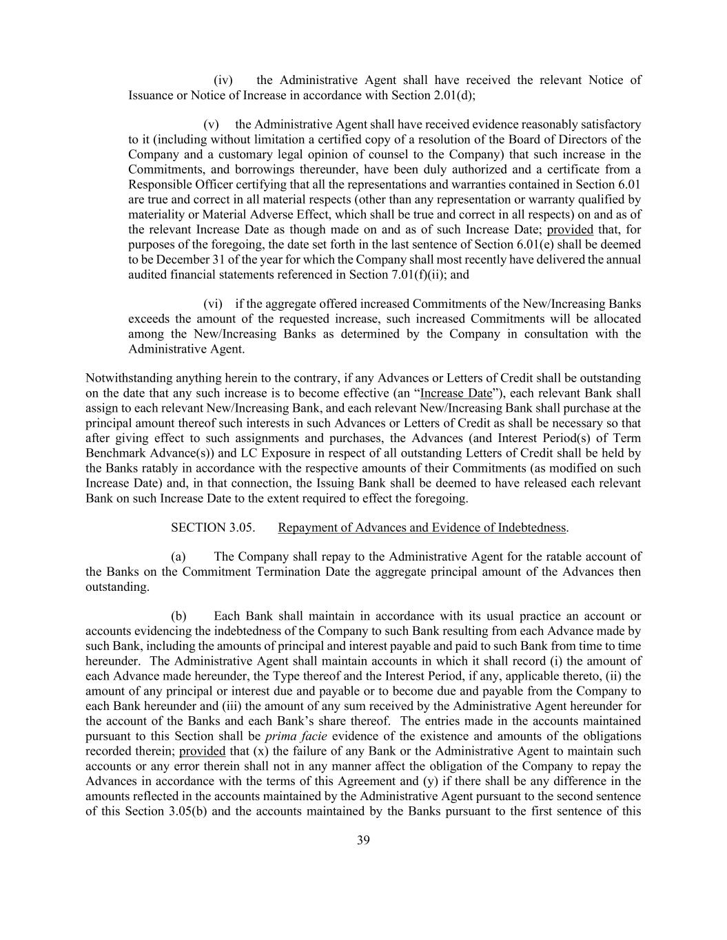 39 (iv) the Administrative Agent shall have received the relevant Notice of Issuance or Notice of Increase in accordance with Section 2.01(d); (v) the Administrative Agent shall have received evidence reasonably satisfactory to it (including without limitation a certified copy of a resolution of the Board of Directors of the Company and a customary legal opinion of counsel to the Company) that such increase in the Commitments, and borrowings thereunder, have been duly authorized and a certificate from a Responsible Officer certifying that all the representations and warranties contained in Section 6.01 are true and correct in all material respects (other than any representation or warranty qualified by materiality or Material Adverse Effect, which shall be true and correct in all respects) on and as of the relevant Increase Date as though made on and as of such Increase Date; provided that, for purposes of the foregoing, the date set forth in the last sentence of Section 6.01(e) shall be deemed to be December 31 of the year for which the Company shall most recently have delivered the annual audited financial statements referenced in Section 7.01(f)(ii); and (vi) if the aggregate offered increased Commitments of the New/Increasing Banks exceeds the amount of the requested increase, such increased Commitments will be allocated among the New/Increasing Banks as determined by the Company in consultation with the Administrative Agent. Notwithstanding anything herein to the contrary, if any Advances or Letters of Credit shall be outstanding on the date that any such increase is to become effective (an “Increase Date”), each relevant Bank shall assign to each relevant New/Increasing Bank, and each relevant New/Increasing Bank shall purchase at the principal amount thereof such interests in such Advances or Letters of Credit as shall be necessary so that after giving effect to such assignments and purchases, the Advances (and Interest Period(s) of Term Benchmark Advance(s)) and LC Exposure in respect of all outstanding Letters of Credit shall be held by the Banks ratably in accordance with the respective amounts of their Commitments (as modified on such Increase Date) and, in that connection, the Issuing Bank shall be deemed to have released each relevant Bank on such Increase Date to the extent required to effect the foregoing. SECTION 3.05. Repayment of Advances and Evidence of Indebtedness. (a) The Company shall repay to the Administrative Agent for the ratable account of the Banks on the Commitment Termination Date the aggregate principal amount of the Advances then outstanding. (b) Each Bank shall maintain in accordance with its usual practice an account or accounts evidencing the indebtedness of the Company to such Bank resulting from each Advance made by such Bank, including the amounts of principal and interest payable and paid to such Bank from time to time hereunder. The Administrative Agent shall maintain accounts in which it shall record (i) the amount of each Advance made hereunder, the Type thereof and the Interest Period, if any, applicable thereto, (ii) the amount of any principal or interest due and payable or to become due and payable from the Company to each Bank hereunder and (iii) the amount of any sum received by the Administrative Agent hereunder for the account of the Banks and each Bank’s share thereof. The entries made in the accounts maintained pursuant to this Section shall be prima facie evidence of the existence and amounts of the obligations recorded therein; provided that (x) the failure of any Bank or the Administrative Agent to maintain such accounts or any error therein shall not in any manner affect the obligation of the Company to repay the Advances in accordance with the terms of this Agreement and (y) if there shall be any difference in the amounts reflected in the accounts maintained by the Administrative Agent pursuant to the second sentence of this Section 3.05(b) and the accounts maintained by the Banks pursuant to the first sentence of this