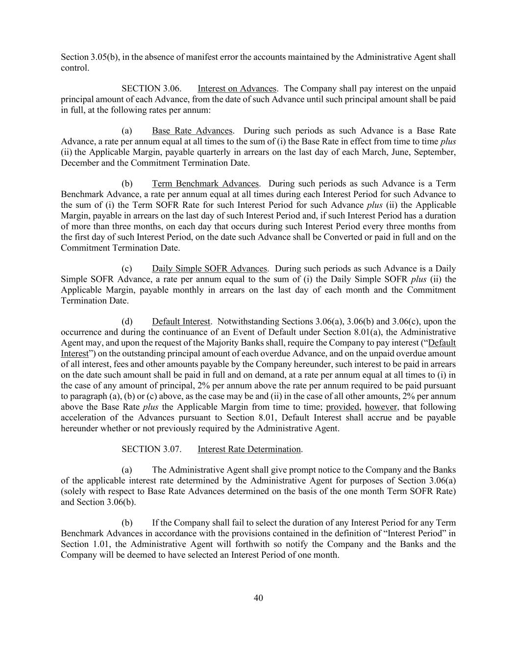 40 Section 3.05(b), in the absence of manifest error the accounts maintained by the Administrative Agent shall control. SECTION 3.06. Interest on Advances. The Company shall pay interest on the unpaid principal amount of each Advance, from the date of such Advance until such principal amount shall be paid in full, at the following rates per annum: (a) Base Rate Advances. During such periods as such Advance is a Base Rate Advance, a rate per annum equal at all times to the sum of (i) the Base Rate in effect from time to time plus (ii) the Applicable Margin, payable quarterly in arrears on the last day of each March, June, September, December and the Commitment Termination Date. (b) Term Benchmark Advances. During such periods as such Advance is a Term Benchmark Advance, a rate per annum equal at all times during each Interest Period for such Advance to the sum of (i) the Term SOFR Rate for such Interest Period for such Advance plus (ii) the Applicable Margin, payable in arrears on the last day of such Interest Period and, if such Interest Period has a duration of more than three months, on each day that occurs during such Interest Period every three months from the first day of such Interest Period, on the date such Advance shall be Converted or paid in full and on the Commitment Termination Date. (c) Daily Simple SOFR Advances. During such periods as such Advance is a Daily Simple SOFR Advance, a rate per annum equal to the sum of (i) the Daily Simple SOFR plus (ii) the Applicable Margin, payable monthly in arrears on the last day of each month and the Commitment Termination Date. (d) Default Interest. Notwithstanding Sections 3.06(a), 3.06(b) and 3.06(c), upon the occurrence and during the continuance of an Event of Default under Section 8.01(a), the Administrative Agent may, and upon the request of the Majority Banks shall, require the Company to pay interest (“Default Interest”) on the outstanding principal amount of each overdue Advance, and on the unpaid overdue amount of all interest, fees and other amounts payable by the Company hereunder, such interest to be paid in arrears on the date such amount shall be paid in full and on demand, at a rate per annum equal at all times to (i) in the case of any amount of principal, 2% per annum above the rate per annum required to be paid pursuant to paragraph (a), (b) or (c) above, as the case may be and (ii) in the case of all other amounts, 2% per annum above the Base Rate plus the Applicable Margin from time to time; provided, however, that following acceleration of the Advances pursuant to Section 8.01, Default Interest shall accrue and be payable hereunder whether or not previously required by the Administrative Agent. SECTION 3.07. Interest Rate Determination. (a) The Administrative Agent shall give prompt notice to the Company and the Banks of the applicable interest rate determined by the Administrative Agent for purposes of Section 3.06(a) (solely with respect to Base Rate Advances determined on the basis of the one month Term SOFR Rate) and Section 3.06(b). (b) If the Company shall fail to select the duration of any Interest Period for any Term Benchmark Advances in accordance with the provisions contained in the definition of “Interest Period” in Section 1.01, the Administrative Agent will forthwith so notify the Company and the Banks and the Company will be deemed to have selected an Interest Period of one month.