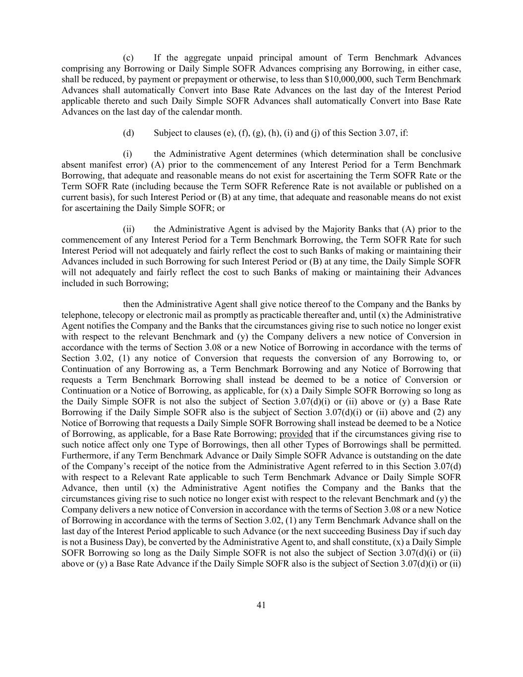 41 (c) If the aggregate unpaid principal amount of Term Benchmark Advances comprising any Borrowing or Daily Simple SOFR Advances comprising any Borrowing, in either case, shall be reduced, by payment or prepayment or otherwise, to less than $10,000,000, such Term Benchmark Advances shall automatically Convert into Base Rate Advances on the last day of the Interest Period applicable thereto and such Daily Simple SOFR Advances shall automatically Convert into Base Rate Advances on the last day of the calendar month. (d) Subject to clauses (e), (f), (g), (h), (i) and (j) of this Section 3.07, if: (i) the Administrative Agent determines (which determination shall be conclusive absent manifest error) (A) prior to the commencement of any Interest Period for a Term Benchmark Borrowing, that adequate and reasonable means do not exist for ascertaining the Term SOFR Rate or the Term SOFR Rate (including because the Term SOFR Reference Rate is not available or published on a current basis), for such Interest Period or (B) at any time, that adequate and reasonable means do not exist for ascertaining the Daily Simple SOFR; or (ii) the Administrative Agent is advised by the Majority Banks that (A) prior to the commencement of any Interest Period for a Term Benchmark Borrowing, the Term SOFR Rate for such Interest Period will not adequately and fairly reflect the cost to such Banks of making or maintaining their Advances included in such Borrowing for such Interest Period or (B) at any time, the Daily Simple SOFR will not adequately and fairly reflect the cost to such Banks of making or maintaining their Advances included in such Borrowing; then the Administrative Agent shall give notice thereof to the Company and the Banks by telephone, telecopy or electronic mail as promptly as practicable thereafter and, until (x) the Administrative Agent notifies the Company and the Banks that the circumstances giving rise to such notice no longer exist with respect to the relevant Benchmark and (y) the Company delivers a new notice of Conversion in accordance with the terms of Section 3.08 or a new Notice of Borrowing in accordance with the terms of Section 3.02, (1) any notice of Conversion that requests the conversion of any Borrowing to, or Continuation of any Borrowing as, a Term Benchmark Borrowing and any Notice of Borrowing that requests a Term Benchmark Borrowing shall instead be deemed to be a notice of Conversion or Continuation or a Notice of Borrowing, as applicable, for (x) a Daily Simple SOFR Borrowing so long as the Daily Simple SOFR is not also the subject of Section 3.07(d)(i) or (ii) above or (y) a Base Rate Borrowing if the Daily Simple SOFR also is the subject of Section 3.07(d)(i) or (ii) above and (2) any Notice of Borrowing that requests a Daily Simple SOFR Borrowing shall instead be deemed to be a Notice of Borrowing, as applicable, for a Base Rate Borrowing; provided that if the circumstances giving rise to such notice affect only one Type of Borrowings, then all other Types of Borrowings shall be permitted. Furthermore, if any Term Benchmark Advance or Daily Simple SOFR Advance is outstanding on the date of the Company’s receipt of the notice from the Administrative Agent referred to in this Section 3.07(d) with respect to a Relevant Rate applicable to such Term Benchmark Advance or Daily Simple SOFR Advance, then until (x) the Administrative Agent notifies the Company and the Banks that the circumstances giving rise to such notice no longer exist with respect to the relevant Benchmark and (y) the Company delivers a new notice of Conversion in accordance with the terms of Section 3.08 or a new Notice of Borrowing in accordance with the terms of Section 3.02, (1) any Term Benchmark Advance shall on the last day of the Interest Period applicable to such Advance (or the next succeeding Business Day if such day is not a Business Day), be converted by the Administrative Agent to, and shall constitute, (x) a Daily Simple SOFR Borrowing so long as the Daily Simple SOFR is not also the subject of Section 3.07(d)(i) or (ii) above or (y) a Base Rate Advance if the Daily Simple SOFR also is the subject of Section 3.07(d)(i) or (ii)