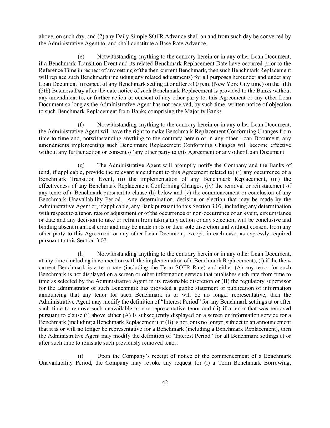 42 above, on such day, and (2) any Daily Simple SOFR Advance shall on and from such day be converted by the Administrative Agent to, and shall constitute a Base Rate Advance. (e) Notwithstanding anything to the contrary herein or in any other Loan Document, if a Benchmark Transition Event and its related Benchmark Replacement Date have occurred prior to the Reference Time in respect of any setting of the then-current Benchmark, then such Benchmark Replacement will replace such Benchmark (including any related adjustments) for all purposes hereunder and under any Loan Document in respect of any Benchmark setting at or after 5:00 p.m. (New York City time) on the fifth (5th) Business Day after the date notice of such Benchmark Replacement is provided to the Banks without any amendment to, or further action or consent of any other party to, this Agreement or any other Loan Document so long as the Administrative Agent has not received, by such time, written notice of objection to such Benchmark Replacement from Banks comprising the Majority Banks. (f) Notwithstanding anything to the contrary herein or in any other Loan Document, the Administrative Agent will have the right to make Benchmark Replacement Conforming Changes from time to time and, notwithstanding anything to the contrary herein or in any other Loan Document, any amendments implementing such Benchmark Replacement Conforming Changes will become effective without any further action or consent of any other party to this Agreement or any other Loan Document. (g) The Administrative Agent will promptly notify the Company and the Banks of (and, if applicable, provide the relevant amendment to this Agreement related to) (i) any occurrence of a Benchmark Transition Event, (ii) the implementation of any Benchmark Replacement, (iii) the effectiveness of any Benchmark Replacement Conforming Changes, (iv) the removal or reinstatement of any tenor of a Benchmark pursuant to clause (h) below and (v) the commencement or conclusion of any Benchmark Unavailability Period. Any determination, decision or election that may be made by the Administrative Agent or, if applicable, any Bank pursuant to this Section 3.07, including any determination with respect to a tenor, rate or adjustment or of the occurrence or non-occurrence of an event, circumstance or date and any decision to take or refrain from taking any action or any selection, will be conclusive and binding absent manifest error and may be made in its or their sole discretion and without consent from any other party to this Agreement or any other Loan Document, except, in each case, as expressly required pursuant to this Section 3.07. (h) Notwithstanding anything to the contrary herein or in any other Loan Document, at any time (including in connection with the implementation of a Benchmark Replacement), (i) if the then- current Benchmark is a term rate (including the Term SOFR Rate) and either (A) any tenor for such Benchmark is not displayed on a screen or other information service that publishes such rate from time to time as selected by the Administrative Agent in its reasonable discretion or (B) the regulatory supervisor for the administrator of such Benchmark has provided a public statement or publication of information announcing that any tenor for such Benchmark is or will be no longer representative, then the Administrative Agent may modify the definition of “Interest Period” for any Benchmark settings at or after such time to remove such unavailable or non-representative tenor and (ii) if a tenor that was removed pursuant to clause (i) above either (A) is subsequently displayed on a screen or information service for a Benchmark (including a Benchmark Replacement) or (B) is not, or is no longer, subject to an announcement that it is or will no longer be representative for a Benchmark (including a Benchmark Replacement), then the Administrative Agent may modify the definition of “Interest Period” for all Benchmark settings at or after such time to reinstate such previously removed tenor. (i) Upon the Company’s receipt of notice of the commencement of a Benchmark Unavailability Period, the Company may revoke any request for (i) a Term Benchmark Borrowing,
