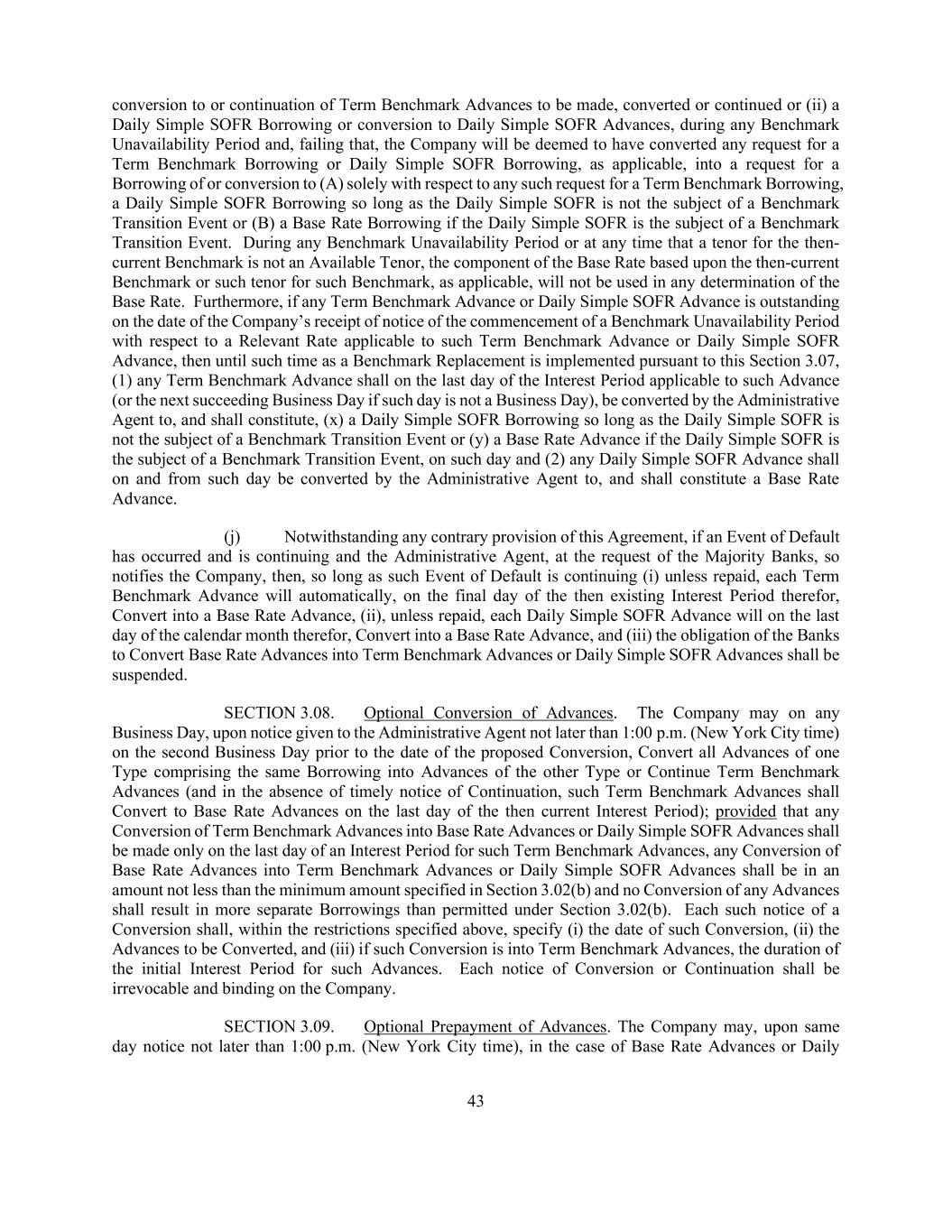 43 conversion to or continuation of Term Benchmark Advances to be made, converted or continued or (ii) a Daily Simple SOFR Borrowing or conversion to Daily Simple SOFR Advances, during any Benchmark Unavailability Period and, failing that, the Company will be deemed to have converted any request for a Term Benchmark Borrowing or Daily Simple SOFR Borrowing, as applicable, into a request for a Borrowing of or conversion to (A) solely with respect to any such request for a Term Benchmark Borrowing, a Daily Simple SOFR Borrowing so long as the Daily Simple SOFR is not the subject of a Benchmark Transition Event or (B) a Base Rate Borrowing if the Daily Simple SOFR is the subject of a Benchmark Transition Event. During any Benchmark Unavailability Period or at any time that a tenor for the then- current Benchmark is not an Available Tenor, the component of the Base Rate based upon the then-current Benchmark or such tenor for such Benchmark, as applicable, will not be used in any determination of the Base Rate. Furthermore, if any Term Benchmark Advance or Daily Simple SOFR Advance is outstanding on the date of the Company’s receipt of notice of the commencement of a Benchmark Unavailability Period with respect to a Relevant Rate applicable to such Term Benchmark Advance or Daily Simple SOFR Advance, then until such time as a Benchmark Replacement is implemented pursuant to this Section 3.07, (1) any Term Benchmark Advance shall on the last day of the Interest Period applicable to such Advance (or the next succeeding Business Day if such day is not a Business Day), be converted by the Administrative Agent to, and shall constitute, (x) a Daily Simple SOFR Borrowing so long as the Daily Simple SOFR is not the subject of a Benchmark Transition Event or (y) a Base Rate Advance if the Daily Simple SOFR is the subject of a Benchmark Transition Event, on such day and (2) any Daily Simple SOFR Advance shall on and from such day be converted by the Administrative Agent to, and shall constitute a Base Rate Advance. (j) Notwithstanding any contrary provision of this Agreement, if an Event of Default has occurred and is continuing and the Administrative Agent, at the request of the Majority Banks, so notifies the Company, then, so long as such Event of Default is continuing (i) unless repaid, each Term Benchmark Advance will automatically, on the final day of the then existing Interest Period therefor, Convert into a Base Rate Advance, (ii), unless repaid, each Daily Simple SOFR Advance will on the last day of the calendar month therefor, Convert into a Base Rate Advance, and (iii) the obligation of the Banks to Convert Base Rate Advances into Term Benchmark Advances or Daily Simple SOFR Advances shall be suspended. SECTION 3.08. Optional Conversion of Advances. The Company may on any Business Day, upon notice given to the Administrative Agent not later than 1:00 p.m. (New York City time) on the second Business Day prior to the date of the proposed Conversion, Convert all Advances of one Type comprising the same Borrowing into Advances of the other Type or Continue Term Benchmark Advances (and in the absence of timely notice of Continuation, such Term Benchmark Advances shall Convert to Base Rate Advances on the last day of the then current Interest Period); provided that any Conversion of Term Benchmark Advances into Base Rate Advances or Daily Simple SOFR Advances shall be made only on the last day of an Interest Period for such Term Benchmark Advances, any Conversion of Base Rate Advances into Term Benchmark Advances or Daily Simple SOFR Advances shall be in an amount not less than the minimum amount specified in Section 3.02(b) and no Conversion of any Advances shall result in more separate Borrowings than permitted under Section 3.02(b). Each such notice of a Conversion shall, within the restrictions specified above, specify (i) the date of such Conversion, (ii) the Advances to be Converted, and (iii) if such Conversion is into Term Benchmark Advances, the duration of the initial Interest Period for such Advances. Each notice of Conversion or Continuation shall be irrevocable and binding on the Company. SECTION 3.09. Optional Prepayment of Advances. The Company may, upon same day notice not later than 1:00 p.m. (New York City time), in the case of Base Rate Advances or Daily