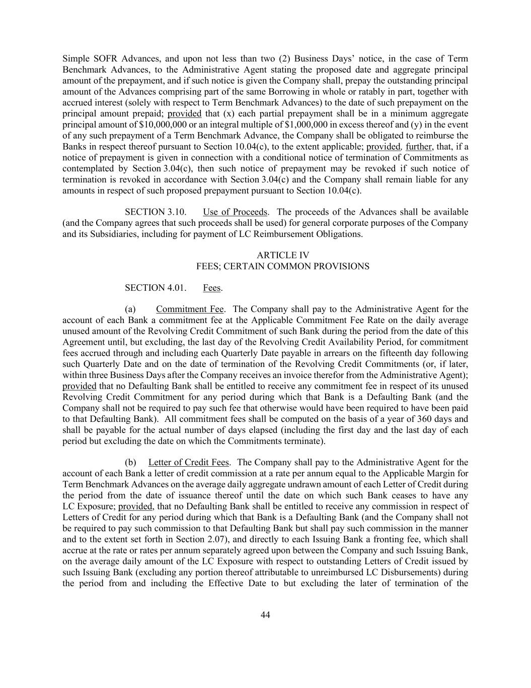 44 Simple SOFR Advances, and upon not less than two (2) Business Days’ notice, in the case of Term Benchmark Advances, to the Administrative Agent stating the proposed date and aggregate principal amount of the prepayment, and if such notice is given the Company shall, prepay the outstanding principal amount of the Advances comprising part of the same Borrowing in whole or ratably in part, together with accrued interest (solely with respect to Term Benchmark Advances) to the date of such prepayment on the principal amount prepaid; provided that (x) each partial prepayment shall be in a minimum aggregate principal amount of $10,000,000 or an integral multiple of $1,000,000 in excess thereof and (y) in the event of any such prepayment of a Term Benchmark Advance, the Company shall be obligated to reimburse the Banks in respect thereof pursuant to Section 10.04(c), to the extent applicable; provided, further, that, if a notice of prepayment is given in connection with a conditional notice of termination of Commitments as contemplated by Section 3.04(c), then such notice of prepayment may be revoked if such notice of termination is revoked in accordance with Section 3.04(c) and the Company shall remain liable for any amounts in respect of such proposed prepayment pursuant to Section 10.04(c). SECTION 3.10. Use of Proceeds. The proceeds of the Advances shall be available (and the Company agrees that such proceeds shall be used) for general corporate purposes of the Company and its Subsidiaries, including for payment of LC Reimbursement Obligations. ARTICLE IV FEES; CERTAIN COMMON PROVISIONS SECTION 4.01. Fees. (a) Commitment Fee. The Company shall pay to the Administrative Agent for the account of each Bank a commitment fee at the Applicable Commitment Fee Rate on the daily average unused amount of the Revolving Credit Commitment of such Bank during the period from the date of this Agreement until, but excluding, the last day of the Revolving Credit Availability Period, for commitment fees accrued through and including each Quarterly Date payable in arrears on the fifteenth day following such Quarterly Date and on the date of termination of the Revolving Credit Commitments (or, if later, within three Business Days after the Company receives an invoice therefor from the Administrative Agent); provided that no Defaulting Bank shall be entitled to receive any commitment fee in respect of its unused Revolving Credit Commitment for any period during which that Bank is a Defaulting Bank (and the Company shall not be required to pay such fee that otherwise would have been required to have been paid to that Defaulting Bank). All commitment fees shall be computed on the basis of a year of 360 days and shall be payable for the actual number of days elapsed (including the first day and the last day of each period but excluding the date on which the Commitments terminate). (b) Letter of Credit Fees. The Company shall pay to the Administrative Agent for the account of each Bank a letter of credit commission at a rate per annum equal to the Applicable Margin for Term Benchmark Advances on the average daily aggregate undrawn amount of each Letter of Credit during the period from the date of issuance thereof until the date on which such Bank ceases to have any LC Exposure; provided, that no Defaulting Bank shall be entitled to receive any commission in respect of Letters of Credit for any period during which that Bank is a Defaulting Bank (and the Company shall not be required to pay such commission to that Defaulting Bank but shall pay such commission in the manner and to the extent set forth in Section 2.07), and directly to each Issuing Bank a fronting fee, which shall accrue at the rate or rates per annum separately agreed upon between the Company and such Issuing Bank, on the average daily amount of the LC Exposure with respect to outstanding Letters of Credit issued by such Issuing Bank (excluding any portion thereof attributable to unreimbursed LC Disbursements) during the period from and including the Effective Date to but excluding the later of termination of the