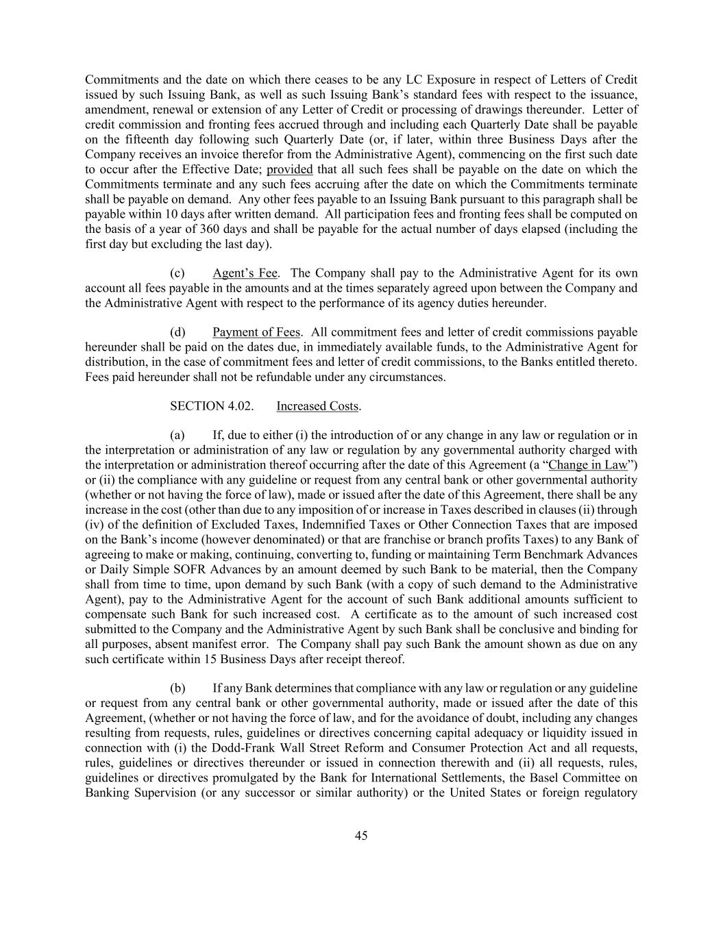 45 Commitments and the date on which there ceases to be any LC Exposure in respect of Letters of Credit issued by such Issuing Bank, as well as such Issuing Bank’s standard fees with respect to the issuance, amendment, renewal or extension of any Letter of Credit or processing of drawings thereunder. Letter of credit commission and fronting fees accrued through and including each Quarterly Date shall be payable on the fifteenth day following such Quarterly Date (or, if later, within three Business Days after the Company receives an invoice therefor from the Administrative Agent), commencing on the first such date to occur after the Effective Date; provided that all such fees shall be payable on the date on which the Commitments terminate and any such fees accruing after the date on which the Commitments terminate shall be payable on demand. Any other fees payable to an Issuing Bank pursuant to this paragraph shall be payable within 10 days after written demand. All participation fees and fronting fees shall be computed on the basis of a year of 360 days and shall be payable for the actual number of days elapsed (including the first day but excluding the last day). (c) Agent’s Fee. The Company shall pay to the Administrative Agent for its own account all fees payable in the amounts and at the times separately agreed upon between the Company and the Administrative Agent with respect to the performance of its agency duties hereunder. (d) Payment of Fees. All commitment fees and letter of credit commissions payable hereunder shall be paid on the dates due, in immediately available funds, to the Administrative Agent for distribution, in the case of commitment fees and letter of credit commissions, to the Banks entitled thereto. Fees paid hereunder shall not be refundable under any circumstances. SECTION 4.02. Increased Costs. (a) If, due to either (i) the introduction of or any change in any law or regulation or in the interpretation or administration of any law or regulation by any governmental authority charged with the interpretation or administration thereof occurring after the date of this Agreement (a “Change in Law”) or (ii) the compliance with any guideline or request from any central bank or other governmental authority (whether or not having the force of law), made or issued after the date of this Agreement, there shall be any increase in the cost (other than due to any imposition of or increase in Taxes described in clauses (ii) through (iv) of the definition of Excluded Taxes, Indemnified Taxes or Other Connection Taxes that are imposed on the Bank’s income (however denominated) or that are franchise or branch profits Taxes) to any Bank of agreeing to make or making, continuing, converting to, funding or maintaining Term Benchmark Advances or Daily Simple SOFR Advances by an amount deemed by such Bank to be material, then the Company shall from time to time, upon demand by such Bank (with a copy of such demand to the Administrative Agent), pay to the Administrative Agent for the account of such Bank additional amounts sufficient to compensate such Bank for such increased cost. A certificate as to the amount of such increased cost submitted to the Company and the Administrative Agent by such Bank shall be conclusive and binding for all purposes, absent manifest error. The Company shall pay such Bank the amount shown as due on any such certificate within 15 Business Days after receipt thereof. (b) If any Bank determines that compliance with any law or regulation or any guideline or request from any central bank or other governmental authority, made or issued after the date of this Agreement, (whether or not having the force of law, and for the avoidance of doubt, including any changes resulting from requests, rules, guidelines or directives concerning capital adequacy or liquidity issued in connection with (i) the Dodd-Frank Wall Street Reform and Consumer Protection Act and all requests, rules, guidelines or directives thereunder or issued in connection therewith and (ii) all requests, rules, guidelines or directives promulgated by the Bank for International Settlements, the Basel Committee on Banking Supervision (or any successor or similar authority) or the United States or foreign regulatory