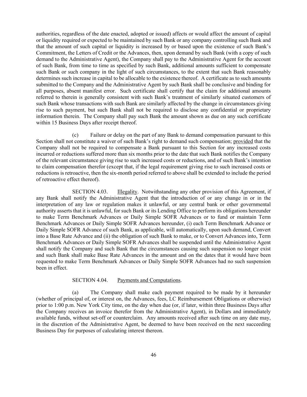46 authorities, regardless of the date enacted, adopted or issued) affects or would affect the amount of capital or liquidity required or expected to be maintained by such Bank or any company controlling such Bank and that the amount of such capital or liquidity is increased by or based upon the existence of such Bank’s Commitment, the Letters of Credit or the Advances, then, upon demand by such Bank (with a copy of such demand to the Administrative Agent), the Company shall pay to the Administrative Agent for the account of such Bank, from time to time as specified by such Bank, additional amounts sufficient to compensate such Bank or such company in the light of such circumstances, to the extent that such Bank reasonably determines such increase in capital to be allocable to the existence thereof. A certificate as to such amounts submitted to the Company and the Administrative Agent by such Bank shall be conclusive and binding for all purposes, absent manifest error. Such certificate shall certify that the claim for additional amounts referred to therein is generally consistent with such Bank’s treatment of similarly situated customers of such Bank whose transactions with such Bank are similarly affected by the change in circumstances giving rise to such payment, but such Bank shall not be required to disclose any confidential or proprietary information therein. The Company shall pay such Bank the amount shown as due on any such certificate within 15 Business Days after receipt thereof. (c) Failure or delay on the part of any Bank to demand compensation pursuant to this Section shall not constitute a waiver of such Bank’s right to demand such compensation; provided that the Company shall not be required to compensate a Bank pursuant to this Section for any increased costs incurred or reductions suffered more than six months prior to the date that such Bank notifies the Company of the relevant circumstance giving rise to such increased costs or reductions, and of such Bank’s intention to claim compensation therefor (except that, if the legal requirement giving rise to such increased costs or reductions is retroactive, then the six-month period referred to above shall be extended to include the period of retroactive effect thereof). SECTION 4.03. Illegality. Notwithstanding any other provision of this Agreement, if any Bank shall notify the Administrative Agent that the introduction of or any change in or in the interpretation of any law or regulation makes it unlawful, or any central bank or other governmental authority asserts that it is unlawful, for such Bank or its Lending Office to perform its obligations hereunder to make Term Benchmark Advances or Daily Simple SOFR Advances or to fund or maintain Term Benchmark Advances or Daily Simple SOFR Advances hereunder, (i) each Term Benchmark Advance or Daily Simple SOFR Advance of such Bank, as applicable, will automatically, upon such demand, Convert into a Base Rate Advance and (ii) the obligation of such Bank to make, or to Convert Advances into, Term Benchmark Advances or Daily Simple SOFR Advances shall be suspended until the Administrative Agent shall notify the Company and such Bank that the circumstances causing such suspension no longer exist and such Bank shall make Base Rate Advances in the amount and on the dates that it would have been requested to make Term Benchmark Advances or Daily Simple SOFR Advances had no such suspension been in effect. SECTION 4.04. Payments and Computations. (a) The Company shall make each payment required to be made by it hereunder (whether of principal of, or interest on, the Advances, fees, LC Reimbursement Obligations or otherwise) prior to 1:00 p.m. New York City time, on the day when due (or, if later, within three Business Days after the Company receives an invoice therefor from the Administrative Agent), in Dollars and immediately available funds, without set-off or counterclaim. Any amounts received after such time on any date may, in the discretion of the Administrative Agent, be deemed to have been received on the next succeeding Business Day for purposes of calculating interest thereon.