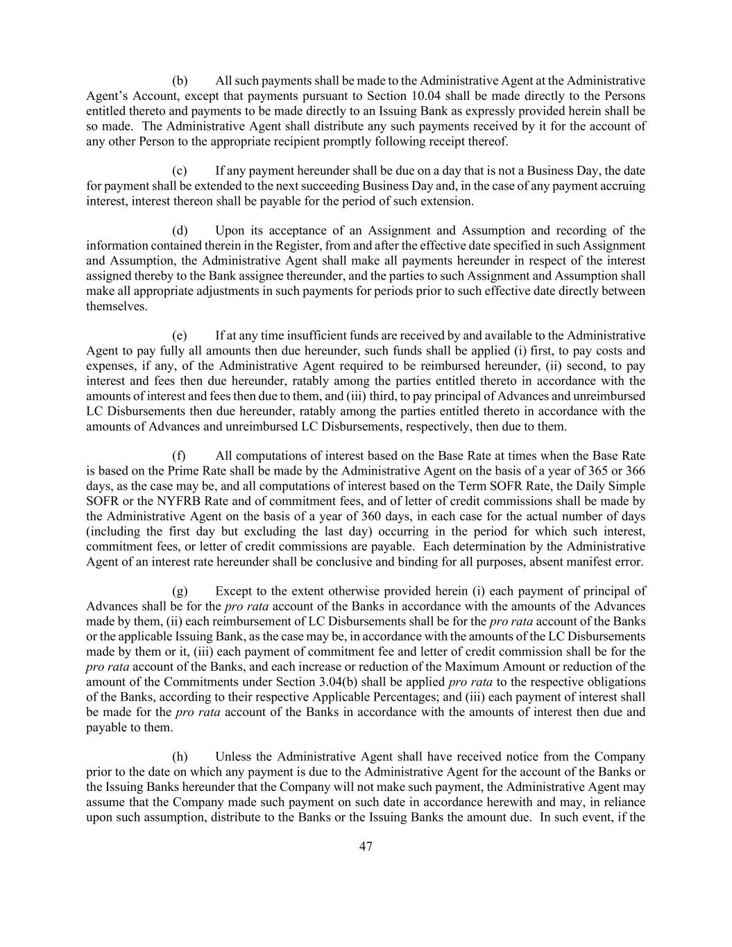 47 (b) All such payments shall be made to the Administrative Agent at the Administrative Agent’s Account, except that payments pursuant to Section 10.04 shall be made directly to the Persons entitled thereto and payments to be made directly to an Issuing Bank as expressly provided herein shall be so made. The Administrative Agent shall distribute any such payments received by it for the account of any other Person to the appropriate recipient promptly following receipt thereof. (c) If any payment hereunder shall be due on a day that is not a Business Day, the date for payment shall be extended to the next succeeding Business Day and, in the case of any payment accruing interest, interest thereon shall be payable for the period of such extension. (d) Upon its acceptance of an Assignment and Assumption and recording of the information contained therein in the Register, from and after the effective date specified in such Assignment and Assumption, the Administrative Agent shall make all payments hereunder in respect of the interest assigned thereby to the Bank assignee thereunder, and the parties to such Assignment and Assumption shall make all appropriate adjustments in such payments for periods prior to such effective date directly between themselves. (e) If at any time insufficient funds are received by and available to the Administrative Agent to pay fully all amounts then due hereunder, such funds shall be applied (i) first, to pay costs and expenses, if any, of the Administrative Agent required to be reimbursed hereunder, (ii) second, to pay interest and fees then due hereunder, ratably among the parties entitled thereto in accordance with the amounts of interest and fees then due to them, and (iii) third, to pay principal of Advances and unreimbursed LC Disbursements then due hereunder, ratably among the parties entitled thereto in accordance with the amounts of Advances and unreimbursed LC Disbursements, respectively, then due to them. (f) All computations of interest based on the Base Rate at times when the Base Rate is based on the Prime Rate shall be made by the Administrative Agent on the basis of a year of 365 or 366 days, as the case may be, and all computations of interest based on the Term SOFR Rate, the Daily Simple SOFR or the NYFRB Rate and of commitment fees, and of letter of credit commissions shall be made by the Administrative Agent on the basis of a year of 360 days, in each case for the actual number of days (including the first day but excluding the last day) occurring in the period for which such interest, commitment fees, or letter of credit commissions are payable. Each determination by the Administrative Agent of an interest rate hereunder shall be conclusive and binding for all purposes, absent manifest error. (g) Except to the extent otherwise provided herein (i) each payment of principal of Advances shall be for the pro rata account of the Banks in accordance with the amounts of the Advances made by them, (ii) each reimbursement of LC Disbursements shall be for the pro rata account of the Banks or the applicable Issuing Bank, as the case may be, in accordance with the amounts of the LC Disbursements made by them or it, (iii) each payment of commitment fee and letter of credit commission shall be for the pro rata account of the Banks, and each increase or reduction of the Maximum Amount or reduction of the amount of the Commitments under Section 3.04(b) shall be applied pro rata to the respective obligations of the Banks, according to their respective Applicable Percentages; and (iii) each payment of interest shall be made for the pro rata account of the Banks in accordance with the amounts of interest then due and payable to them. (h) Unless the Administrative Agent shall have received notice from the Company prior to the date on which any payment is due to the Administrative Agent for the account of the Banks or the Issuing Banks hereunder that the Company will not make such payment, the Administrative Agent may assume that the Company made such payment on such date in accordance herewith and may, in reliance upon such assumption, distribute to the Banks or the Issuing Banks the amount due. In such event, if the