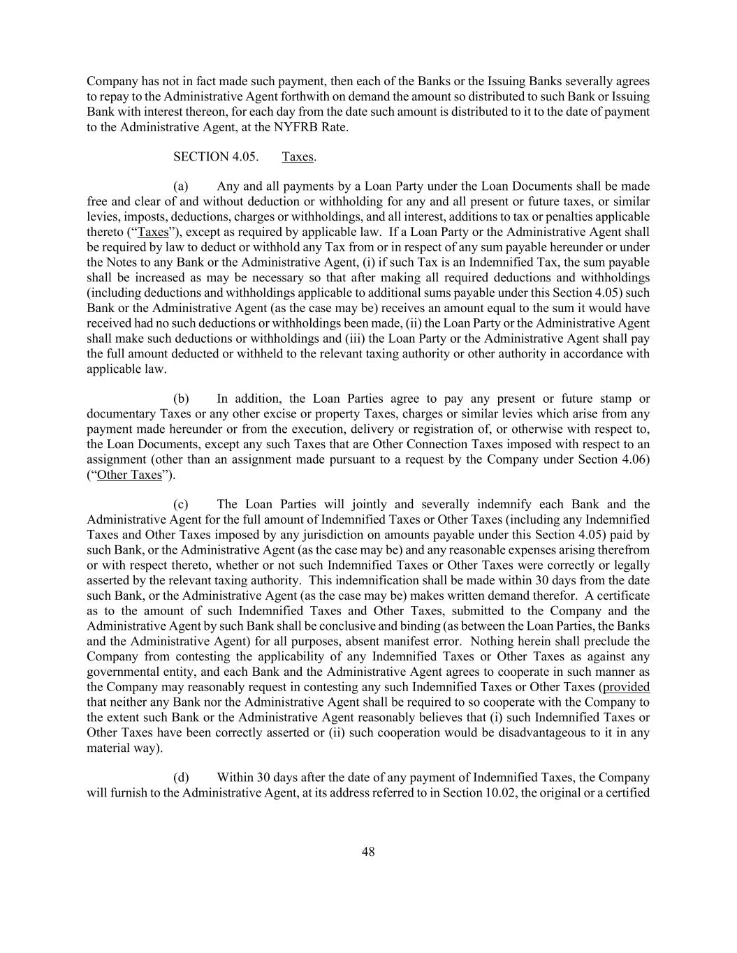 48 Company has not in fact made such payment, then each of the Banks or the Issuing Banks severally agrees to repay to the Administrative Agent forthwith on demand the amount so distributed to such Bank or Issuing Bank with interest thereon, for each day from the date such amount is distributed to it to the date of payment to the Administrative Agent, at the NYFRB Rate. SECTION 4.05. Taxes. (a) Any and all payments by a Loan Party under the Loan Documents shall be made free and clear of and without deduction or withholding for any and all present or future taxes, or similar levies, imposts, deductions, charges or withholdings, and all interest, additions to tax or penalties applicable thereto (“Taxes”), except as required by applicable law. If a Loan Party or the Administrative Agent shall be required by law to deduct or withhold any Tax from or in respect of any sum payable hereunder or under the Notes to any Bank or the Administrative Agent, (i) if such Tax is an Indemnified Tax, the sum payable shall be increased as may be necessary so that after making all required deductions and withholdings (including deductions and withholdings applicable to additional sums payable under this Section 4.05) such Bank or the Administrative Agent (as the case may be) receives an amount equal to the sum it would have received had no such deductions or withholdings been made, (ii) the Loan Party or the Administrative Agent shall make such deductions or withholdings and (iii) the Loan Party or the Administrative Agent shall pay the full amount deducted or withheld to the relevant taxing authority or other authority in accordance with applicable law. (b) In addition, the Loan Parties agree to pay any present or future stamp or documentary Taxes or any other excise or property Taxes, charges or similar levies which arise from any payment made hereunder or from the execution, delivery or registration of, or otherwise with respect to, the Loan Documents, except any such Taxes that are Other Connection Taxes imposed with respect to an assignment (other than an assignment made pursuant to a request by the Company under Section 4.06) (“Other Taxes”). (c) The Loan Parties will jointly and severally indemnify each Bank and the Administrative Agent for the full amount of Indemnified Taxes or Other Taxes (including any Indemnified Taxes and Other Taxes imposed by any jurisdiction on amounts payable under this Section 4.05) paid by such Bank, or the Administrative Agent (as the case may be) and any reasonable expenses arising therefrom or with respect thereto, whether or not such Indemnified Taxes or Other Taxes were correctly or legally asserted by the relevant taxing authority. This indemnification shall be made within 30 days from the date such Bank, or the Administrative Agent (as the case may be) makes written demand therefor. A certificate as to the amount of such Indemnified Taxes and Other Taxes, submitted to the Company and the Administrative Agent by such Bank shall be conclusive and binding (as between the Loan Parties, the Banks and the Administrative Agent) for all purposes, absent manifest error. Nothing herein shall preclude the Company from contesting the applicability of any Indemnified Taxes or Other Taxes as against any governmental entity, and each Bank and the Administrative Agent agrees to cooperate in such manner as the Company may reasonably request in contesting any such Indemnified Taxes or Other Taxes (provided that neither any Bank nor the Administrative Agent shall be required to so cooperate with the Company to the extent such Bank or the Administrative Agent reasonably believes that (i) such Indemnified Taxes or Other Taxes have been correctly asserted or (ii) such cooperation would be disadvantageous to it in any material way). (d) Within 30 days after the date of any payment of Indemnified Taxes, the Company will furnish to the Administrative Agent, at its address referred to in Section 10.02, the original or a certified