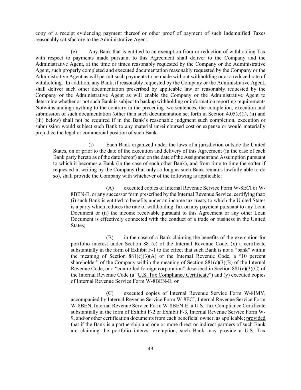 49 copy of a receipt evidencing payment thereof or other proof of payment of such Indemnified Taxes reasonably satisfactory to the Administrative Agent. (e) Any Bank that is entitled to an exemption from or reduction of withholding Tax with respect to payments made pursuant to this Agreement shall deliver to the Company and the Administrative Agent, at the time or times reasonably requested by the Company or the Administrative Agent, such properly completed and executed documentation reasonably requested by the Company or the Administrative Agent as will permit such payments to be made without withholding or at a reduced rate of withholding. In addition, any Bank, if reasonably requested by the Company or the Administrative Agent, shall deliver such other documentation prescribed by applicable law or reasonably requested by the Company or the Administrative Agent as will enable the Company or the Administrative Agent to determine whether or not such Bank is subject to backup withholding or information reporting requirements. Notwithstanding anything to the contrary in the preceding two sentences, the completion, execution and submission of such documentation (other than such documentation set forth in Section 4.05(e)(i), (ii) and (iii) below) shall not be required if in the Bank’s reasonable judgment such completion, execution or submission would subject such Bank to any material unreimbursed cost or expense or would materially prejudice the legal or commercial position of such Bank. (i) Each Bank organized under the laws of a jurisdiction outside the United States, on or prior to the date of the execution and delivery of this Agreement (in the case of each Bank party hereto as of the date hereof) and on the date of the Assignment and Assumption pursuant to which it becomes a Bank (in the case of each other Bank), and from time to time thereafter if requested in writing by the Company (but only so long as such Bank remains lawfully able to do so), shall provide the Company with whichever of the following is applicable: (A) executed copies of Internal Revenue Service Form W-8ECI or W- 8BEN-E, or any successor form prescribed by the Internal Revenue Service, certifying that: (i) such Bank is entitled to benefits under an income tax treaty to which the United States is a party which reduces the rate of withholding Tax on any payment pursuant to any Loan Document or (ii) the income receivable pursuant to this Agreement or any other Loan Document is effectively connected with the conduct of a trade or business in the United States; (B) in the case of a Bank claiming the benefits of the exemption for portfolio interest under Section 881(c) of the Internal Revenue Code, (x) a certificate substantially in the form of Exhibit F-1 to the effect that such Bank is not a “bank” within the meaning of Section 881(c)(3)(A) of the Internal Revenue Code, a “10 percent shareholder” of the Company within the meaning of Section 881(c)(3)(B) of the Internal Revenue Code, or a “controlled foreign corporation” described in Section 881(c)(3)(C) of the Internal Revenue Code (a “U.S. Tax Compliance Certificate”) and (y) executed copies of Internal Revenue Service Form W-8BEN-E; or (C) executed copies of Internal Revenue Service Form W-8IMY, accompanied by Internal Revenue Service Form W-8ECI, Internal Revenue Service Form W-8BEN, Internal Revenue Service Form W-8BEN-E, a U.S. Tax Compliance Certificate substantially in the form of Exhibit F-2 or Exhibit F-3, Internal Revenue Service Form W- 9, and/or other certification documents from each beneficial owner, as applicable; provided that if the Bank is a partnership and one or more direct or indirect partners of such Bank are claiming the portfolio interest exemption, such Bank may provide a U.S. Tax