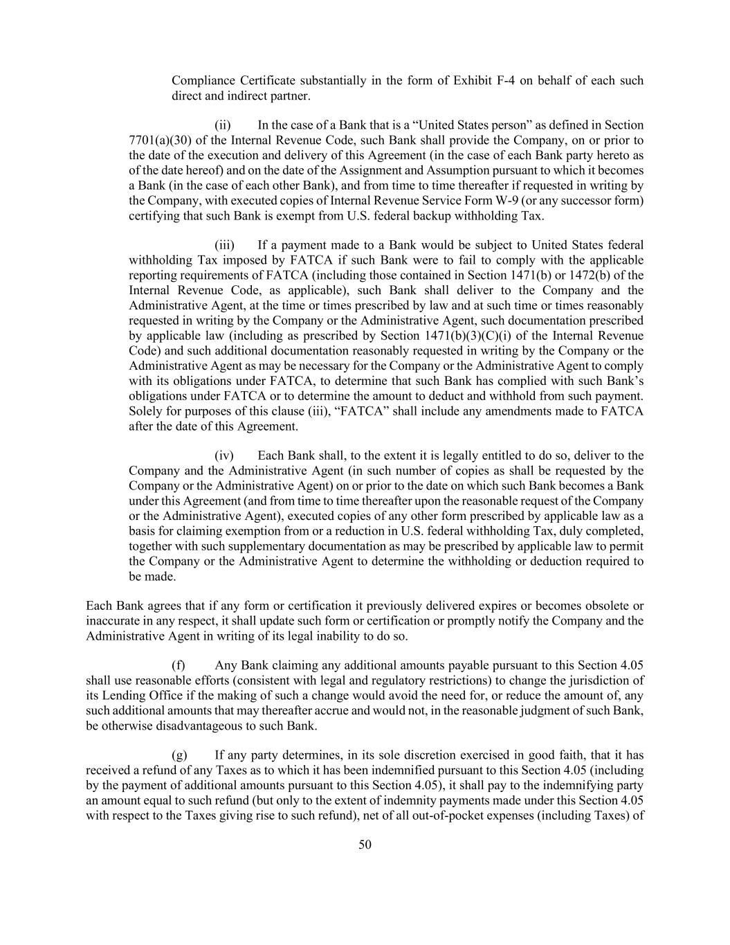 50 Compliance Certificate substantially in the form of Exhibit F-4 on behalf of each such direct and indirect partner. (ii) In the case of a Bank that is a “United States person” as defined in Section 7701(a)(30) of the Internal Revenue Code, such Bank shall provide the Company, on or prior to the date of the execution and delivery of this Agreement (in the case of each Bank party hereto as of the date hereof) and on the date of the Assignment and Assumption pursuant to which it becomes a Bank (in the case of each other Bank), and from time to time thereafter if requested in writing by the Company, with executed copies of Internal Revenue Service Form W-9 (or any successor form) certifying that such Bank is exempt from U.S. federal backup withholding Tax. (iii) If a payment made to a Bank would be subject to United States federal withholding Tax imposed by FATCA if such Bank were to fail to comply with the applicable reporting requirements of FATCA (including those contained in Section 1471(b) or 1472(b) of the Internal Revenue Code, as applicable), such Bank shall deliver to the Company and the Administrative Agent, at the time or times prescribed by law and at such time or times reasonably requested in writing by the Company or the Administrative Agent, such documentation prescribed by applicable law (including as prescribed by Section 1471(b)(3)(C)(i) of the Internal Revenue Code) and such additional documentation reasonably requested in writing by the Company or the Administrative Agent as may be necessary for the Company or the Administrative Agent to comply with its obligations under FATCA, to determine that such Bank has complied with such Bank’s obligations under FATCA or to determine the amount to deduct and withhold from such payment. Solely for purposes of this clause (iii), “FATCA” shall include any amendments made to FATCA after the date of this Agreement. (iv) Each Bank shall, to the extent it is legally entitled to do so, deliver to the Company and the Administrative Agent (in such number of copies as shall be requested by the Company or the Administrative Agent) on or prior to the date on which such Bank becomes a Bank under this Agreement (and from time to time thereafter upon the reasonable request of the Company or the Administrative Agent), executed copies of any other form prescribed by applicable law as a basis for claiming exemption from or a reduction in U.S. federal withholding Tax, duly completed, together with such supplementary documentation as may be prescribed by applicable law to permit the Company or the Administrative Agent to determine the withholding or deduction required to be made. Each Bank agrees that if any form or certification it previously delivered expires or becomes obsolete or inaccurate in any respect, it shall update such form or certification or promptly notify the Company and the Administrative Agent in writing of its legal inability to do so. (f) Any Bank claiming any additional amounts payable pursuant to this Section 4.05 shall use reasonable efforts (consistent with legal and regulatory restrictions) to change the jurisdiction of its Lending Office if the making of such a change would avoid the need for, or reduce the amount of, any such additional amounts that may thereafter accrue and would not, in the reasonable judgment of such Bank, be otherwise disadvantageous to such Bank. (g) If any party determines, in its sole discretion exercised in good faith, that it has received a refund of any Taxes as to which it has been indemnified pursuant to this Section 4.05 (including by the payment of additional amounts pursuant to this Section 4.05), it shall pay to the indemnifying party an amount equal to such refund (but only to the extent of indemnity payments made under this Section 4.05 with respect to the Taxes giving rise to such refund), net of all out-of-pocket expenses (including Taxes) of