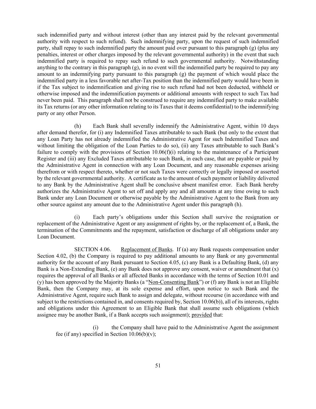 51 such indemnified party and without interest (other than any interest paid by the relevant governmental authority with respect to such refund). Such indemnifying party, upon the request of such indemnified party, shall repay to such indemnified party the amount paid over pursuant to this paragraph (g) (plus any penalties, interest or other charges imposed by the relevant governmental authority) in the event that such indemnified party is required to repay such refund to such governmental authority. Notwithstanding anything to the contrary in this paragraph (g), in no event will the indemnified party be required to pay any amount to an indemnifying party pursuant to this paragraph (g) the payment of which would place the indemnified party in a less favorable net after-Tax position than the indemnified party would have been in if the Tax subject to indemnification and giving rise to such refund had not been deducted, withheld or otherwise imposed and the indemnification payments or additional amounts with respect to such Tax had never been paid. This paragraph shall not be construed to require any indemnified party to make available its Tax returns (or any other information relating to its Taxes that it deems confidential) to the indemnifying party or any other Person. (h) Each Bank shall severally indemnify the Administrative Agent, within 10 days after demand therefor, for (i) any Indemnified Taxes attributable to such Bank (but only to the extent that any Loan Party has not already indemnified the Administrative Agent for such Indemnified Taxes and without limiting the obligation of the Loan Parties to do so), (ii) any Taxes attributable to such Bank’s failure to comply with the provisions of Section 10.06(f)(i) relating to the maintenance of a Participant Register and (iii) any Excluded Taxes attributable to such Bank, in each case, that are payable or paid by the Administrative Agent in connection with any Loan Document, and any reasonable expenses arising therefrom or with respect thereto, whether or not such Taxes were correctly or legally imposed or asserted by the relevant governmental authority. A certificate as to the amount of such payment or liability delivered to any Bank by the Administrative Agent shall be conclusive absent manifest error. Each Bank hereby authorizes the Administrative Agent to set off and apply any and all amounts at any time owing to such Bank under any Loan Document or otherwise payable by the Administrative Agent to the Bank from any other source against any amount due to the Administrative Agent under this paragraph (h). (i) Each party’s obligations under this Section shall survive the resignation or replacement of the Administrative Agent or any assignment of rights by, or the replacement of, a Bank, the termination of the Commitments and the repayment, satisfaction or discharge of all obligations under any Loan Document. SECTION 4.06. Replacement of Banks. If (a) any Bank requests compensation under Section 4.02, (b) the Company is required to pay additional amounts to any Bank or any governmental authority for the account of any Bank pursuant to Section 4.05, (c) any Bank is a Defaulting Bank, (d) any Bank is a Non-Extending Bank, (e) any Bank does not approve any consent, waiver or amendment that (x) requires the approval of all Banks or all affected Banks in accordance with the terms of Section 10.01 and (y) has been approved by the Majority Banks (a “Non-Consenting Bank”) or (f) any Bank is not an Eligible Bank, then the Company may, at its sole expense and effort, upon notice to such Bank and the Administrative Agent, require such Bank to assign and delegate, without recourse (in accordance with and subject to the restrictions contained in, and consents required by, Section 10.06(b)), all of its interests, rights and obligations under this Agreement to an Eligible Bank that shall assume such obligations (which assignee may be another Bank, if a Bank accepts such assignment); provided that: (i) the Company shall have paid to the Administrative Agent the assignment fee (if any) specified in Section 10.06(b)(v);