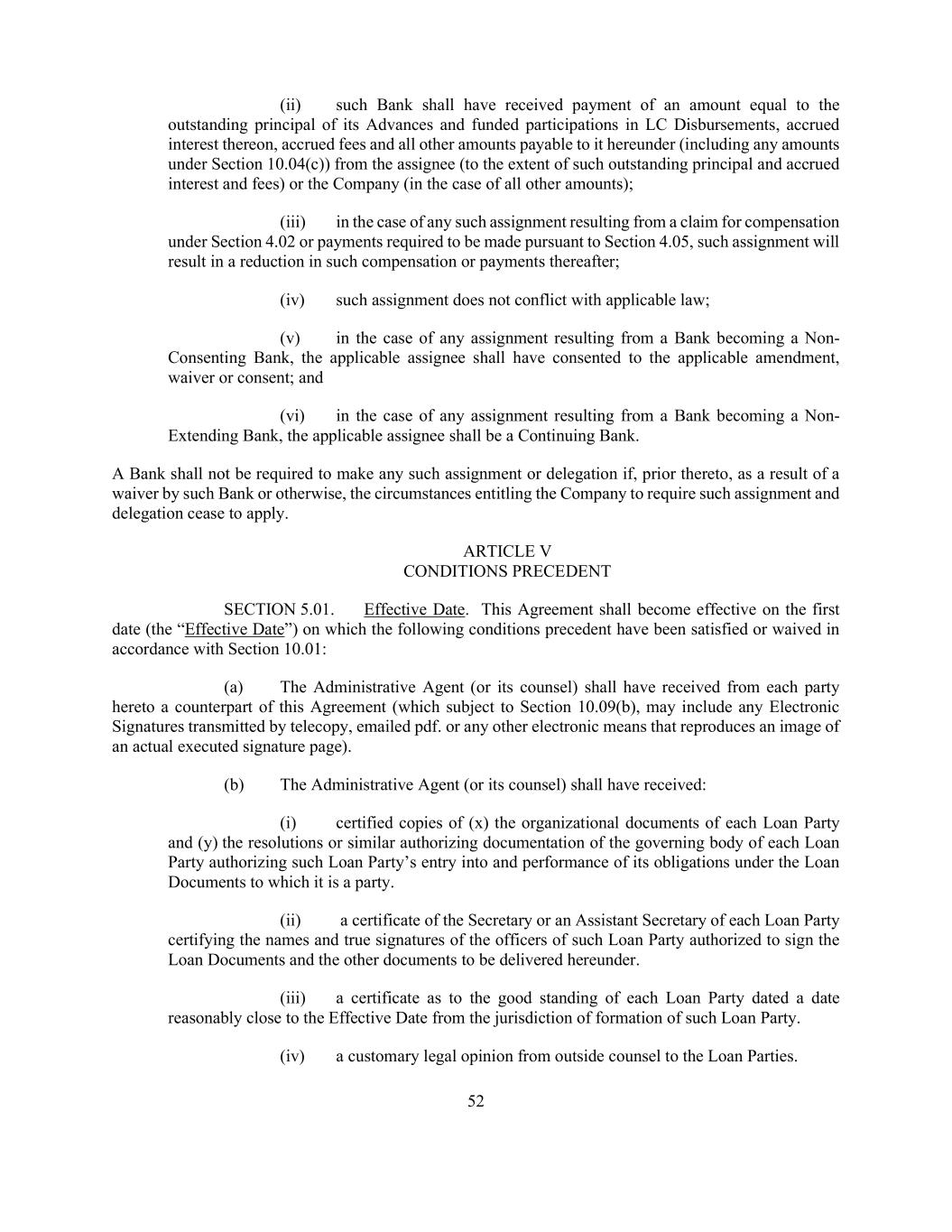 52 (ii) such Bank shall have received payment of an amount equal to the outstanding principal of its Advances and funded participations in LC Disbursements, accrued interest thereon, accrued fees and all other amounts payable to it hereunder (including any amounts under Section 10.04(c)) from the assignee (to the extent of such outstanding principal and accrued interest and fees) or the Company (in the case of all other amounts); (iii) in the case of any such assignment resulting from a claim for compensation under Section 4.02 or payments required to be made pursuant to Section 4.05, such assignment will result in a reduction in such compensation or payments thereafter; (iv) such assignment does not conflict with applicable law; (v) in the case of any assignment resulting from a Bank becoming a Non- Consenting Bank, the applicable assignee shall have consented to the applicable amendment, waiver or consent; and (vi) in the case of any assignment resulting from a Bank becoming a Non- Extending Bank, the applicable assignee shall be a Continuing Bank. A Bank shall not be required to make any such assignment or delegation if, prior thereto, as a result of a waiver by such Bank or otherwise, the circumstances entitling the Company to require such assignment and delegation cease to apply. ARTICLE V CONDITIONS PRECEDENT SECTION 5.01. Effective Date. This Agreement shall become effective on the first date (the “Effective Date”) on which the following conditions precedent have been satisfied or waived in accordance with Section 10.01: (a) The Administrative Agent (or its counsel) shall have received from each party hereto a counterpart of this Agreement (which subject to Section 10.09(b), may include any Electronic Signatures transmitted by telecopy, emailed pdf. or any other electronic means that reproduces an image of an actual executed signature page). (b) The Administrative Agent (or its counsel) shall have received: (i) certified copies of (x) the organizational documents of each Loan Party and (y) the resolutions or similar authorizing documentation of the governing body of each Loan Party authorizing such Loan Party’s entry into and performance of its obligations under the Loan Documents to which it is a party. (ii) a certificate of the Secretary or an Assistant Secretary of each Loan Party certifying the names and true signatures of the officers of such Loan Party authorized to sign the Loan Documents and the other documents to be delivered hereunder. (iii) a certificate as to the good standing of each Loan Party dated a date reasonably close to the Effective Date from the jurisdiction of formation of such Loan Party. (iv) a customary legal opinion from outside counsel to the Loan Parties.