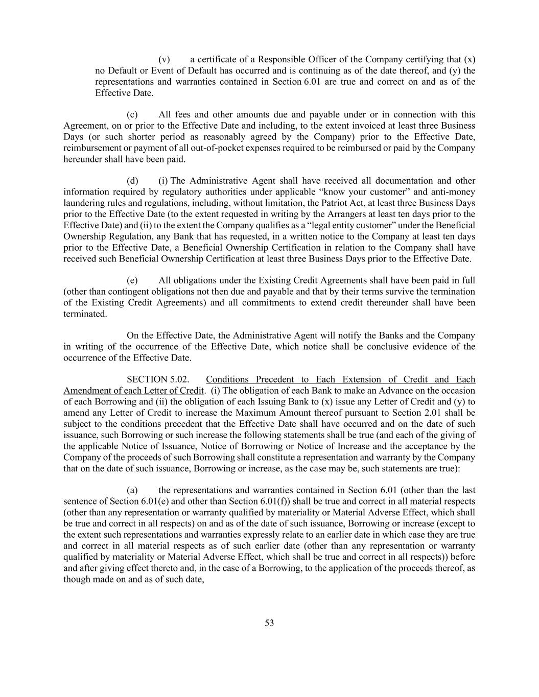 53 (v) a certificate of a Responsible Officer of the Company certifying that (x) no Default or Event of Default has occurred and is continuing as of the date thereof, and (y) the representations and warranties contained in Section 6.01 are true and correct on and as of the Effective Date. (c) All fees and other amounts due and payable under or in connection with this Agreement, on or prior to the Effective Date and including, to the extent invoiced at least three Business Days (or such shorter period as reasonably agreed by the Company) prior to the Effective Date, reimbursement or payment of all out-of-pocket expenses required to be reimbursed or paid by the Company hereunder shall have been paid. (d) (i) The Administrative Agent shall have received all documentation and other information required by regulatory authorities under applicable “know your customer” and anti-money laundering rules and regulations, including, without limitation, the Patriot Act, at least three Business Days prior to the Effective Date (to the extent requested in writing by the Arrangers at least ten days prior to the Effective Date) and (ii) to the extent the Company qualifies as a “legal entity customer” under the Beneficial Ownership Regulation, any Bank that has requested, in a written notice to the Company at least ten days prior to the Effective Date, a Beneficial Ownership Certification in relation to the Company shall have received such Beneficial Ownership Certification at least three Business Days prior to the Effective Date. (e) All obligations under the Existing Credit Agreements shall have been paid in full (other than contingent obligations not then due and payable and that by their terms survive the termination of the Existing Credit Agreements) and all commitments to extend credit thereunder shall have been terminated. On the Effective Date, the Administrative Agent will notify the Banks and the Company in writing of the occurrence of the Effective Date, which notice shall be conclusive evidence of the occurrence of the Effective Date. SECTION 5.02. Conditions Precedent to Each Extension of Credit and Each Amendment of each Letter of Credit. (i) The obligation of each Bank to make an Advance on the occasion of each Borrowing and (ii) the obligation of each Issuing Bank to (x) issue any Letter of Credit and (y) to amend any Letter of Credit to increase the Maximum Amount thereof pursuant to Section 2.01 shall be subject to the conditions precedent that the Effective Date shall have occurred and on the date of such issuance, such Borrowing or such increase the following statements shall be true (and each of the giving of the applicable Notice of Issuance, Notice of Borrowing or Notice of Increase and the acceptance by the Company of the proceeds of such Borrowing shall constitute a representation and warranty by the Company that on the date of such issuance, Borrowing or increase, as the case may be, such statements are true): (a) the representations and warranties contained in Section 6.01 (other than the last sentence of Section 6.01(e) and other than Section 6.01(f)) shall be true and correct in all material respects (other than any representation or warranty qualified by materiality or Material Adverse Effect, which shall be true and correct in all respects) on and as of the date of such issuance, Borrowing or increase (except to the extent such representations and warranties expressly relate to an earlier date in which case they are true and correct in all material respects as of such earlier date (other than any representation or warranty qualified by materiality or Material Adverse Effect, which shall be true and correct in all respects)) before and after giving effect thereto and, in the case of a Borrowing, to the application of the proceeds thereof, as though made on and as of such date,