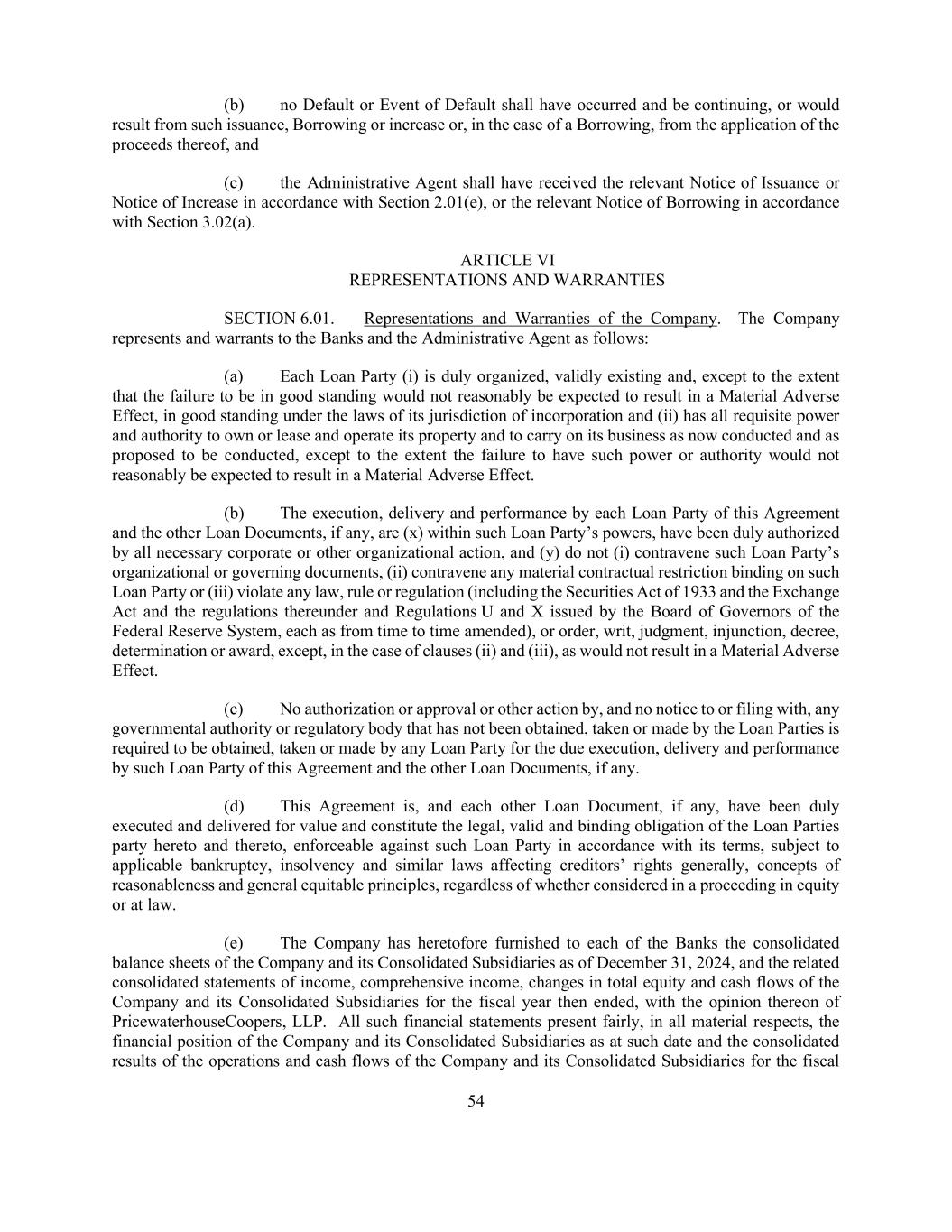 54 (b) no Default or Event of Default shall have occurred and be continuing, or would result from such issuance, Borrowing or increase or, in the case of a Borrowing, from the application of the proceeds thereof, and (c) the Administrative Agent shall have received the relevant Notice of Issuance or Notice of Increase in accordance with Section 2.01(e), or the relevant Notice of Borrowing in accordance with Section 3.02(a). ARTICLE VI REPRESENTATIONS AND WARRANTIES SECTION 6.01. Representations and Warranties of the Company. The Company represents and warrants to the Banks and the Administrative Agent as follows: (a) Each Loan Party (i) is duly organized, validly existing and, except to the extent that the failure to be in good standing would not reasonably be expected to result in a Material Adverse Effect, in good standing under the laws of its jurisdiction of incorporation and (ii) has all requisite power and authority to own or lease and operate its property and to carry on its business as now conducted and as proposed to be conducted, except to the extent the failure to have such power or authority would not reasonably be expected to result in a Material Adverse Effect. (b) The execution, delivery and performance by each Loan Party of this Agreement and the other Loan Documents, if any, are (x) within such Loan Party’s powers, have been duly authorized by all necessary corporate or other organizational action, and (y) do not (i) contravene such Loan Party’s organizational or governing documents, (ii) contravene any material contractual restriction binding on such Loan Party or (iii) violate any law, rule or regulation (including the Securities Act of 1933 and the Exchange Act and the regulations thereunder and Regulations U and X issued by the Board of Governors of the Federal Reserve System, each as from time to time amended), or order, writ, judgment, injunction, decree, determination or award, except, in the case of clauses (ii) and (iii), as would not result in a Material Adverse Effect. (c) No authorization or approval or other action by, and no notice to or filing with, any governmental authority or regulatory body that has not been obtained, taken or made by the Loan Parties is required to be obtained, taken or made by any Loan Party for the due execution, delivery and performance by such Loan Party of this Agreement and the other Loan Documents, if any. (d) This Agreement is, and each other Loan Document, if any, have been duly executed and delivered for value and constitute the legal, valid and binding obligation of the Loan Parties party hereto and thereto, enforceable against such Loan Party in accordance with its terms, subject to applicable bankruptcy, insolvency and similar laws affecting creditors’ rights generally, concepts of reasonableness and general equitable principles, regardless of whether considered in a proceeding in equity or at law. (e) The Company has heretofore furnished to each of the Banks the consolidated balance sheets of the Company and its Consolidated Subsidiaries as of December 31, 2024, and the related consolidated statements of income, comprehensive income, changes in total equity and cash flows of the Company and its Consolidated Subsidiaries for the fiscal year then ended, with the opinion thereon of PricewaterhouseCoopers, LLP. All such financial statements present fairly, in all material respects, the financial position of the Company and its Consolidated Subsidiaries as at such date and the consolidated results of the operations and cash flows of the Company and its Consolidated Subsidiaries for the fiscal