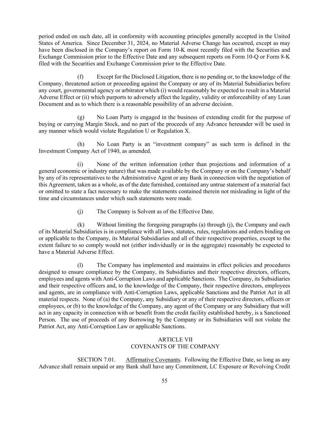 55 period ended on such date, all in conformity with accounting principles generally accepted in the United States of America. Since December 31, 2024, no Material Adverse Change has occurred, except as may have been disclosed in the Company’s report on Form 10-K most recently filed with the Securities and Exchange Commission prior to the Effective Date and any subsequent reports on Form 10-Q or Form 8-K filed with the Securities and Exchange Commission prior to the Effective Date. (f) Except for the Disclosed Litigation, there is no pending or, to the knowledge of the Company, threatened action or proceeding against the Company or any of its Material Subsidiaries before any court, governmental agency or arbitrator which (i) would reasonably be expected to result in a Material Adverse Effect or (ii) which purports to adversely affect the legality, validity or enforceability of any Loan Document and as to which there is a reasonable possibility of an adverse decision. (g) No Loan Party is engaged in the business of extending credit for the purpose of buying or carrying Margin Stock, and no part of the proceeds of any Advance hereunder will be used in any manner which would violate Regulation U or Regulation X. (h) No Loan Party is an “investment company” as such term is defined in the Investment Company Act of 1940, as amended. (i) None of the written information (other than projections and information of a general economic or industry nature) that was made available by the Company or on the Company’s behalf by any of its representatives to the Administrative Agent or any Bank in connection with the negotiation of this Agreement, taken as a whole, as of the date furnished, contained any untrue statement of a material fact or omitted to state a fact necessary to make the statements contained therein not misleading in light of the time and circumstances under which such statements were made. (j) The Company is Solvent as of the Effective Date. (k) Without limiting the foregoing paragraphs (a) through (j), the Company and each of its Material Subsidiaries is in compliance with all laws, statutes, rules, regulations and orders binding on or applicable to the Company, its Material Subsidiaries and all of their respective properties, except to the extent failure to so comply would not (either individually or in the aggregate) reasonably be expected to have a Material Adverse Effect. (l) The Company has implemented and maintains in effect policies and procedures designed to ensure compliance by the Company, its Subsidiaries and their respective directors, officers, employees and agents with Anti-Corruption Laws and applicable Sanctions. The Company, its Subsidiaries and their respective officers and, to the knowledge of the Company, their respective directors, employees and agents, are in compliance with Anti-Corruption Laws, applicable Sanctions and the Patriot Act in all material respects. None of (a) the Company, any Subsidiary or any of their respective directors, officers or employees, or (b) to the knowledge of the Company, any agent of the Company or any Subsidiary that will act in any capacity in connection with or benefit from the credit facility established hereby, is a Sanctioned Person. The use of proceeds of any Borrowing by the Company or its Subsidiaries will not violate the Patriot Act, any Anti-Corruption Law or applicable Sanctions. ARTICLE VII COVENANTS OF THE COMPANY SECTION 7.01. Affirmative Covenants. Following the Effective Date, so long as any Advance shall remain unpaid or any Bank shall have any Commitment, LC Exposure or Revolving Credit