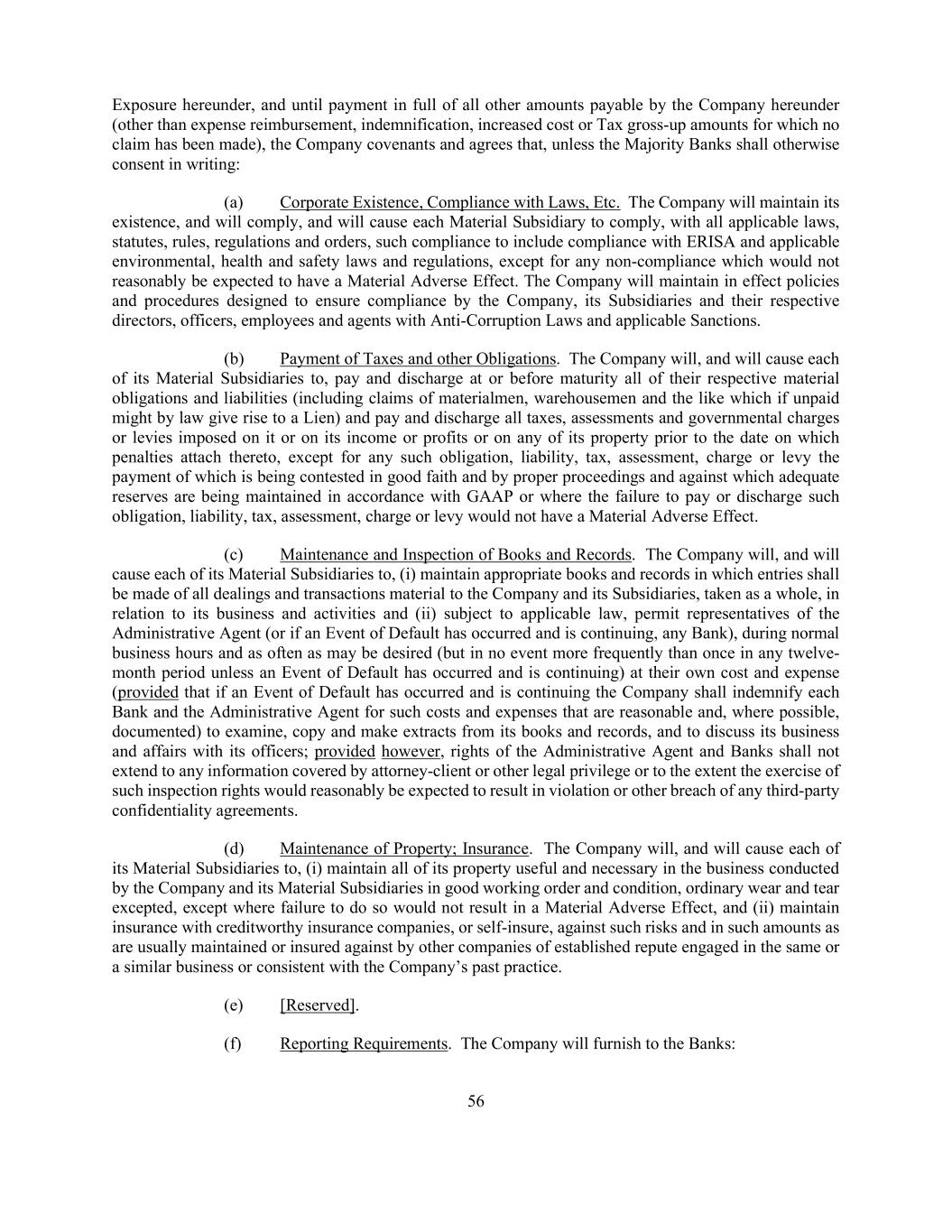 56 Exposure hereunder, and until payment in full of all other amounts payable by the Company hereunder (other than expense reimbursement, indemnification, increased cost or Tax gross-up amounts for which no claim has been made), the Company covenants and agrees that, unless the Majority Banks shall otherwise consent in writing: (a) Corporate Existence, Compliance with Laws, Etc. The Company will maintain its existence, and will comply, and will cause each Material Subsidiary to comply, with all applicable laws, statutes, rules, regulations and orders, such compliance to include compliance with ERISA and applicable environmental, health and safety laws and regulations, except for any non-compliance which would not reasonably be expected to have a Material Adverse Effect. The Company will maintain in effect policies and procedures designed to ensure compliance by the Company, its Subsidiaries and their respective directors, officers, employees and agents with Anti-Corruption Laws and applicable Sanctions. (b) Payment of Taxes and other Obligations. The Company will, and will cause each of its Material Subsidiaries to, pay and discharge at or before maturity all of their respective material obligations and liabilities (including claims of materialmen, warehousemen and the like which if unpaid might by law give rise to a Lien) and pay and discharge all taxes, assessments and governmental charges or levies imposed on it or on its income or profits or on any of its property prior to the date on which penalties attach thereto, except for any such obligation, liability, tax, assessment, charge or levy the payment of which is being contested in good faith and by proper proceedings and against which adequate reserves are being maintained in accordance with GAAP or where the failure to pay or discharge such obligation, liability, tax, assessment, charge or levy would not have a Material Adverse Effect. (c) Maintenance and Inspection of Books and Records. The Company will, and will cause each of its Material Subsidiaries to, (i) maintain appropriate books and records in which entries shall be made of all dealings and transactions material to the Company and its Subsidiaries, taken as a whole, in relation to its business and activities and (ii) subject to applicable law, permit representatives of the Administrative Agent (or if an Event of Default has occurred and is continuing, any Bank), during normal business hours and as often as may be desired (but in no event more frequently than once in any twelve- month period unless an Event of Default has occurred and is continuing) at their own cost and expense (provided that if an Event of Default has occurred and is continuing the Company shall indemnify each Bank and the Administrative Agent for such costs and expenses that are reasonable and, where possible, documented) to examine, copy and make extracts from its books and records, and to discuss its business and affairs with its officers; provided however, rights of the Administrative Agent and Banks shall not extend to any information covered by attorney-client or other legal privilege or to the extent the exercise of such inspection rights would reasonably be expected to result in violation or other breach of any third-party confidentiality agreements. (d) Maintenance of Property; Insurance. The Company will, and will cause each of its Material Subsidiaries to, (i) maintain all of its property useful and necessary in the business conducted by the Company and its Material Subsidiaries in good working order and condition, ordinary wear and tear excepted, except where failure to do so would not result in a Material Adverse Effect, and (ii) maintain insurance with creditworthy insurance companies, or self-insure, against such risks and in such amounts as are usually maintained or insured against by other companies of established repute engaged in the same or a similar business or consistent with the Company’s past practice. (e) [Reserved]. (f) Reporting Requirements. The Company will furnish to the Banks: