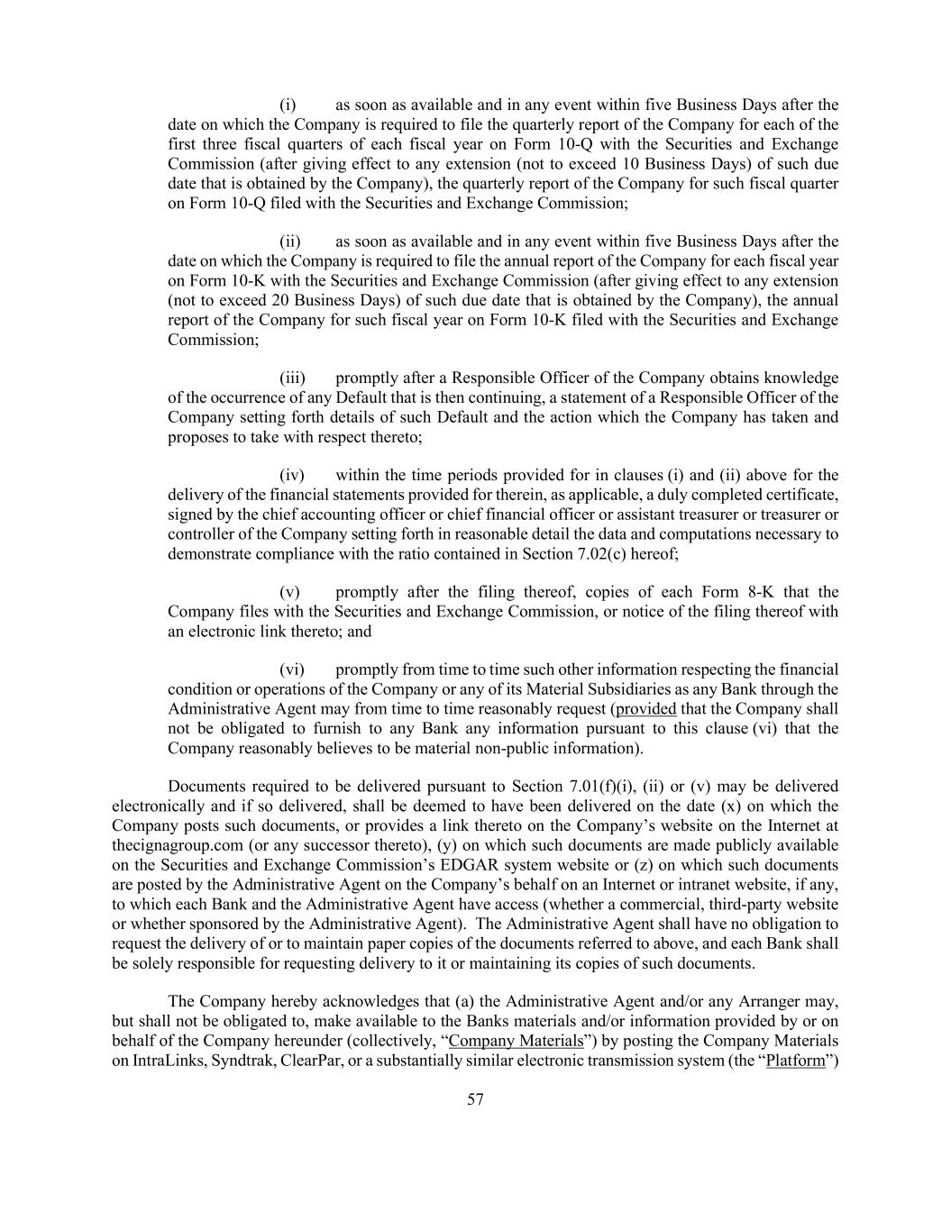 57 (i) as soon as available and in any event within five Business Days after the date on which the Company is required to file the quarterly report of the Company for each of the first three fiscal quarters of each fiscal year on Form 10-Q with the Securities and Exchange Commission (after giving effect to any extension (not to exceed 10 Business Days) of such due date that is obtained by the Company), the quarterly report of the Company for such fiscal quarter on Form 10-Q filed with the Securities and Exchange Commission; (ii) as soon as available and in any event within five Business Days after the date on which the Company is required to file the annual report of the Company for each fiscal year on Form 10-K with the Securities and Exchange Commission (after giving effect to any extension (not to exceed 20 Business Days) of such due date that is obtained by the Company), the annual report of the Company for such fiscal year on Form 10-K filed with the Securities and Exchange Commission; (iii) promptly after a Responsible Officer of the Company obtains knowledge of the occurrence of any Default that is then continuing, a statement of a Responsible Officer of the Company setting forth details of such Default and the action which the Company has taken and proposes to take with respect thereto; (iv) within the time periods provided for in clauses (i) and (ii) above for the delivery of the financial statements provided for therein, as applicable, a duly completed certificate, signed by the chief accounting officer or chief financial officer or assistant treasurer or treasurer or controller of the Company setting forth in reasonable detail the data and computations necessary to demonstrate compliance with the ratio contained in Section 7.02(c) hereof; (v) promptly after the filing thereof, copies of each Form 8-K that the Company files with the Securities and Exchange Commission, or notice of the filing thereof with an electronic link thereto; and (vi) promptly from time to time such other information respecting the financial condition or operations of the Company or any of its Material Subsidiaries as any Bank through the Administrative Agent may from time to time reasonably request (provided that the Company shall not be obligated to furnish to any Bank any information pursuant to this clause (vi) that the Company reasonably believes to be material non-public information). Documents required to be delivered pursuant to Section 7.01(f)(i), (ii) or (v) may be delivered electronically and if so delivered, shall be deemed to have been delivered on the date (x) on which the Company posts such documents, or provides a link thereto on the Company’s website on the Internet at thecignagroup.com (or any successor thereto), (y) on which such documents are made publicly available on the Securities and Exchange Commission’s EDGAR system website or (z) on which such documents are posted by the Administrative Agent on the Company’s behalf on an Internet or intranet website, if any, to which each Bank and the Administrative Agent have access (whether a commercial, third-party website or whether sponsored by the Administrative Agent). The Administrative Agent shall have no obligation to request the delivery of or to maintain paper copies of the documents referred to above, and each Bank shall be solely responsible for requesting delivery to it or maintaining its copies of such documents. The Company hereby acknowledges that (a) the Administrative Agent and/or any Arranger may, but shall not be obligated to, make available to the Banks materials and/or information provided by or on behalf of the Company hereunder (collectively, “Company Materials”) by posting the Company Materials on IntraLinks, Syndtrak, ClearPar, or a substantially similar electronic transmission system (the “Platform”)