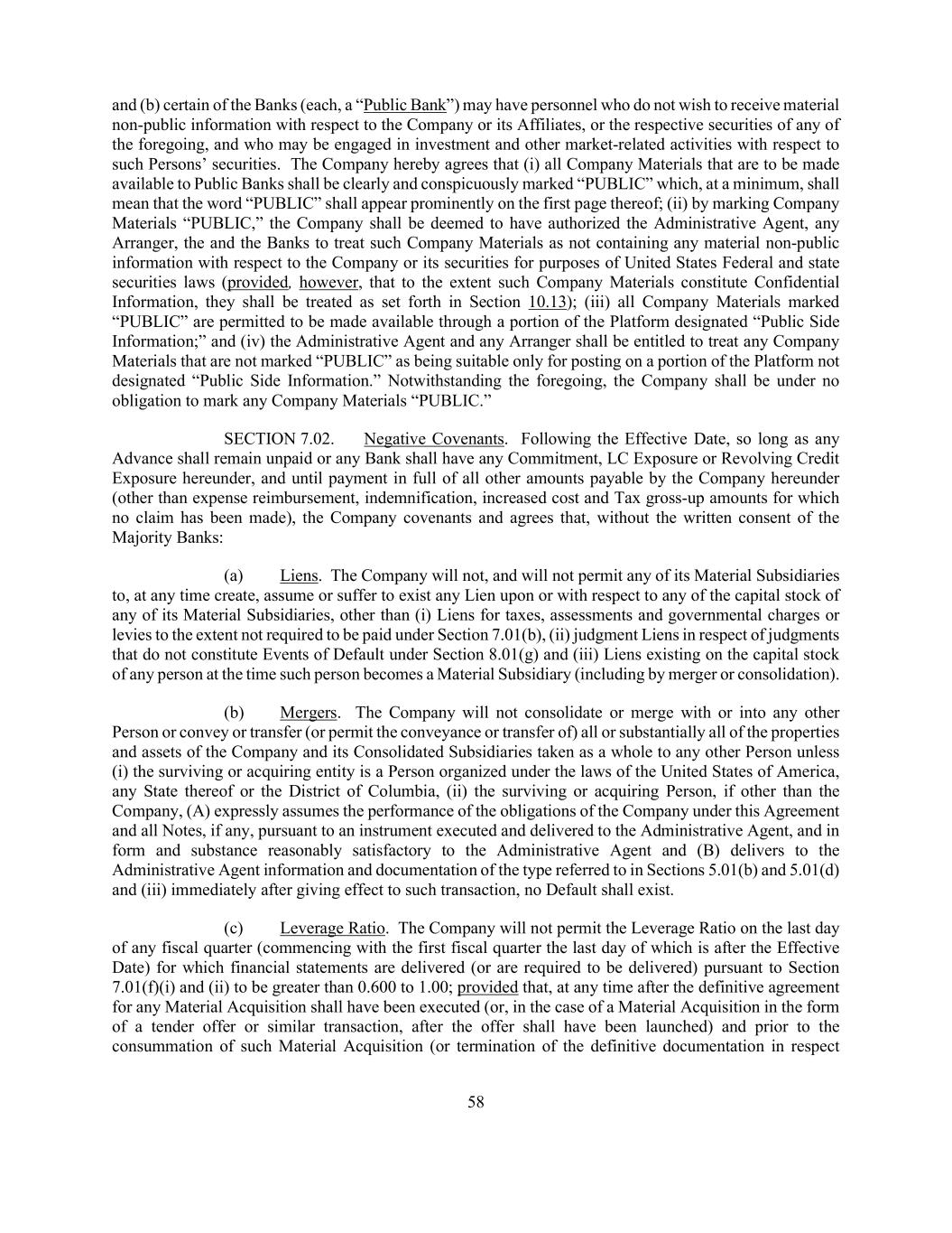 58 and (b) certain of the Banks (each, a “Public Bank”) may have personnel who do not wish to receive material non-public information with respect to the Company or its Affiliates, or the respective securities of any of the foregoing, and who may be engaged in investment and other market-related activities with respect to such Persons’ securities. The Company hereby agrees that (i) all Company Materials that are to be made available to Public Banks shall be clearly and conspicuously marked “PUBLIC” which, at a minimum, shall mean that the word “PUBLIC” shall appear prominently on the first page thereof; (ii) by marking Company Materials “PUBLIC,” the Company shall be deemed to have authorized the Administrative Agent, any Arranger, the and the Banks to treat such Company Materials as not containing any material non-public information with respect to the Company or its securities for purposes of United States Federal and state securities laws (provided, however, that to the extent such Company Materials constitute Confidential Information, they shall be treated as set forth in Section 10.13); (iii) all Company Materials marked “PUBLIC” are permitted to be made available through a portion of the Platform designated “Public Side Information;” and (iv) the Administrative Agent and any Arranger shall be entitled to treat any Company Materials that are not marked “PUBLIC” as being suitable only for posting on a portion of the Platform not designated “Public Side Information.” Notwithstanding the foregoing, the Company shall be under no obligation to mark any Company Materials “PUBLIC.” SECTION 7.02. Negative Covenants. Following the Effective Date, so long as any Advance shall remain unpaid or any Bank shall have any Commitment, LC Exposure or Revolving Credit Exposure hereunder, and until payment in full of all other amounts payable by the Company hereunder (other than expense reimbursement, indemnification, increased cost and Tax gross-up amounts for which no claim has been made), the Company covenants and agrees that, without the written consent of the Majority Banks: (a) Liens. The Company will not, and will not permit any of its Material Subsidiaries to, at any time create, assume or suffer to exist any Lien upon or with respect to any of the capital stock of any of its Material Subsidiaries, other than (i) Liens for taxes, assessments and governmental charges or levies to the extent not required to be paid under Section 7.01(b), (ii) judgment Liens in respect of judgments that do not constitute Events of Default under Section 8.01(g) and (iii) Liens existing on the capital stock of any person at the time such person becomes a Material Subsidiary (including by merger or consolidation). (b) Mergers. The Company will not consolidate or merge with or into any other Person or convey or transfer (or permit the conveyance or transfer of) all or substantially all of the properties and assets of the Company and its Consolidated Subsidiaries taken as a whole to any other Person unless (i) the surviving or acquiring entity is a Person organized under the laws of the United States of America, any State thereof or the District of Columbia, (ii) the surviving or acquiring Person, if other than the Company, (A) expressly assumes the performance of the obligations of the Company under this Agreement and all Notes, if any, pursuant to an instrument executed and delivered to the Administrative Agent, and in form and substance reasonably satisfactory to the Administrative Agent and (B) delivers to the Administrative Agent information and documentation of the type referred to in Sections 5.01(b) and 5.01(d) and (iii) immediately after giving effect to such transaction, no Default shall exist. (c) Leverage Ratio. The Company will not permit the Leverage Ratio on the last day of any fiscal quarter (commencing with the first fiscal quarter the last day of which is after the Effective Date) for which financial statements are delivered (or are required to be delivered) pursuant to Section 7.01(f)(i) and (ii) to be greater than 0.600 to 1.00; provided that, at any time after the definitive agreement for any Material Acquisition shall have been executed (or, in the case of a Material Acquisition in the form of a tender offer or similar transaction, after the offer shall have been launched) and prior to the consummation of such Material Acquisition (or termination of the definitive documentation in respect