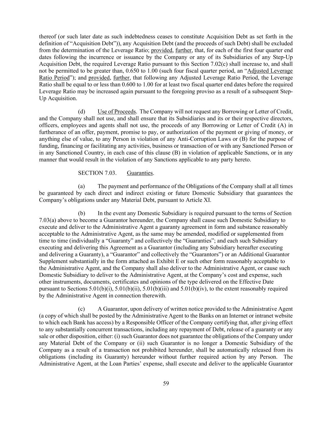 59 thereof (or such later date as such indebtedness ceases to constitute Acquisition Debt as set forth in the definition of “Acquisition Debt”)), any Acquisition Debt (and the proceeds of such Debt) shall be excluded from the determination of the Leverage Ratio; provided, further, that, for each of the first four quarter end dates following the incurrence or issuance by the Company or any of its Subsidiaries of any Step-Up Acquisition Debt, the required Leverage Ratio pursuant to this Section 7.02(c) shall increase to, and shall not be permitted to be greater than, 0.650 to 1.00 (such four fiscal quarter period, an “Adjusted Leverage Ratio Period”); and provided, further, that following any Adjusted Leverage Ratio Period, the Leverage Ratio shall be equal to or less than 0.600 to 1.00 for at least two fiscal quarter end dates before the required Leverage Ratio may be increased again pursuant to the foregoing proviso as a result of a subsequent Step- Up Acquisition. (d) Use of Proceeds. The Company will not request any Borrowing or Letter of Credit, and the Company shall not use, and shall ensure that its Subsidiaries and its or their respective directors, officers, employees and agents shall not use, the proceeds of any Borrowing or Letter of Credit (A) in furtherance of an offer, payment, promise to pay, or authorization of the payment or giving of money, or anything else of value, to any Person in violation of any Anti-Corruption Laws or (B) for the purpose of funding, financing or facilitating any activities, business or transaction of or with any Sanctioned Person or in any Sanctioned Country, in each case of this clause (B) in violation of applicable Sanctions, or in any manner that would result in the violation of any Sanctions applicable to any party hereto. SECTION 7.03. Guaranties. (a) The payment and performance of the Obligations of the Company shall at all times be guaranteed by each direct and indirect existing or future Domestic Subsidiary that guarantees the Company’s obligations under any Material Debt, pursuant to Article XI. (b) In the event any Domestic Subsidiary is required pursuant to the terms of Section 7.03(a) above to become a Guarantor hereunder, the Company shall cause such Domestic Subsidiary to execute and deliver to the Administrative Agent a guaranty agreement in form and substance reasonably acceptable to the Administrative Agent, as the same may be amended, modified or supplemented from time to time (individually a “Guaranty” and collectively the “Guaranties”; and each such Subsidiary executing and delivering this Agreement as a Guarantor (including any Subsidiary hereafter executing and delivering a Guaranty), a “Guarantor” and collectively the “Guarantors”) or an Additional Guarantor Supplement substantially in the form attached as Exhibit E or such other form reasonably acceptable to the Administrative Agent, and the Company shall also deliver to the Administrative Agent, or cause such Domestic Subsidiary to deliver to the Administrative Agent, at the Company’s cost and expense, such other instruments, documents, certificates and opinions of the type delivered on the Effective Date pursuant to Sections 5.01(b)(i), 5.01(b)(ii), 5.01(b)(iii) and 5.01(b)(iv), to the extent reasonably required by the Administrative Agent in connection therewith. (c) A Guarantor, upon delivery of written notice provided to the Administrative Agent (a copy of which shall be posted by the Administrative Agent to the Banks on an Internet or intranet website to which each Bank has access) by a Responsible Officer of the Company certifying that, after giving effect to any substantially concurrent transactions, including any repayment of Debt, release of a guaranty or any sale or other disposition, either: (i) such Guarantor does not guarantee the obligations of the Company under any Material Debt of the Company or (ii) such Guarantor is no longer a Domestic Subsidiary of the Company as a result of a transaction not prohibited hereunder, shall be automatically released from its obligations (including its Guaranty) hereunder without further required action by any Person. The Administrative Agent, at the Loan Parties’ expense, shall execute and deliver to the applicable Guarantor