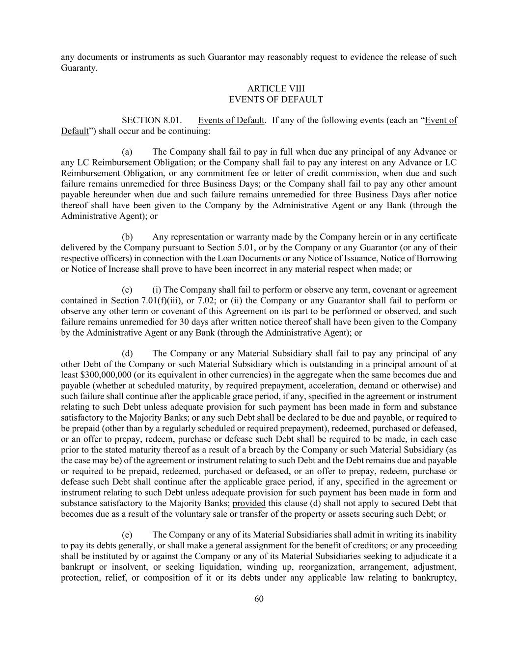 60 any documents or instruments as such Guarantor may reasonably request to evidence the release of such Guaranty. ARTICLE VIII EVENTS OF DEFAULT SECTION 8.01. Events of Default. If any of the following events (each an “Event of Default”) shall occur and be continuing: (a) The Company shall fail to pay in full when due any principal of any Advance or any LC Reimbursement Obligation; or the Company shall fail to pay any interest on any Advance or LC Reimbursement Obligation, or any commitment fee or letter of credit commission, when due and such failure remains unremedied for three Business Days; or the Company shall fail to pay any other amount payable hereunder when due and such failure remains unremedied for three Business Days after notice thereof shall have been given to the Company by the Administrative Agent or any Bank (through the Administrative Agent); or (b) Any representation or warranty made by the Company herein or in any certificate delivered by the Company pursuant to Section 5.01, or by the Company or any Guarantor (or any of their respective officers) in connection with the Loan Documents or any Notice of Issuance, Notice of Borrowing or Notice of Increase shall prove to have been incorrect in any material respect when made; or (c) (i) The Company shall fail to perform or observe any term, covenant or agreement contained in Section 7.01(f)(iii), or 7.02; or (ii) the Company or any Guarantor shall fail to perform or observe any other term or covenant of this Agreement on its part to be performed or observed, and such failure remains unremedied for 30 days after written notice thereof shall have been given to the Company by the Administrative Agent or any Bank (through the Administrative Agent); or (d) The Company or any Material Subsidiary shall fail to pay any principal of any other Debt of the Company or such Material Subsidiary which is outstanding in a principal amount of at least $300,000,000 (or its equivalent in other currencies) in the aggregate when the same becomes due and payable (whether at scheduled maturity, by required prepayment, acceleration, demand or otherwise) and such failure shall continue after the applicable grace period, if any, specified in the agreement or instrument relating to such Debt unless adequate provision for such payment has been made in form and substance satisfactory to the Majority Banks; or any such Debt shall be declared to be due and payable, or required to be prepaid (other than by a regularly scheduled or required prepayment), redeemed, purchased or defeased, or an offer to prepay, redeem, purchase or defease such Debt shall be required to be made, in each case prior to the stated maturity thereof as a result of a breach by the Company or such Material Subsidiary (as the case may be) of the agreement or instrument relating to such Debt and the Debt remains due and payable or required to be prepaid, redeemed, purchased or defeased, or an offer to prepay, redeem, purchase or defease such Debt shall continue after the applicable grace period, if any, specified in the agreement or instrument relating to such Debt unless adequate provision for such payment has been made in form and substance satisfactory to the Majority Banks; provided this clause (d) shall not apply to secured Debt that becomes due as a result of the voluntary sale or transfer of the property or assets securing such Debt; or (e) The Company or any of its Material Subsidiaries shall admit in writing its inability to pay its debts generally, or shall make a general assignment for the benefit of creditors; or any proceeding shall be instituted by or against the Company or any of its Material Subsidiaries seeking to adjudicate it a bankrupt or insolvent, or seeking liquidation, winding up, reorganization, arrangement, adjustment, protection, relief, or composition of it or its debts under any applicable law relating to bankruptcy,