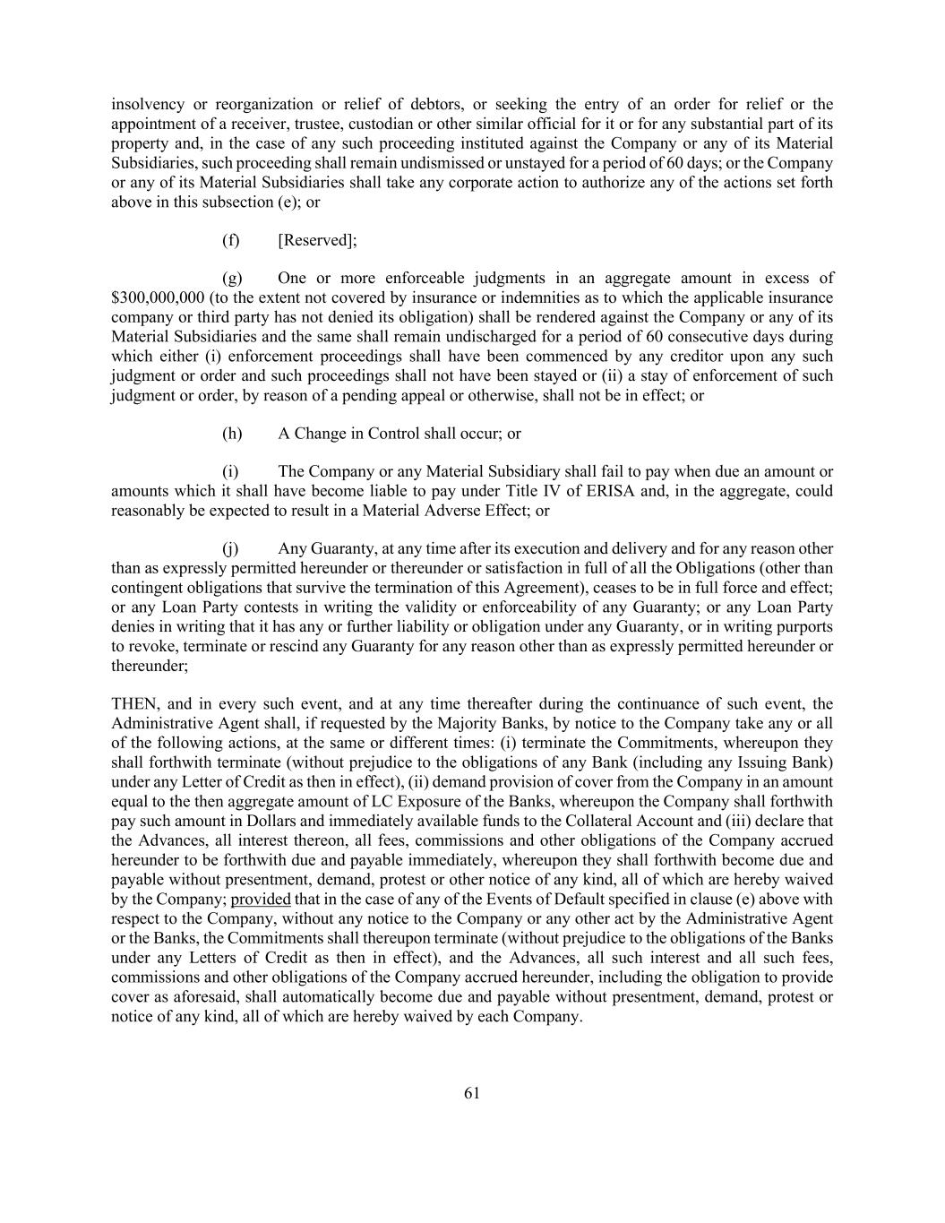 61 insolvency or reorganization or relief of debtors, or seeking the entry of an order for relief or the appointment of a receiver, trustee, custodian or other similar official for it or for any substantial part of its property and, in the case of any such proceeding instituted against the Company or any of its Material Subsidiaries, such proceeding shall remain undismissed or unstayed for a period of 60 days; or the Company or any of its Material Subsidiaries shall take any corporate action to authorize any of the actions set forth above in this subsection (e); or (f) [Reserved]; (g) One or more enforceable judgments in an aggregate amount in excess of $300,000,000 (to the extent not covered by insurance or indemnities as to which the applicable insurance company or third party has not denied its obligation) shall be rendered against the Company or any of its Material Subsidiaries and the same shall remain undischarged for a period of 60 consecutive days during which either (i) enforcement proceedings shall have been commenced by any creditor upon any such judgment or order and such proceedings shall not have been stayed or (ii) a stay of enforcement of such judgment or order, by reason of a pending appeal or otherwise, shall not be in effect; or (h) A Change in Control shall occur; or (i) The Company or any Material Subsidiary shall fail to pay when due an amount or amounts which it shall have become liable to pay under Title IV of ERISA and, in the aggregate, could reasonably be expected to result in a Material Adverse Effect; or (j) Any Guaranty, at any time after its execution and delivery and for any reason other than as expressly permitted hereunder or thereunder or satisfaction in full of all the Obligations (other than contingent obligations that survive the termination of this Agreement), ceases to be in full force and effect; or any Loan Party contests in writing the validity or enforceability of any Guaranty; or any Loan Party denies in writing that it has any or further liability or obligation under any Guaranty, or in writing purports to revoke, terminate or rescind any Guaranty for any reason other than as expressly permitted hereunder or thereunder; THEN, and in every such event, and at any time thereafter during the continuance of such event, the Administrative Agent shall, if requested by the Majority Banks, by notice to the Company take any or all of the following actions, at the same or different times: (i) terminate the Commitments, whereupon they shall forthwith terminate (without prejudice to the obligations of any Bank (including any Issuing Bank) under any Letter of Credit as then in effect), (ii) demand provision of cover from the Company in an amount equal to the then aggregate amount of LC Exposure of the Banks, whereupon the Company shall forthwith pay such amount in Dollars and immediately available funds to the Collateral Account and (iii) declare that the Advances, all interest thereon, all fees, commissions and other obligations of the Company accrued hereunder to be forthwith due and payable immediately, whereupon they shall forthwith become due and payable without presentment, demand, protest or other notice of any kind, all of which are hereby waived by the Company; provided that in the case of any of the Events of Default specified in clause (e) above with respect to the Company, without any notice to the Company or any other act by the Administrative Agent or the Banks, the Commitments shall thereupon terminate (without prejudice to the obligations of the Banks under any Letters of Credit as then in effect), and the Advances, all such interest and all such fees, commissions and other obligations of the Company accrued hereunder, including the obligation to provide cover as aforesaid, shall automatically become due and payable without presentment, demand, protest or notice of any kind, all of which are hereby waived by each Company.