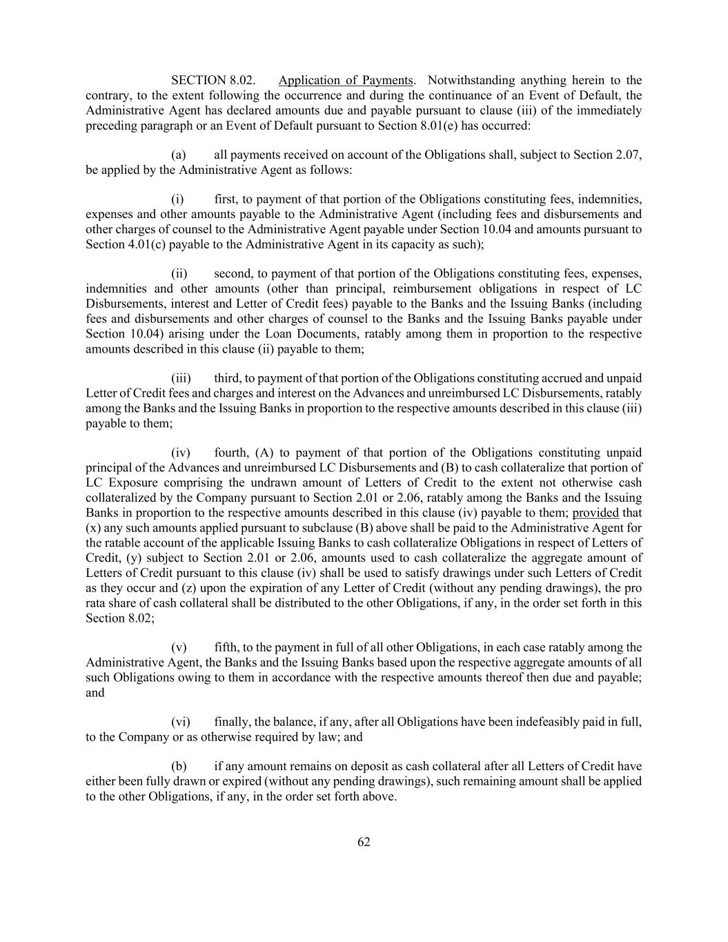 62 SECTION 8.02. Application of Payments. Notwithstanding anything herein to the contrary, to the extent following the occurrence and during the continuance of an Event of Default, the Administrative Agent has declared amounts due and payable pursuant to clause (iii) of the immediately preceding paragraph or an Event of Default pursuant to Section 8.01(e) has occurred: (a) all payments received on account of the Obligations shall, subject to Section 2.07, be applied by the Administrative Agent as follows: (i) first, to payment of that portion of the Obligations constituting fees, indemnities, expenses and other amounts payable to the Administrative Agent (including fees and disbursements and other charges of counsel to the Administrative Agent payable under Section 10.04 and amounts pursuant to Section 4.01(c) payable to the Administrative Agent in its capacity as such); (ii) second, to payment of that portion of the Obligations constituting fees, expenses, indemnities and other amounts (other than principal, reimbursement obligations in respect of LC Disbursements, interest and Letter of Credit fees) payable to the Banks and the Issuing Banks (including fees and disbursements and other charges of counsel to the Banks and the Issuing Banks payable under Section 10.04) arising under the Loan Documents, ratably among them in proportion to the respective amounts described in this clause (ii) payable to them; (iii) third, to payment of that portion of the Obligations constituting accrued and unpaid Letter of Credit fees and charges and interest on the Advances and unreimbursed LC Disbursements, ratably among the Banks and the Issuing Banks in proportion to the respective amounts described in this clause (iii) payable to them; (iv) fourth, (A) to payment of that portion of the Obligations constituting unpaid principal of the Advances and unreimbursed LC Disbursements and (B) to cash collateralize that portion of LC Exposure comprising the undrawn amount of Letters of Credit to the extent not otherwise cash collateralized by the Company pursuant to Section 2.01 or 2.06, ratably among the Banks and the Issuing Banks in proportion to the respective amounts described in this clause (iv) payable to them; provided that (x) any such amounts applied pursuant to subclause (B) above shall be paid to the Administrative Agent for the ratable account of the applicable Issuing Banks to cash collateralize Obligations in respect of Letters of Credit, (y) subject to Section 2.01 or 2.06, amounts used to cash collateralize the aggregate amount of Letters of Credit pursuant to this clause (iv) shall be used to satisfy drawings under such Letters of Credit as they occur and (z) upon the expiration of any Letter of Credit (without any pending drawings), the pro rata share of cash collateral shall be distributed to the other Obligations, if any, in the order set forth in this Section 8.02; (v) fifth, to the payment in full of all other Obligations, in each case ratably among the Administrative Agent, the Banks and the Issuing Banks based upon the respective aggregate amounts of all such Obligations owing to them in accordance with the respective amounts thereof then due and payable; and (vi) finally, the balance, if any, after all Obligations have been indefeasibly paid in full, to the Company or as otherwise required by law; and (b) if any amount remains on deposit as cash collateral after all Letters of Credit have either been fully drawn or expired (without any pending drawings), such remaining amount shall be applied to the other Obligations, if any, in the order set forth above.