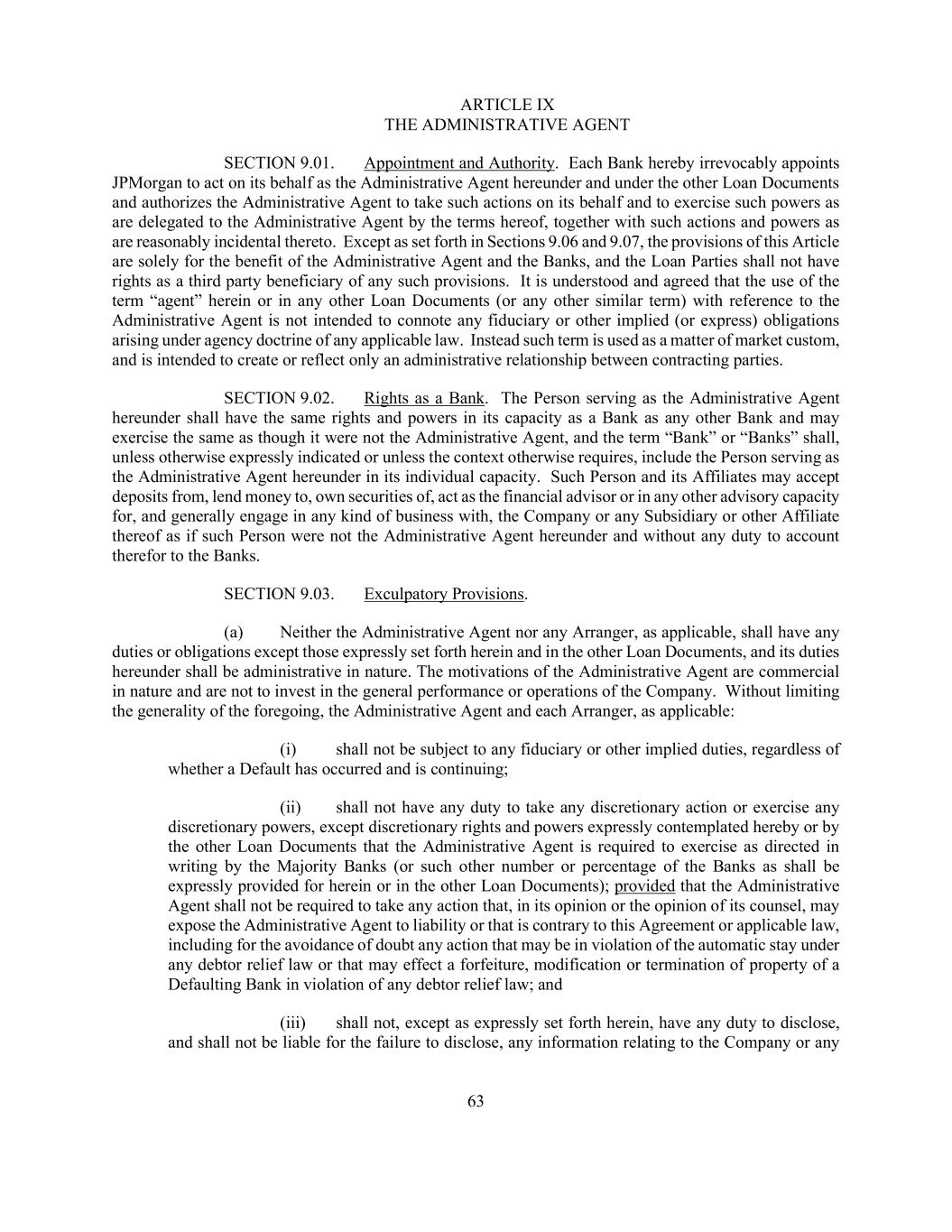 63 ARTICLE IX THE ADMINISTRATIVE AGENT SECTION 9.01. Appointment and Authority. Each Bank hereby irrevocably appoints JPMorgan to act on its behalf as the Administrative Agent hereunder and under the other Loan Documents and authorizes the Administrative Agent to take such actions on its behalf and to exercise such powers as are delegated to the Administrative Agent by the terms hereof, together with such actions and powers as are reasonably incidental thereto. Except as set forth in Sections 9.06 and 9.07, the provisions of this Article are solely for the benefit of the Administrative Agent and the Banks, and the Loan Parties shall not have rights as a third party beneficiary of any such provisions. It is understood and agreed that the use of the term “agent” herein or in any other Loan Documents (or any other similar term) with reference to the Administrative Agent is not intended to connote any fiduciary or other implied (or express) obligations arising under agency doctrine of any applicable law. Instead such term is used as a matter of market custom, and is intended to create or reflect only an administrative relationship between contracting parties. SECTION 9.02. Rights as a Bank. The Person serving as the Administrative Agent hereunder shall have the same rights and powers in its capacity as a Bank as any other Bank and may exercise the same as though it were not the Administrative Agent, and the term “Bank” or “Banks” shall, unless otherwise expressly indicated or unless the context otherwise requires, include the Person serving as the Administrative Agent hereunder in its individual capacity. Such Person and its Affiliates may accept deposits from, lend money to, own securities of, act as the financial advisor or in any other advisory capacity for, and generally engage in any kind of business with, the Company or any Subsidiary or other Affiliate thereof as if such Person were not the Administrative Agent hereunder and without any duty to account therefor to the Banks. SECTION 9.03. Exculpatory Provisions. (a) Neither the Administrative Agent nor any Arranger, as applicable, shall have any duties or obligations except those expressly set forth herein and in the other Loan Documents, and its duties hereunder shall be administrative in nature. The motivations of the Administrative Agent are commercial in nature and are not to invest in the general performance or operations of the Company. Without limiting the generality of the foregoing, the Administrative Agent and each Arranger, as applicable: (i) shall not be subject to any fiduciary or other implied duties, regardless of whether a Default has occurred and is continuing; (ii) shall not have any duty to take any discretionary action or exercise any discretionary powers, except discretionary rights and powers expressly contemplated hereby or by the other Loan Documents that the Administrative Agent is required to exercise as directed in writing by the Majority Banks (or such other number or percentage of the Banks as shall be expressly provided for herein or in the other Loan Documents); provided that the Administrative Agent shall not be required to take any action that, in its opinion or the opinion of its counsel, may expose the Administrative Agent to liability or that is contrary to this Agreement or applicable law, including for the avoidance of doubt any action that may be in violation of the automatic stay under any debtor relief law or that may effect a forfeiture, modification or termination of property of a Defaulting Bank in violation of any debtor relief law; and (iii) shall not, except as expressly set forth herein, have any duty to disclose, and shall not be liable for the failure to disclose, any information relating to the Company or any