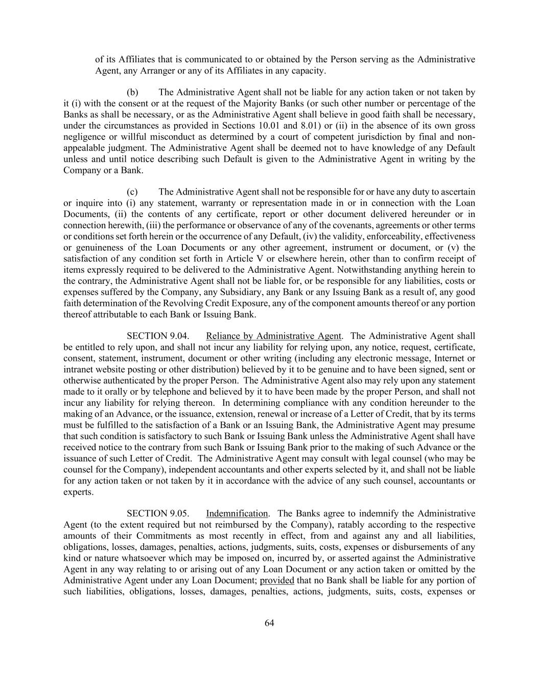 64 of its Affiliates that is communicated to or obtained by the Person serving as the Administrative Agent, any Arranger or any of its Affiliates in any capacity. (b) The Administrative Agent shall not be liable for any action taken or not taken by it (i) with the consent or at the request of the Majority Banks (or such other number or percentage of the Banks as shall be necessary, or as the Administrative Agent shall believe in good faith shall be necessary, under the circumstances as provided in Sections 10.01 and 8.01) or (ii) in the absence of its own gross negligence or willful misconduct as determined by a court of competent jurisdiction by final and non- appealable judgment. The Administrative Agent shall be deemed not to have knowledge of any Default unless and until notice describing such Default is given to the Administrative Agent in writing by the Company or a Bank. (c) The Administrative Agent shall not be responsible for or have any duty to ascertain or inquire into (i) any statement, warranty or representation made in or in connection with the Loan Documents, (ii) the contents of any certificate, report or other document delivered hereunder or in connection herewith, (iii) the performance or observance of any of the covenants, agreements or other terms or conditions set forth herein or the occurrence of any Default, (iv) the validity, enforceability, effectiveness or genuineness of the Loan Documents or any other agreement, instrument or document, or (v) the satisfaction of any condition set forth in Article V or elsewhere herein, other than to confirm receipt of items expressly required to be delivered to the Administrative Agent. Notwithstanding anything herein to the contrary, the Administrative Agent shall not be liable for, or be responsible for any liabilities, costs or expenses suffered by the Company, any Subsidiary, any Bank or any Issuing Bank as a result of, any good faith determination of the Revolving Credit Exposure, any of the component amounts thereof or any portion thereof attributable to each Bank or Issuing Bank. SECTION 9.04. Reliance by Administrative Agent. The Administrative Agent shall be entitled to rely upon, and shall not incur any liability for relying upon, any notice, request, certificate, consent, statement, instrument, document or other writing (including any electronic message, Internet or intranet website posting or other distribution) believed by it to be genuine and to have been signed, sent or otherwise authenticated by the proper Person. The Administrative Agent also may rely upon any statement made to it orally or by telephone and believed by it to have been made by the proper Person, and shall not incur any liability for relying thereon. In determining compliance with any condition hereunder to the making of an Advance, or the issuance, extension, renewal or increase of a Letter of Credit, that by its terms must be fulfilled to the satisfaction of a Bank or an Issuing Bank, the Administrative Agent may presume that such condition is satisfactory to such Bank or Issuing Bank unless the Administrative Agent shall have received notice to the contrary from such Bank or Issuing Bank prior to the making of such Advance or the issuance of such Letter of Credit. The Administrative Agent may consult with legal counsel (who may be counsel for the Company), independent accountants and other experts selected by it, and shall not be liable for any action taken or not taken by it in accordance with the advice of any such counsel, accountants or experts. SECTION 9.05. Indemnification. The Banks agree to indemnify the Administrative Agent (to the extent required but not reimbursed by the Company), ratably according to the respective amounts of their Commitments as most recently in effect, from and against any and all liabilities, obligations, losses, damages, penalties, actions, judgments, suits, costs, expenses or disbursements of any kind or nature whatsoever which may be imposed on, incurred by, or asserted against the Administrative Agent in any way relating to or arising out of any Loan Document or any action taken or omitted by the Administrative Agent under any Loan Document; provided that no Bank shall be liable for any portion of such liabilities, obligations, losses, damages, penalties, actions, judgments, suits, costs, expenses or
