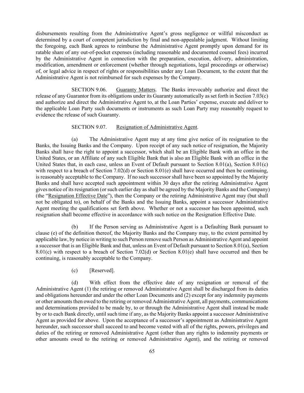65 disbursements resulting from the Administrative Agent’s gross negligence or willful misconduct as determined by a court of competent jurisdiction by final and non-appealable judgment. Without limiting the foregoing, each Bank agrees to reimburse the Administrative Agent promptly upon demand for its ratable share of any out-of-pocket expenses (including reasonable and documented counsel fees) incurred by the Administrative Agent in connection with the preparation, execution, delivery, administration, modification, amendment or enforcement (whether through negotiations, legal proceedings or otherwise) of, or legal advice in respect of rights or responsibilities under any Loan Document, to the extent that the Administrative Agent is not reimbursed for such expenses by the Company. SECTION 9.06. Guaranty Matters. The Banks irrevocably authorize and direct the release of any Guarantor from its obligations under its Guaranty automatically as set forth in Section 7.03(c) and authorize and direct the Administrative Agent to, at the Loan Parties’ expense, execute and deliver to the applicable Loan Party such documents or instruments as such Loan Party may reasonably request to evidence the release of such Guaranty. SECTION 9.07. Resignation of Administrative Agent. (a) The Administrative Agent may at any time give notice of its resignation to the Banks, the Issuing Banks and the Company. Upon receipt of any such notice of resignation, the Majority Banks shall have the right to appoint a successor, which shall be an Eligible Bank with an office in the United States, or an Affiliate of any such Eligible Bank that is also an Eligible Bank with an office in the United States that, in each case, unless an Event of Default pursuant to Section 8.01(a), Section 8.01(c) with respect to a breach of Section 7.02(d) or Section 8.01(e) shall have occurred and then be continuing, is reasonably acceptable to the Company. If no such successor shall have been so appointed by the Majority Banks and shall have accepted such appointment within 30 days after the retiring Administrative Agent gives notice of its resignation (or such earlier day as shall be agreed by the Majority Banks and the Company) (the “Resignation Effective Date”), then the Company or the retiring Administrative Agent may (but shall not be obligated to), on behalf of the Banks and the Issuing Banks, appoint a successor Administrative Agent meeting the qualifications set forth above. Whether or not a successor has been appointed, such resignation shall become effective in accordance with such notice on the Resignation Effective Date. (b) If the Person serving as Administrative Agent is a Defaulting Bank pursuant to clause (e) of the definition thereof, the Majority Banks and the Company may, to the extent permitted by applicable law, by notice in writing to such Person remove such Person as Administrative Agent and appoint a successor that is an Eligible Bank and that, unless an Event of Default pursuant to Section 8.01(a), Section 8.01(c) with respect to a breach of Section 7.02(d) or Section 8.01(e) shall have occurred and then be continuing, is reasonably acceptable to the Company. (c) [Reserved]. (d) With effect from the effective date of any resignation or removal of the Administrative Agent (1) the retiring or removed Administrative Agent shall be discharged from its duties and obligations hereunder and under the other Loan Documents and (2) except for any indemnity payments or other amounts then owed to the retiring or removed Administrative Agent, all payments, communications and determinations provided to be made by, to or through the Administrative Agent shall instead be made by or to each Bank directly, until such time if any, as the Majority Banks appoint a successor Administrative Agent as provided for above. Upon the acceptance of a successor’s appointment as Administrative Agent hereunder, such successor shall succeed to and become vested with all of the rights, powers, privileges and duties of the retiring or removed Administrative Agent (other than any rights to indemnity payments or other amounts owed to the retiring or removed Administrative Agent), and the retiring or removed