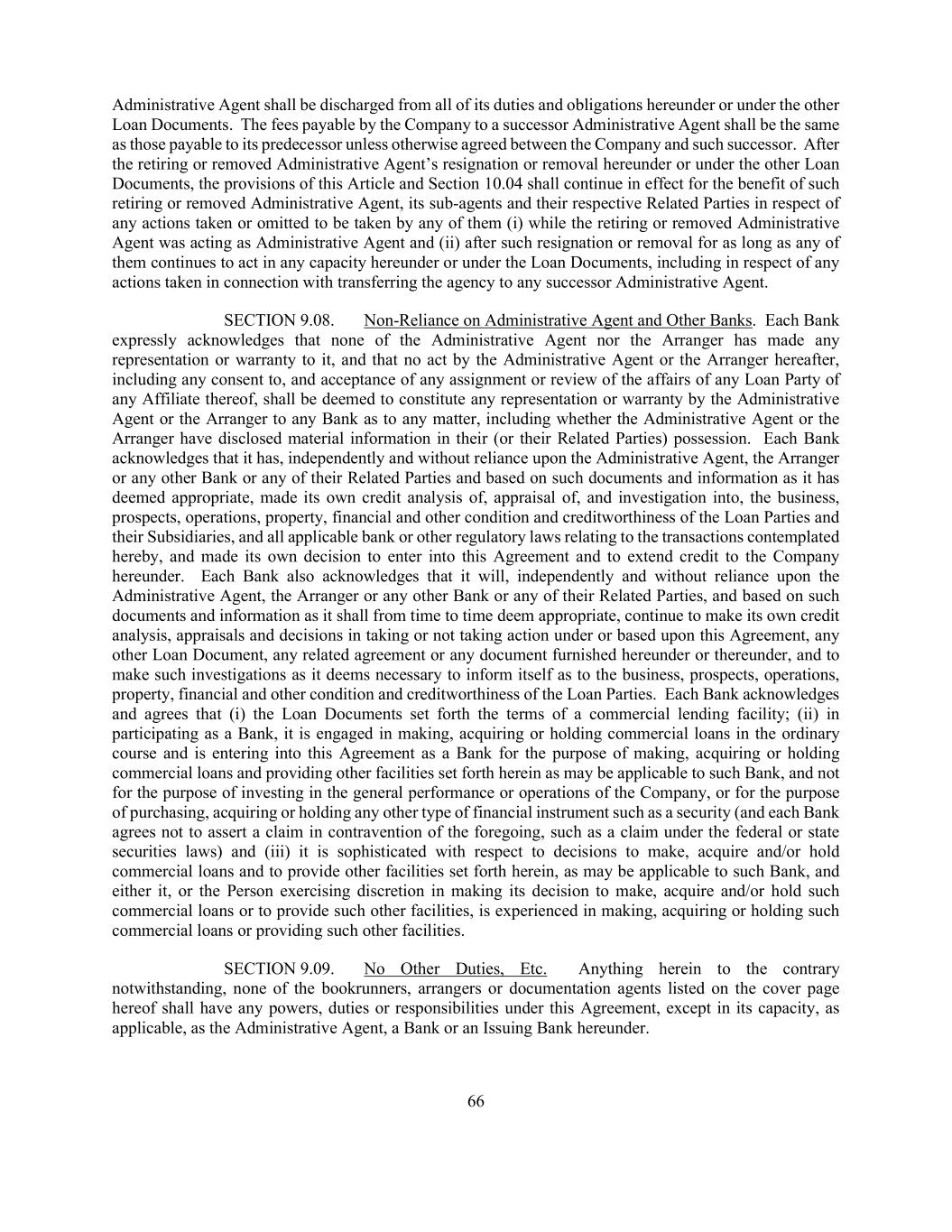 66 Administrative Agent shall be discharged from all of its duties and obligations hereunder or under the other Loan Documents. The fees payable by the Company to a successor Administrative Agent shall be the same as those payable to its predecessor unless otherwise agreed between the Company and such successor. After the retiring or removed Administrative Agent’s resignation or removal hereunder or under the other Loan Documents, the provisions of this Article and Section 10.04 shall continue in effect for the benefit of such retiring or removed Administrative Agent, its sub-agents and their respective Related Parties in respect of any actions taken or omitted to be taken by any of them (i) while the retiring or removed Administrative Agent was acting as Administrative Agent and (ii) after such resignation or removal for as long as any of them continues to act in any capacity hereunder or under the Loan Documents, including in respect of any actions taken in connection with transferring the agency to any successor Administrative Agent. SECTION 9.08. Non-Reliance on Administrative Agent and Other Banks. Each Bank expressly acknowledges that none of the Administrative Agent nor the Arranger has made any representation or warranty to it, and that no act by the Administrative Agent or the Arranger hereafter, including any consent to, and acceptance of any assignment or review of the affairs of any Loan Party of any Affiliate thereof, shall be deemed to constitute any representation or warranty by the Administrative Agent or the Arranger to any Bank as to any matter, including whether the Administrative Agent or the Arranger have disclosed material information in their (or their Related Parties) possession. Each Bank acknowledges that it has, independently and without reliance upon the Administrative Agent, the Arranger or any other Bank or any of their Related Parties and based on such documents and information as it has deemed appropriate, made its own credit analysis of, appraisal of, and investigation into, the business, prospects, operations, property, financial and other condition and creditworthiness of the Loan Parties and their Subsidiaries, and all applicable bank or other regulatory laws relating to the transactions contemplated hereby, and made its own decision to enter into this Agreement and to extend credit to the Company hereunder. Each Bank also acknowledges that it will, independently and without reliance upon the Administrative Agent, the Arranger or any other Bank or any of their Related Parties, and based on such documents and information as it shall from time to time deem appropriate, continue to make its own credit analysis, appraisals and decisions in taking or not taking action under or based upon this Agreement, any other Loan Document, any related agreement or any document furnished hereunder or thereunder, and to make such investigations as it deems necessary to inform itself as to the business, prospects, operations, property, financial and other condition and creditworthiness of the Loan Parties. Each Bank acknowledges and agrees that (i) the Loan Documents set forth the terms of a commercial lending facility; (ii) in participating as a Bank, it is engaged in making, acquiring or holding commercial loans in the ordinary course and is entering into this Agreement as a Bank for the purpose of making, acquiring or holding commercial loans and providing other facilities set forth herein as may be applicable to such Bank, and not for the purpose of investing in the general performance or operations of the Company, or for the purpose of purchasing, acquiring or holding any other type of financial instrument such as a security (and each Bank agrees not to assert a claim in contravention of the foregoing, such as a claim under the federal or state securities laws) and (iii) it is sophisticated with respect to decisions to make, acquire and/or hold commercial loans and to provide other facilities set forth herein, as may be applicable to such Bank, and either it, or the Person exercising discretion in making its decision to make, acquire and/or hold such commercial loans or to provide such other facilities, is experienced in making, acquiring or holding such commercial loans or providing such other facilities. SECTION 9.09. No Other Duties, Etc. Anything herein to the contrary notwithstanding, none of the bookrunners, arrangers or documentation agents listed on the cover page hereof shall have any powers, duties or responsibilities under this Agreement, except in its capacity, as applicable, as the Administrative Agent, a Bank or an Issuing Bank hereunder.