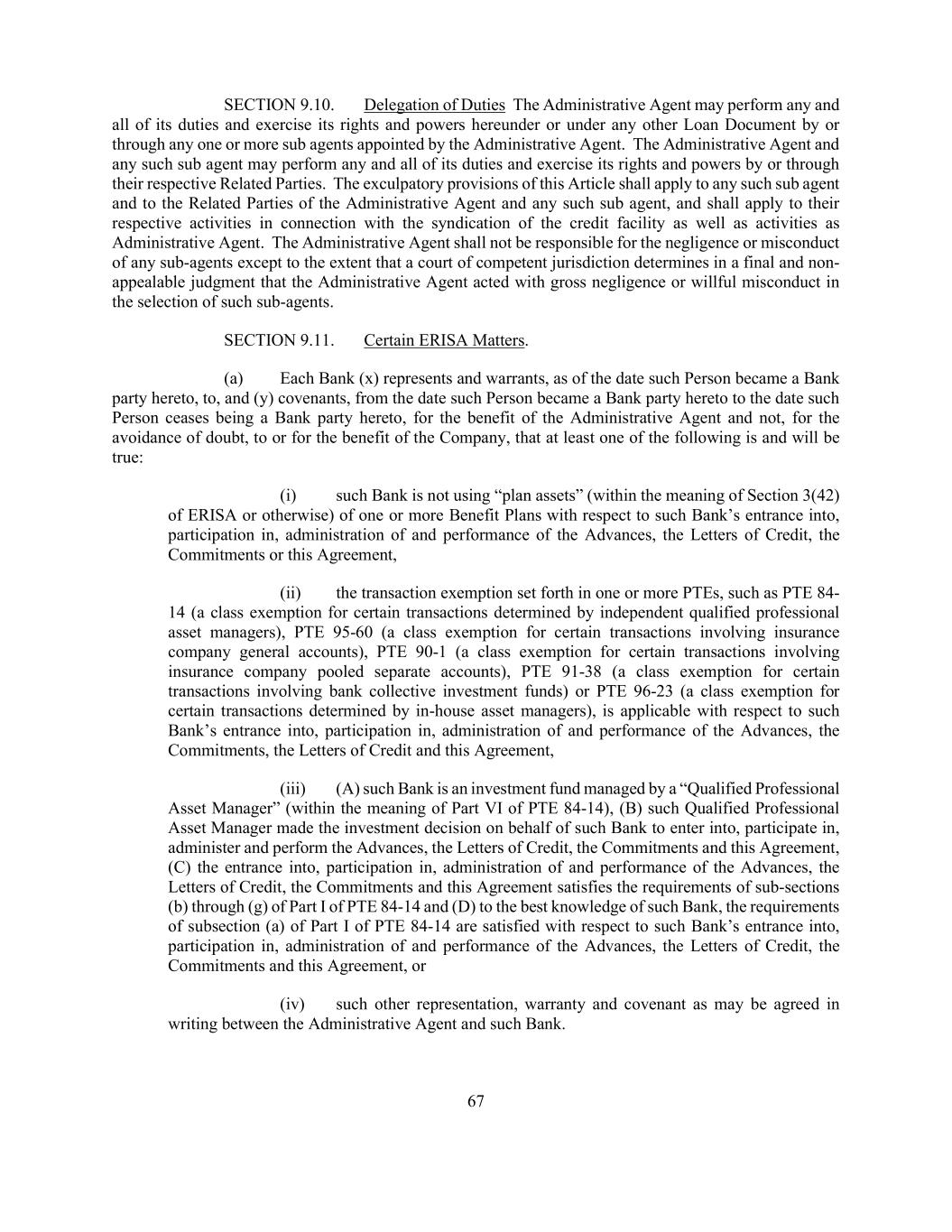 67 SECTION 9.10. Delegation of Duties The Administrative Agent may perform any and all of its duties and exercise its rights and powers hereunder or under any other Loan Document by or through any one or more sub agents appointed by the Administrative Agent. The Administrative Agent and any such sub agent may perform any and all of its duties and exercise its rights and powers by or through their respective Related Parties. The exculpatory provisions of this Article shall apply to any such sub agent and to the Related Parties of the Administrative Agent and any such sub agent, and shall apply to their respective activities in connection with the syndication of the credit facility as well as activities as Administrative Agent. The Administrative Agent shall not be responsible for the negligence or misconduct of any sub-agents except to the extent that a court of competent jurisdiction determines in a final and non- appealable judgment that the Administrative Agent acted with gross negligence or willful misconduct in the selection of such sub-agents. SECTION 9.11. Certain ERISA Matters. (a) Each Bank (x) represents and warrants, as of the date such Person became a Bank party hereto, to, and (y) covenants, from the date such Person became a Bank party hereto to the date such Person ceases being a Bank party hereto, for the benefit of the Administrative Agent and not, for the avoidance of doubt, to or for the benefit of the Company, that at least one of the following is and will be true: (i) such Bank is not using “plan assets” (within the meaning of Section 3(42) of ERISA or otherwise) of one or more Benefit Plans with respect to such Bank’s entrance into, participation in, administration of and performance of the Advances, the Letters of Credit, the Commitments or this Agreement, (ii) the transaction exemption set forth in one or more PTEs, such as PTE 84- 14 (a class exemption for certain transactions determined by independent qualified professional asset managers), PTE 95-60 (a class exemption for certain transactions involving insurance company general accounts), PTE 90-1 (a class exemption for certain transactions involving insurance company pooled separate accounts), PTE 91-38 (a class exemption for certain transactions involving bank collective investment funds) or PTE 96-23 (a class exemption for certain transactions determined by in-house asset managers), is applicable with respect to such Bank’s entrance into, participation in, administration of and performance of the Advances, the Commitments, the Letters of Credit and this Agreement, (iii) (A) such Bank is an investment fund managed by a “Qualified Professional Asset Manager” (within the meaning of Part VI of PTE 84-14), (B) such Qualified Professional Asset Manager made the investment decision on behalf of such Bank to enter into, participate in, administer and perform the Advances, the Letters of Credit, the Commitments and this Agreement, (C) the entrance into, participation in, administration of and performance of the Advances, the Letters of Credit, the Commitments and this Agreement satisfies the requirements of sub-sections (b) through (g) of Part I of PTE 84-14 and (D) to the best knowledge of such Bank, the requirements of subsection (a) of Part I of PTE 84-14 are satisfied with respect to such Bank’s entrance into, participation in, administration of and performance of the Advances, the Letters of Credit, the Commitments and this Agreement, or (iv) such other representation, warranty and covenant as may be agreed in writing between the Administrative Agent and such Bank.