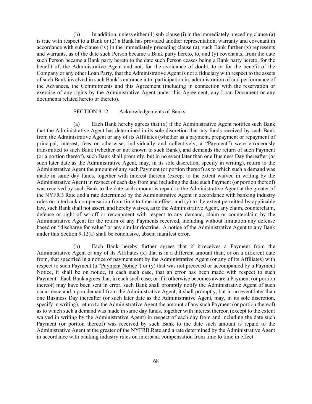 68 (b) In addition, unless either (1) sub-clause (i) in the immediately preceding clause (a) is true with respect to a Bank or (2) a Bank has provided another representation, warranty and covenant in accordance with sub-clause (iv) in the immediately preceding clause (a), such Bank further (x) represents and warrants, as of the date such Person became a Bank party hereto, to, and (y) covenants, from the date such Person became a Bank party hereto to the date such Person ceases being a Bank party hereto, for the benefit of, the Administrative Agent and not, for the avoidance of doubt, to or for the benefit of the Company or any other Loan Party, that the Administrative Agent is not a fiduciary with respect to the assets of such Bank involved in such Bank’s entrance into, participation in, administration of and performance of the Advances, the Commitments and this Agreement (including in connection with the reservation or exercise of any rights by the Administrative Agent under this Agreement, any Loan Document or any documents related hereto or thereto). SECTION 9.12. Acknowledgements of Banks. (a) Each Bank hereby agrees that (x) if the Administrative Agent notifies such Bank that the Administrative Agent has determined in its sole discretion that any funds received by such Bank from the Administrative Agent or any of its Affiliates (whether as a payment, prepayment or repayment of principal, interest, fees or otherwise; individually and collectively, a “Payment”) were erroneously transmitted to such Bank (whether or not known to such Bank), and demands the return of such Payment (or a portion thereof), such Bank shall promptly, but in no event later than one Business Day thereafter (or such later date as the Administrative Agent, may, in its sole discretion, specify in writing), return to the Administrative Agent the amount of any such Payment (or portion thereof) as to which such a demand was made in same day funds, together with interest thereon (except to the extent waived in writing by the Administrative Agent) in respect of each day from and including the date such Payment (or portion thereof) was received by such Bank to the date such amount is repaid to the Administrative Agent at the greater of the NYFRB Rate and a rate determined by the Administrative Agent in accordance with banking industry rules on interbank compensation from time to time in effect, and (y) to the extent permitted by applicable law, such Bank shall not assert, and hereby waives, as to the Administrative Agent, any claim, counterclaim, defense or right of set-off or recoupment with respect to any demand, claim or counterclaim by the Administrative Agent for the return of any Payments received, including without limitation any defense based on “discharge for value” or any similar doctrine. A notice of the Administrative Agent to any Bank under this Section 9.12(a) shall be conclusive, absent manifest error. (b) Each Bank hereby further agrees that if it receives a Payment from the Administrative Agent or any of its Affiliates (x) that is in a different amount than, or on a different date from, that specified in a notice of payment sent by the Administrative Agent (or any of its Affiliates) with respect to such Payment (a “Payment Notice”) or (y) that was not preceded or accompanied by a Payment Notice, it shall be on notice, in each such case, that an error has been made with respect to such Payment. Each Bank agrees that, in each such case, or if it otherwise becomes aware a Payment (or portion thereof) may have been sent in error, such Bank shall promptly notify the Administrative Agent of such occurrence and, upon demand from the Administrative Agent, it shall promptly, but in no event later than one Business Day thereafter (or such later date as the Administrative Agent, may, in its sole discretion, specify in writing), return to the Administrative Agent the amount of any such Payment (or portion thereof) as to which such a demand was made in same day funds, together with interest thereon (except to the extent waived in writing by the Administrative Agent) in respect of each day from and including the date such Payment (or portion thereof) was received by such Bank to the date such amount is repaid to the Administrative Agent at the greater of the NYFRB Rate and a rate determined by the Administrative Agent in accordance with banking industry rules on interbank compensation from time to time in effect.