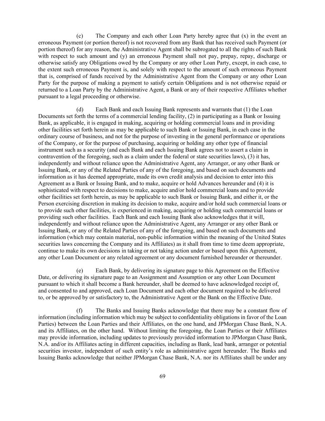 69 (c) The Company and each other Loan Party hereby agree that (x) in the event an erroneous Payment (or portion thereof) is not recovered from any Bank that has received such Payment (or portion thereof) for any reason, the Administrative Agent shall be subrogated to all the rights of such Bank with respect to such amount and (y) an erroneous Payment shall not pay, prepay, repay, discharge or otherwise satisfy any Obligations owed by the Company or any other Loan Party, except, in each case, to the extent such erroneous Payment is, and solely with respect to the amount of such erroneous Payment that is, comprised of funds received by the Administrative Agent from the Company or any other Loan Party for the purpose of making a payment to satisfy certain Obligations and is not otherwise repaid or returned to a Loan Party by the Administrative Agent, a Bank or any of their respective Affiliates whether pursuant to a legal proceeding or otherwise. (d) Each Bank and each Issuing Bank represents and warrants that (1) the Loan Documents set forth the terms of a commercial lending facility, (2) in participating as a Bank or Issuing Bank, as applicable, it is engaged in making, acquiring or holding commercial loans and in providing other facilities set forth herein as may be applicable to such Bank or Issuing Bank, in each case in the ordinary course of business, and not for the purpose of investing in the general performance or operations of the Company, or for the purpose of purchasing, acquiring or holding any other type of financial instrument such as a security (and each Bank and each Issuing Bank agrees not to assert a claim in contravention of the foregoing, such as a claim under the federal or state securities laws), (3) it has, independently and without reliance upon the Administrative Agent, any Arranger, or any other Bank or Issuing Bank, or any of the Related Parties of any of the foregoing, and based on such documents and information as it has deemed appropriate, made its own credit analysis and decision to enter into this Agreement as a Bank or Issuing Bank, and to make, acquire or hold Advances hereunder and (4) it is sophisticated with respect to decisions to make, acquire and/or hold commercial loans and to provide other facilities set forth herein, as may be applicable to such Bank or Issuing Bank, and either it, or the Person exercising discretion in making its decision to make, acquire and/or hold such commercial loans or to provide such other facilities, is experienced in making, acquiring or holding such commercial loans or providing such other facilities. Each Bank and each Issuing Bank also acknowledges that it will, independently and without reliance upon the Administrative Agent, any Arranger or any other Bank or Issuing Bank, or any of the Related Parties of any of the foregoing, and based on such documents and information (which may contain material, non-public information within the meaning of the United States securities laws concerning the Company and its Affiliates) as it shall from time to time deem appropriate, continue to make its own decisions in taking or not taking action under or based upon this Agreement, any other Loan Document or any related agreement or any document furnished hereunder or thereunder. (e) Each Bank, by delivering its signature page to this Agreement on the Effective Date, or delivering its signature page to an Assignment and Assumption or any other Loan Document pursuant to which it shall become a Bank hereunder, shall be deemed to have acknowledged receipt of, and consented to and approved, each Loan Document and each other document required to be delivered to, or be approved by or satisfactory to, the Administrative Agent or the Bank on the Effective Date. (f) The Banks and Issuing Banks acknowledge that there may be a constant flow of information (including information which may be subject to confidentiality obligations in favor of the Loan Parties) between the Loan Parties and their Affiliates, on the one hand, and JPMorgan Chase Bank, N.A. and its Affiliates, on the other hand. Without limiting the foregoing, the Loan Parties or their Affiliates may provide information, including updates to previously provided information to JPMorgan Chase Bank, N.A. and/or its Affiliates acting in different capacities, including as Bank, lead bank, arranger or potential securities investor, independent of such entity’s role as administrative agent hereunder. The Banks and Issuing Banks acknowledge that neither JPMorgan Chase Bank, N.A. nor its Affiliates shall be under any