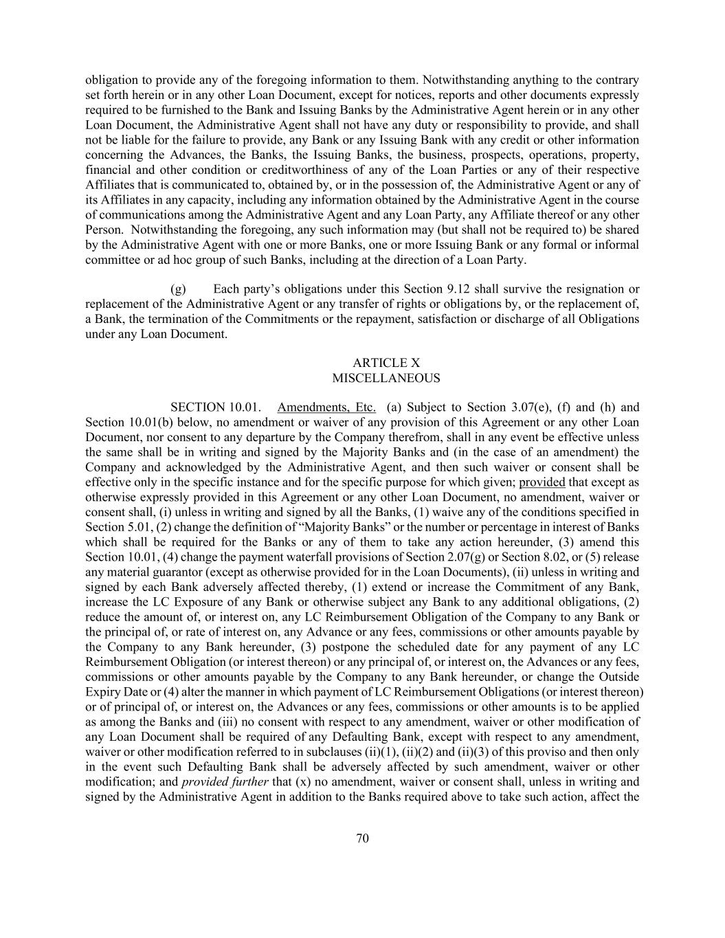 70 obligation to provide any of the foregoing information to them. Notwithstanding anything to the contrary set forth herein or in any other Loan Document, except for notices, reports and other documents expressly required to be furnished to the Bank and Issuing Banks by the Administrative Agent herein or in any other Loan Document, the Administrative Agent shall not have any duty or responsibility to provide, and shall not be liable for the failure to provide, any Bank or any Issuing Bank with any credit or other information concerning the Advances, the Banks, the Issuing Banks, the business, prospects, operations, property, financial and other condition or creditworthiness of any of the Loan Parties or any of their respective Affiliates that is communicated to, obtained by, or in the possession of, the Administrative Agent or any of its Affiliates in any capacity, including any information obtained by the Administrative Agent in the course of communications among the Administrative Agent and any Loan Party, any Affiliate thereof or any other Person. Notwithstanding the foregoing, any such information may (but shall not be required to) be shared by the Administrative Agent with one or more Banks, one or more Issuing Bank or any formal or informal committee or ad hoc group of such Banks, including at the direction of a Loan Party. (g) Each party’s obligations under this Section 9.12 shall survive the resignation or replacement of the Administrative Agent or any transfer of rights or obligations by, or the replacement of, a Bank, the termination of the Commitments or the repayment, satisfaction or discharge of all Obligations under any Loan Document. ARTICLE X MISCELLANEOUS SECTION 10.01. Amendments, Etc. (a) Subject to Section 3.07(e), (f) and (h) and Section 10.01(b) below, no amendment or waiver of any provision of this Agreement or any other Loan Document, nor consent to any departure by the Company therefrom, shall in any event be effective unless the same shall be in writing and signed by the Majority Banks and (in the case of an amendment) the Company and acknowledged by the Administrative Agent, and then such waiver or consent shall be effective only in the specific instance and for the specific purpose for which given; provided that except as otherwise expressly provided in this Agreement or any other Loan Document, no amendment, waiver or consent shall, (i) unless in writing and signed by all the Banks, (1) waive any of the conditions specified in Section 5.01, (2) change the definition of “Majority Banks” or the number or percentage in interest of Banks which shall be required for the Banks or any of them to take any action hereunder, (3) amend this Section 10.01, (4) change the payment waterfall provisions of Section 2.07(g) or Section 8.02, or (5) release any material guarantor (except as otherwise provided for in the Loan Documents), (ii) unless in writing and signed by each Bank adversely affected thereby, (1) extend or increase the Commitment of any Bank, increase the LC Exposure of any Bank or otherwise subject any Bank to any additional obligations, (2) reduce the amount of, or interest on, any LC Reimbursement Obligation of the Company to any Bank or the principal of, or rate of interest on, any Advance or any fees, commissions or other amounts payable by the Company to any Bank hereunder, (3) postpone the scheduled date for any payment of any LC Reimbursement Obligation (or interest thereon) or any principal of, or interest on, the Advances or any fees, commissions or other amounts payable by the Company to any Bank hereunder, or change the Outside Expiry Date or (4) alter the manner in which payment of LC Reimbursement Obligations (or interest thereon) or of principal of, or interest on, the Advances or any fees, commissions or other amounts is to be applied as among the Banks and (iii) no consent with respect to any amendment, waiver or other modification of any Loan Document shall be required of any Defaulting Bank, except with respect to any amendment, waiver or other modification referred to in subclauses (ii)(1), (ii)(2) and (ii)(3) of this proviso and then only in the event such Defaulting Bank shall be adversely affected by such amendment, waiver or other modification; and provided further that (x) no amendment, waiver or consent shall, unless in writing and signed by the Administrative Agent in addition to the Banks required above to take such action, affect the