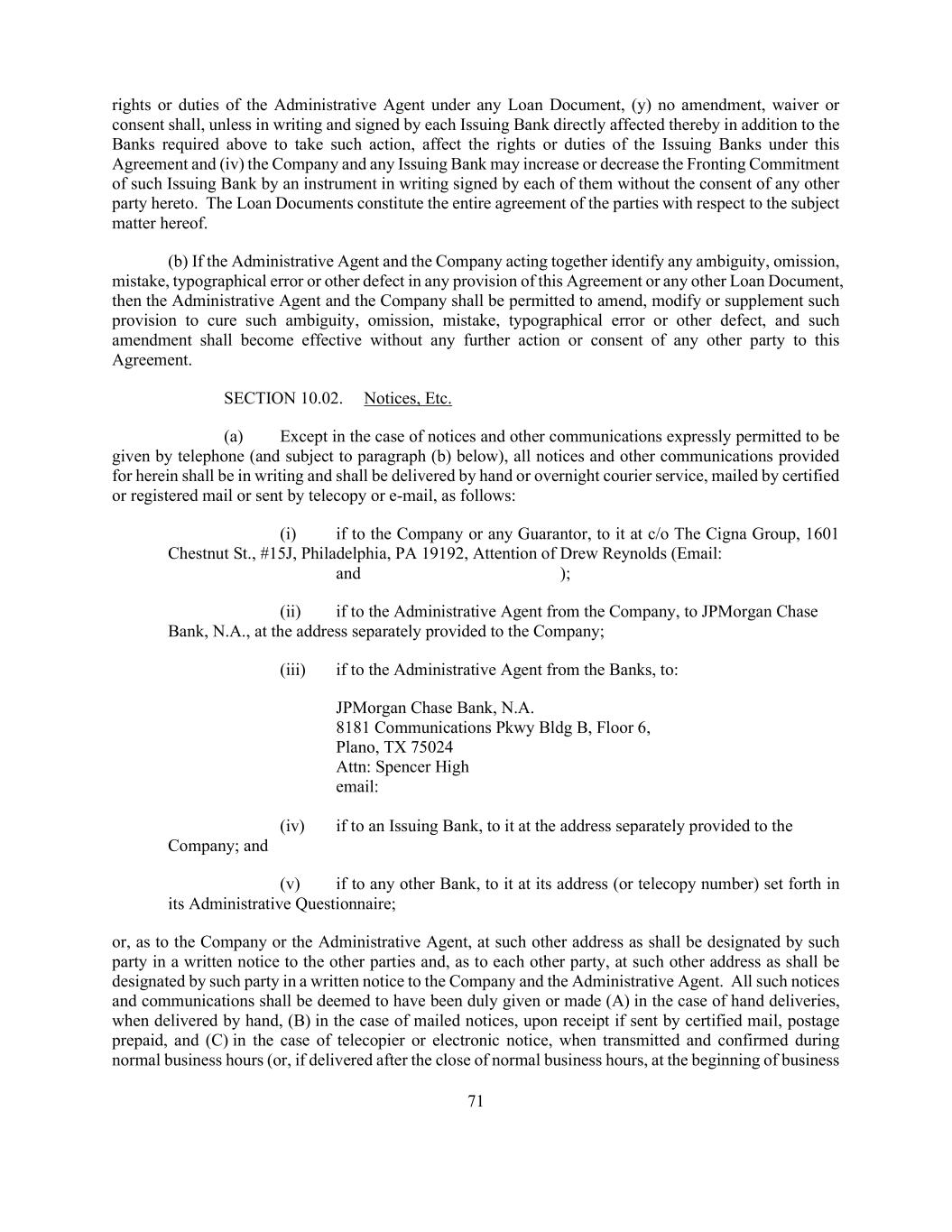71 rights or duties of the Administrative Agent under any Loan Document, (y) no amendment, waiver or consent shall, unless in writing and signed by each Issuing Bank directly affected thereby in addition to the Banks required above to take such action, affect the rights or duties of the Issuing Banks under this Agreement and (iv) the Company and any Issuing Bank may increase or decrease the Fronting Commitment of such Issuing Bank by an instrument in writing signed by each of them without the consent of any other party hereto. The Loan Documents constitute the entire agreement of the parties with respect to the subject matter hereof. (b) If the Administrative Agent and the Company acting together identify any ambiguity, omission, mistake, typographical error or other defect in any provision of this Agreement or any other Loan Document, then the Administrative Agent and the Company shall be permitted to amend, modify or supplement such provision to cure such ambiguity, omission, mistake, typographical error or other defect, and such amendment shall become effective without any further action or consent of any other party to this Agreement. SECTION 10.02. Notices, Etc. (a) Except in the case of notices and other communications expressly permitted to be given by telephone (and subject to paragraph (b) below), all notices and other communications provided for herein shall be in writing and shall be delivered by hand or overnight courier service, mailed by certified or registered mail or sent by telecopy or e-mail, as follows: (i) if to the Company or any Guarantor, to it at c/o The Cigna Group, 1601 Chestnut St., #15J, Philadelphia, PA 19192, Attention of Drew Reynolds (Email: and ); (ii) if to the Administrative Agent from the Company, to JPMorgan Chase Bank, N.A., at the address separately provided to the Company; (iii) if to the Administrative Agent from the Banks, to: JPMorgan Chase Bank, N.A. 8181 Communications Pkwy Bldg B, Floor 6, Plano, TX 75024 Attn: Spencer High email: (iv) if to an Issuing Bank, to it at the address separately provided to the Company; and (v) if to any other Bank, to it at its address (or telecopy number) set forth in its Administrative Questionnaire; or, as to the Company or the Administrative Agent, at such other address as shall be designated by such party in a written notice to the other parties and, as to each other party, at such other address as shall be designated by such party in a written notice to the Company and the Administrative Agent. All such notices and communications shall be deemed to have been duly given or made (A) in the case of hand deliveries, when delivered by hand, (B) in the case of mailed notices, upon receipt if sent by certified mail, postage prepaid, and (C) in the case of telecopier or electronic notice, when transmitted and confirmed during normal business hours (or, if delivered after the close of normal business hours, at the beginning of business