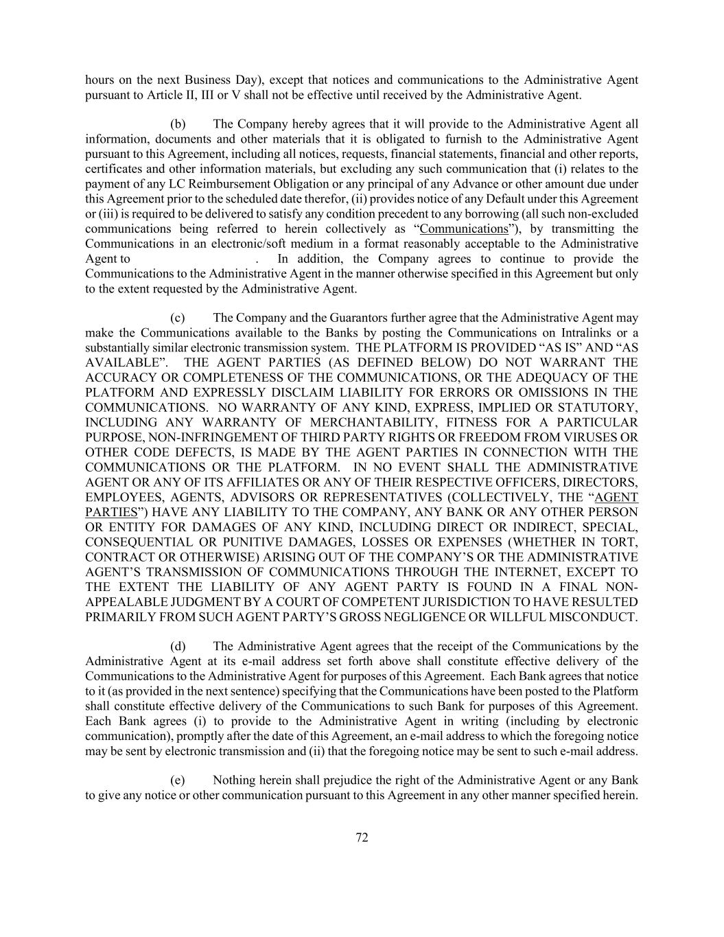 72 hours on the next Business Day), except that notices and communications to the Administrative Agent pursuant to Article II, III or V shall not be effective until received by the Administrative Agent. (b) The Company hereby agrees that it will provide to the Administrative Agent all information, documents and other materials that it is obligated to furnish to the Administrative Agent pursuant to this Agreement, including all notices, requests, financial statements, financial and other reports, certificates and other information materials, but excluding any such communication that (i) relates to the payment of any LC Reimbursement Obligation or any principal of any Advance or other amount due under this Agreement prior to the scheduled date therefor, (ii) provides notice of any Default under this Agreement or (iii) is required to be delivered to satisfy any condition precedent to any borrowing (all such non-excluded communications being referred to herein collectively as “Communications”), by transmitting the Communications in an electronic/soft medium in a format reasonably acceptable to the Administrative Agent to . In addition, the Company agrees to continue to provide the Communications to the Administrative Agent in the manner otherwise specified in this Agreement but only to the extent requested by the Administrative Agent. (c) The Company and the Guarantors further agree that the Administrative Agent may make the Communications available to the Banks by posting the Communications on Intralinks or a substantially similar electronic transmission system. THE PLATFORM IS PROVIDED “AS IS” AND “AS AVAILABLE”. THE AGENT PARTIES (AS DEFINED BELOW) DO NOT WARRANT THE ACCURACY OR COMPLETENESS OF THE COMMUNICATIONS, OR THE ADEQUACY OF THE PLATFORM AND EXPRESSLY DISCLAIM LIABILITY FOR ERRORS OR OMISSIONS IN THE COMMUNICATIONS. NO WARRANTY OF ANY KIND, EXPRESS, IMPLIED OR STATUTORY, INCLUDING ANY WARRANTY OF MERCHANTABILITY, FITNESS FOR A PARTICULAR PURPOSE, NON-INFRINGEMENT OF THIRD PARTY RIGHTS OR FREEDOM FROM VIRUSES OR OTHER CODE DEFECTS, IS MADE BY THE AGENT PARTIES IN CONNECTION WITH THE COMMUNICATIONS OR THE PLATFORM. IN NO EVENT SHALL THE ADMINISTRATIVE AGENT OR ANY OF ITS AFFILIATES OR ANY OF THEIR RESPECTIVE OFFICERS, DIRECTORS, EMPLOYEES, AGENTS, ADVISORS OR REPRESENTATIVES (COLLECTIVELY, THE “AGENT PARTIES”) HAVE ANY LIABILITY TO THE COMPANY, ANY BANK OR ANY OTHER PERSON OR ENTITY FOR DAMAGES OF ANY KIND, INCLUDING DIRECT OR INDIRECT, SPECIAL, CONSEQUENTIAL OR PUNITIVE DAMAGES, LOSSES OR EXPENSES (WHETHER IN TORT, CONTRACT OR OTHERWISE) ARISING OUT OF THE COMPANY’S OR THE ADMINISTRATIVE AGENT’S TRANSMISSION OF COMMUNICATIONS THROUGH THE INTERNET, EXCEPT TO THE EXTENT THE LIABILITY OF ANY AGENT PARTY IS FOUND IN A FINAL NON- APPEALABLE JUDGMENT BY A COURT OF COMPETENT JURISDICTION TO HAVE RESULTED PRIMARILY FROM SUCH AGENT PARTY’S GROSS NEGLIGENCE OR WILLFUL MISCONDUCT. (d) The Administrative Agent agrees that the receipt of the Communications by the Administrative Agent at its e-mail address set forth above shall constitute effective delivery of the Communications to the Administrative Agent for purposes of this Agreement. Each Bank agrees that notice to it (as provided in the next sentence) specifying that the Communications have been posted to the Platform shall constitute effective delivery of the Communications to such Bank for purposes of this Agreement. Each Bank agrees (i) to provide to the Administrative Agent in writing (including by electronic communication), promptly after the date of this Agreement, an e-mail address to which the foregoing notice may be sent by electronic transmission and (ii) that the foregoing notice may be sent to such e-mail address. (e) Nothing herein shall prejudice the right of the Administrative Agent or any Bank to give any notice or other communication pursuant to this Agreement in any other manner specified herein.