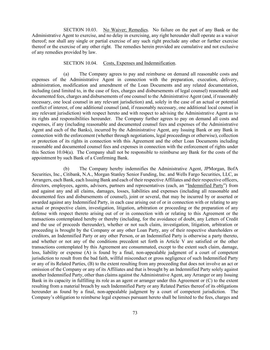 73 SECTION 10.03. No Waiver; Remedies. No failure on the part of any Bank or the Administrative Agent to exercise, and no delay in exercising, any right hereunder shall operate as a waiver thereof; nor shall any single or partial exercise of any such right preclude any other or further exercise thereof or the exercise of any other right. The remedies herein provided are cumulative and not exclusive of any remedies provided by law. SECTION 10.04. Costs, Expenses and Indemnification. (a) The Company agrees to pay and reimburse on demand all reasonable costs and expenses of the Administrative Agent in connection with the preparation, execution, delivery, administration, modification and amendment of the Loan Documents and any related documentation, including (and limited to, in the case of fees, charges and disbursements of legal counsel) reasonable and documented fees, charges and disbursements of one counsel to the Administrative Agent (and, if reasonably necessary, one local counsel in any relevant jurisdiction) and, solely in the case of an actual or potential conflict of interest, of one additional counsel (and, if reasonably necessary, one additional local counsel in any relevant jurisdiction) with respect hereto and with respect to advising the Administrative Agent as to its rights and responsibilities hereunder. The Company further agrees to pay on demand all costs and expenses, if any (including reasonable and documented counsel fees and expenses of the Administrative Agent and each of the Banks), incurred by the Administrative Agent, any Issuing Bank or any Bank in connection with the enforcement (whether through negotiations, legal proceedings or otherwise), collection or protection of its rights in connection with this Agreement and the other Loan Documents including reasonable and documented counsel fees and expenses in connection with the enforcement of rights under this Section 10.04(a). The Company shall not be responsible to reimburse any Bank for the costs of the appointment by such Bank of a Confirming Bank. (b) The Company hereby indemnifies the Administrative Agent, JPMorgan, BofA Securities, Inc., Citibank, N.A., Morgan Stanley Senior Funding, Inc. and Wells Fargo Securities, LLC, as Arrangers, each Bank, each Issuing Bank and each of their respective Affiliates and their respective officers, directors, employees, agents, advisors, partners and representatives (each, an “Indemnified Party”) from and against any and all claims, damages, losses, liabilities and expenses (including all reasonable and documented fees and disbursements of counsel), joint or several, that may be incurred by or asserted or awarded against any Indemnified Party, in each case arising out of or in connection with or relating to any actual or prospective claim, investigation, litigation, arbitration or proceeding or the preparation of any defense with respect thereto arising out of or in connection with or relating to this Agreement or the transactions contemplated hereby or thereby (including, for the avoidance of doubt, any Letters of Credit and the use of proceeds thereunder), whether or not such claim, investigation, litigation, arbitration or proceeding is brought by the Company or any other Loan Party, any of their respective shareholders or creditors, an Indemnified Party or any other Person, or an Indemnified Party is otherwise a party thereto, and whether or not any of the conditions precedent set forth in Article V are satisfied or the other transactions contemplated by this Agreement are consummated, except to the extent such claim, damage, loss, liability or expense (A) is found by a final, non-appealable judgment of a court of competent jurisdiction to result from the bad faith, willful misconduct or gross negligence of such Indemnified Party or any of its Related Parties, (B) to the extent resulting from any proceeding that does not involve an act or omission of the Company or any of its Affiliates and that is brought by an Indemnified Party solely against another Indemnified Party, other than claims against the Administrative Agent, any Arranger or any Issuing Bank in its capacity in fulfilling its role as an agent or arranger under this Agreement or (C) to the extent resulting from a material breach by such Indemnified Party or any Related Parties thereof of its obligations hereunder as found by a final, non-appealable judgment by a court of competent jurisdiction. The Company’s obligation to reimburse legal expenses pursuant hereto shall be limited to the fees, charges and