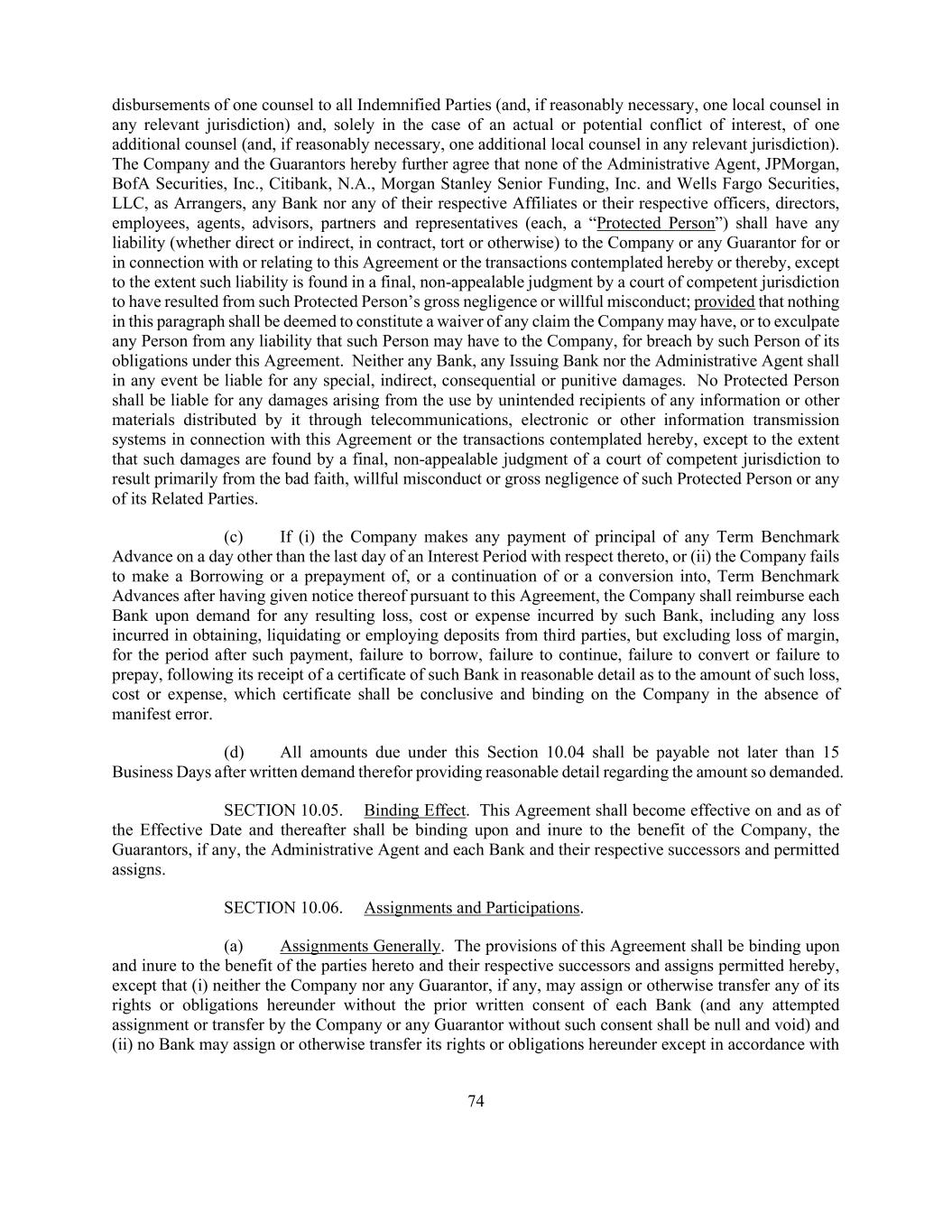 74 disbursements of one counsel to all Indemnified Parties (and, if reasonably necessary, one local counsel in any relevant jurisdiction) and, solely in the case of an actual or potential conflict of interest, of one additional counsel (and, if reasonably necessary, one additional local counsel in any relevant jurisdiction). The Company and the Guarantors hereby further agree that none of the Administrative Agent, JPMorgan, BofA Securities, Inc., Citibank, N.A., Morgan Stanley Senior Funding, Inc. and Wells Fargo Securities, LLC, as Arrangers, any Bank nor any of their respective Affiliates or their respective officers, directors, employees, agents, advisors, partners and representatives (each, a “Protected Person”) shall have any liability (whether direct or indirect, in contract, tort or otherwise) to the Company or any Guarantor for or in connection with or relating to this Agreement or the transactions contemplated hereby or thereby, except to the extent such liability is found in a final, non-appealable judgment by a court of competent jurisdiction to have resulted from such Protected Person’s gross negligence or willful misconduct; provided that nothing in this paragraph shall be deemed to constitute a waiver of any claim the Company may have, or to exculpate any Person from any liability that such Person may have to the Company, for breach by such Person of its obligations under this Agreement. Neither any Bank, any Issuing Bank nor the Administrative Agent shall in any event be liable for any special, indirect, consequential or punitive damages. No Protected Person shall be liable for any damages arising from the use by unintended recipients of any information or other materials distributed by it through telecommunications, electronic or other information transmission systems in connection with this Agreement or the transactions contemplated hereby, except to the extent that such damages are found by a final, non-appealable judgment of a court of competent jurisdiction to result primarily from the bad faith, willful misconduct or gross negligence of such Protected Person or any of its Related Parties. (c) If (i) the Company makes any payment of principal of any Term Benchmark Advance on a day other than the last day of an Interest Period with respect thereto, or (ii) the Company fails to make a Borrowing or a prepayment of, or a continuation of or a conversion into, Term Benchmark Advances after having given notice thereof pursuant to this Agreement, the Company shall reimburse each Bank upon demand for any resulting loss, cost or expense incurred by such Bank, including any loss incurred in obtaining, liquidating or employing deposits from third parties, but excluding loss of margin, for the period after such payment, failure to borrow, failure to continue, failure to convert or failure to prepay, following its receipt of a certificate of such Bank in reasonable detail as to the amount of such loss, cost or expense, which certificate shall be conclusive and binding on the Company in the absence of manifest error. (d) All amounts due under this Section 10.04 shall be payable not later than 15 Business Days after written demand therefor providing reasonable detail regarding the amount so demanded. SECTION 10.05. Binding Effect. This Agreement shall become effective on and as of the Effective Date and thereafter shall be binding upon and inure to the benefit of the Company, the Guarantors, if any, the Administrative Agent and each Bank and their respective successors and permitted assigns. SECTION 10.06. Assignments and Participations. (a) Assignments Generally. The provisions of this Agreement shall be binding upon and inure to the benefit of the parties hereto and their respective successors and assigns permitted hereby, except that (i) neither the Company nor any Guarantor, if any, may assign or otherwise transfer any of its rights or obligations hereunder without the prior written consent of each Bank (and any attempted assignment or transfer by the Company or any Guarantor without such consent shall be null and void) and (ii) no Bank may assign or otherwise transfer its rights or obligations hereunder except in accordance with