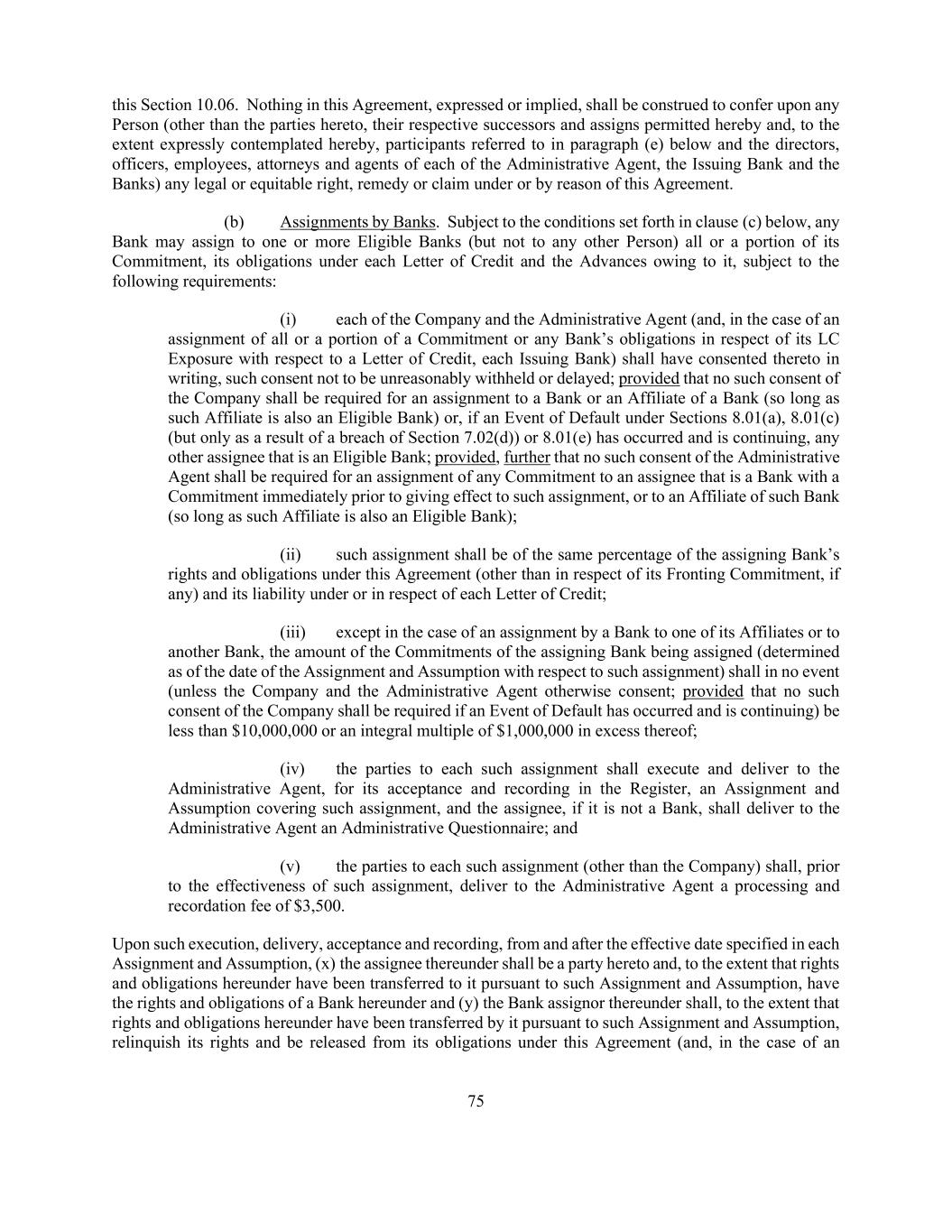 75 this Section 10.06. Nothing in this Agreement, expressed or implied, shall be construed to confer upon any Person (other than the parties hereto, their respective successors and assigns permitted hereby and, to the extent expressly contemplated hereby, participants referred to in paragraph (e) below and the directors, officers, employees, attorneys and agents of each of the Administrative Agent, the Issuing Bank and the Banks) any legal or equitable right, remedy or claim under or by reason of this Agreement. (b) Assignments by Banks. Subject to the conditions set forth in clause (c) below, any Bank may assign to one or more Eligible Banks (but not to any other Person) all or a portion of its Commitment, its obligations under each Letter of Credit and the Advances owing to it, subject to the following requirements: (i) each of the Company and the Administrative Agent (and, in the case of an assignment of all or a portion of a Commitment or any Bank’s obligations in respect of its LC Exposure with respect to a Letter of Credit, each Issuing Bank) shall have consented thereto in writing, such consent not to be unreasonably withheld or delayed; provided that no such consent of the Company shall be required for an assignment to a Bank or an Affiliate of a Bank (so long as such Affiliate is also an Eligible Bank) or, if an Event of Default under Sections 8.01(a), 8.01(c) (but only as a result of a breach of Section 7.02(d)) or 8.01(e) has occurred and is continuing, any other assignee that is an Eligible Bank; provided, further that no such consent of the Administrative Agent shall be required for an assignment of any Commitment to an assignee that is a Bank with a Commitment immediately prior to giving effect to such assignment, or to an Affiliate of such Bank (so long as such Affiliate is also an Eligible Bank); (ii) such assignment shall be of the same percentage of the assigning Bank’s rights and obligations under this Agreement (other than in respect of its Fronting Commitment, if any) and its liability under or in respect of each Letter of Credit; (iii) except in the case of an assignment by a Bank to one of its Affiliates or to another Bank, the amount of the Commitments of the assigning Bank being assigned (determined as of the date of the Assignment and Assumption with respect to such assignment) shall in no event (unless the Company and the Administrative Agent otherwise consent; provided that no such consent of the Company shall be required if an Event of Default has occurred and is continuing) be less than $10,000,000 or an integral multiple of $1,000,000 in excess thereof; (iv) the parties to each such assignment shall execute and deliver to the Administrative Agent, for its acceptance and recording in the Register, an Assignment and Assumption covering such assignment, and the assignee, if it is not a Bank, shall deliver to the Administrative Agent an Administrative Questionnaire; and (v) the parties to each such assignment (other than the Company) shall, prior to the effectiveness of such assignment, deliver to the Administrative Agent a processing and recordation fee of $3,500. Upon such execution, delivery, acceptance and recording, from and after the effective date specified in each Assignment and Assumption, (x) the assignee thereunder shall be a party hereto and, to the extent that rights and obligations hereunder have been transferred to it pursuant to such Assignment and Assumption, have the rights and obligations of a Bank hereunder and (y) the Bank assignor thereunder shall, to the extent that rights and obligations hereunder have been transferred by it pursuant to such Assignment and Assumption, relinquish its rights and be released from its obligations under this Agreement (and, in the case of an
