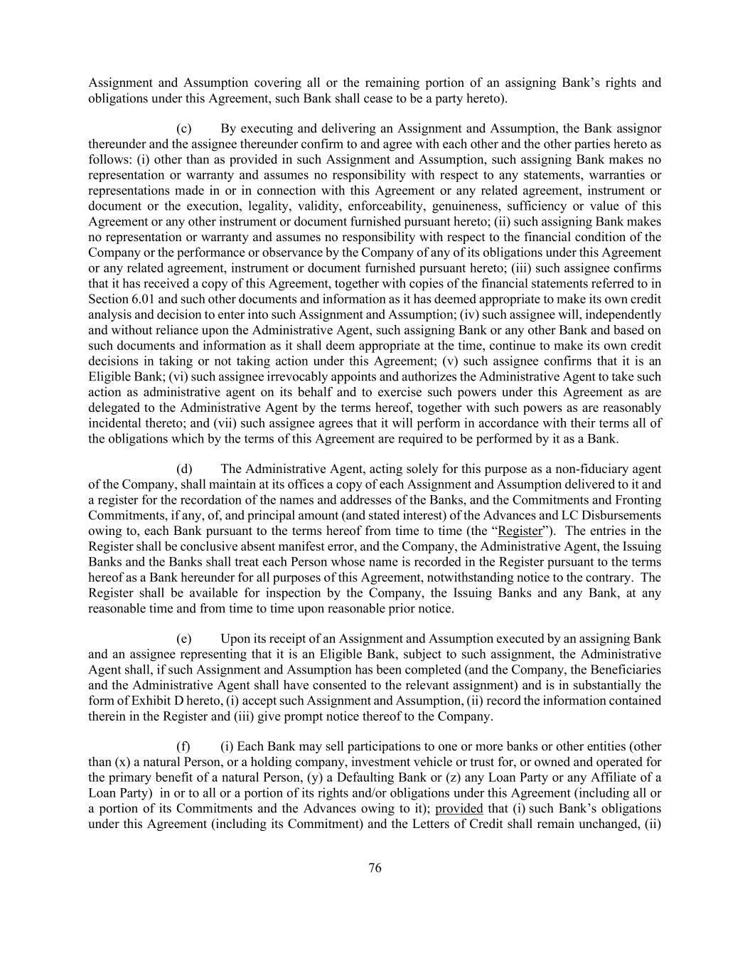 76 Assignment and Assumption covering all or the remaining portion of an assigning Bank’s rights and obligations under this Agreement, such Bank shall cease to be a party hereto). (c) By executing and delivering an Assignment and Assumption, the Bank assignor thereunder and the assignee thereunder confirm to and agree with each other and the other parties hereto as follows: (i) other than as provided in such Assignment and Assumption, such assigning Bank makes no representation or warranty and assumes no responsibility with respect to any statements, warranties or representations made in or in connection with this Agreement or any related agreement, instrument or document or the execution, legality, validity, enforceability, genuineness, sufficiency or value of this Agreement or any other instrument or document furnished pursuant hereto; (ii) such assigning Bank makes no representation or warranty and assumes no responsibility with respect to the financial condition of the Company or the performance or observance by the Company of any of its obligations under this Agreement or any related agreement, instrument or document furnished pursuant hereto; (iii) such assignee confirms that it has received a copy of this Agreement, together with copies of the financial statements referred to in Section 6.01 and such other documents and information as it has deemed appropriate to make its own credit analysis and decision to enter into such Assignment and Assumption; (iv) such assignee will, independently and without reliance upon the Administrative Agent, such assigning Bank or any other Bank and based on such documents and information as it shall deem appropriate at the time, continue to make its own credit decisions in taking or not taking action under this Agreement; (v) such assignee confirms that it is an Eligible Bank; (vi) such assignee irrevocably appoints and authorizes the Administrative Agent to take such action as administrative agent on its behalf and to exercise such powers under this Agreement as are delegated to the Administrative Agent by the terms hereof, together with such powers as are reasonably incidental thereto; and (vii) such assignee agrees that it will perform in accordance with their terms all of the obligations which by the terms of this Agreement are required to be performed by it as a Bank. (d) The Administrative Agent, acting solely for this purpose as a non-fiduciary agent of the Company, shall maintain at its offices a copy of each Assignment and Assumption delivered to it and a register for the recordation of the names and addresses of the Banks, and the Commitments and Fronting Commitments, if any, of, and principal amount (and stated interest) of the Advances and LC Disbursements owing to, each Bank pursuant to the terms hereof from time to time (the “Register”). The entries in the Register shall be conclusive absent manifest error, and the Company, the Administrative Agent, the Issuing Banks and the Banks shall treat each Person whose name is recorded in the Register pursuant to the terms hereof as a Bank hereunder for all purposes of this Agreement, notwithstanding notice to the contrary. The Register shall be available for inspection by the Company, the Issuing Banks and any Bank, at any reasonable time and from time to time upon reasonable prior notice. (e) Upon its receipt of an Assignment and Assumption executed by an assigning Bank and an assignee representing that it is an Eligible Bank, subject to such assignment, the Administrative Agent shall, if such Assignment and Assumption has been completed (and the Company, the Beneficiaries and the Administrative Agent shall have consented to the relevant assignment) and is in substantially the form of Exhibit D hereto, (i) accept such Assignment and Assumption, (ii) record the information contained therein in the Register and (iii) give prompt notice thereof to the Company. (f) (i) Each Bank may sell participations to one or more banks or other entities (other than (x) a natural Person, or a holding company, investment vehicle or trust for, or owned and operated for the primary benefit of a natural Person, (y) a Defaulting Bank or (z) any Loan Party or any Affiliate of a Loan Party) in or to all or a portion of its rights and/or obligations under this Agreement (including all or a portion of its Commitments and the Advances owing to it); provided that (i) such Bank’s obligations under this Agreement (including its Commitment) and the Letters of Credit shall remain unchanged, (ii)