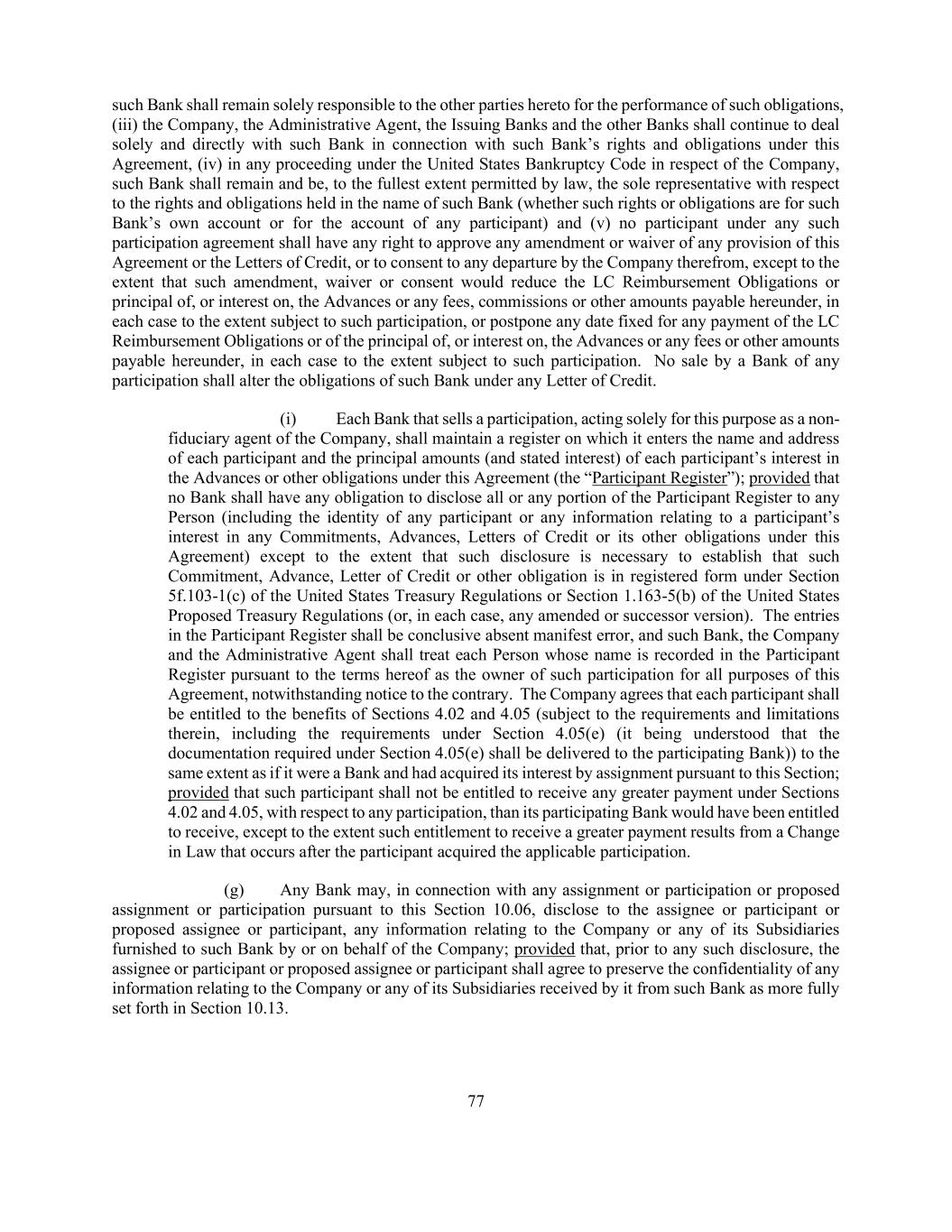 77 such Bank shall remain solely responsible to the other parties hereto for the performance of such obligations, (iii) the Company, the Administrative Agent, the Issuing Banks and the other Banks shall continue to deal solely and directly with such Bank in connection with such Bank’s rights and obligations under this Agreement, (iv) in any proceeding under the United States Bankruptcy Code in respect of the Company, such Bank shall remain and be, to the fullest extent permitted by law, the sole representative with respect to the rights and obligations held in the name of such Bank (whether such rights or obligations are for such Bank’s own account or for the account of any participant) and (v) no participant under any such participation agreement shall have any right to approve any amendment or waiver of any provision of this Agreement or the Letters of Credit, or to consent to any departure by the Company therefrom, except to the extent that such amendment, waiver or consent would reduce the LC Reimbursement Obligations or principal of, or interest on, the Advances or any fees, commissions or other amounts payable hereunder, in each case to the extent subject to such participation, or postpone any date fixed for any payment of the LC Reimbursement Obligations or of the principal of, or interest on, the Advances or any fees or other amounts payable hereunder, in each case to the extent subject to such participation. No sale by a Bank of any participation shall alter the obligations of such Bank under any Letter of Credit. (i) Each Bank that sells a participation, acting solely for this purpose as a non- fiduciary agent of the Company, shall maintain a register on which it enters the name and address of each participant and the principal amounts (and stated interest) of each participant’s interest in the Advances or other obligations under this Agreement (the “Participant Register”); provided that no Bank shall have any obligation to disclose all or any portion of the Participant Register to any Person (including the identity of any participant or any information relating to a participant’s interest in any Commitments, Advances, Letters of Credit or its other obligations under this Agreement) except to the extent that such disclosure is necessary to establish that such Commitment, Advance, Letter of Credit or other obligation is in registered form under Section 5f.103-1(c) of the United States Treasury Regulations or Section 1.163-5(b) of the United States Proposed Treasury Regulations (or, in each case, any amended or successor version). The entries in the Participant Register shall be conclusive absent manifest error, and such Bank, the Company and the Administrative Agent shall treat each Person whose name is recorded in the Participant Register pursuant to the terms hereof as the owner of such participation for all purposes of this Agreement, notwithstanding notice to the contrary. The Company agrees that each participant shall be entitled to the benefits of Sections 4.02 and 4.05 (subject to the requirements and limitations therein, including the requirements under Section 4.05(e) (it being understood that the documentation required under Section 4.05(e) shall be delivered to the participating Bank)) to the same extent as if it were a Bank and had acquired its interest by assignment pursuant to this Section; provided that such participant shall not be entitled to receive any greater payment under Sections 4.02 and 4.05, with respect to any participation, than its participating Bank would have been entitled to receive, except to the extent such entitlement to receive a greater payment results from a Change in Law that occurs after the participant acquired the applicable participation. (g) Any Bank may, in connection with any assignment or participation or proposed assignment or participation pursuant to this Section 10.06, disclose to the assignee or participant or proposed assignee or participant, any information relating to the Company or any of its Subsidiaries furnished to such Bank by or on behalf of the Company; provided that, prior to any such disclosure, the assignee or participant or proposed assignee or participant shall agree to preserve the confidentiality of any information relating to the Company or any of its Subsidiaries received by it from such Bank as more fully set forth in Section 10.13.